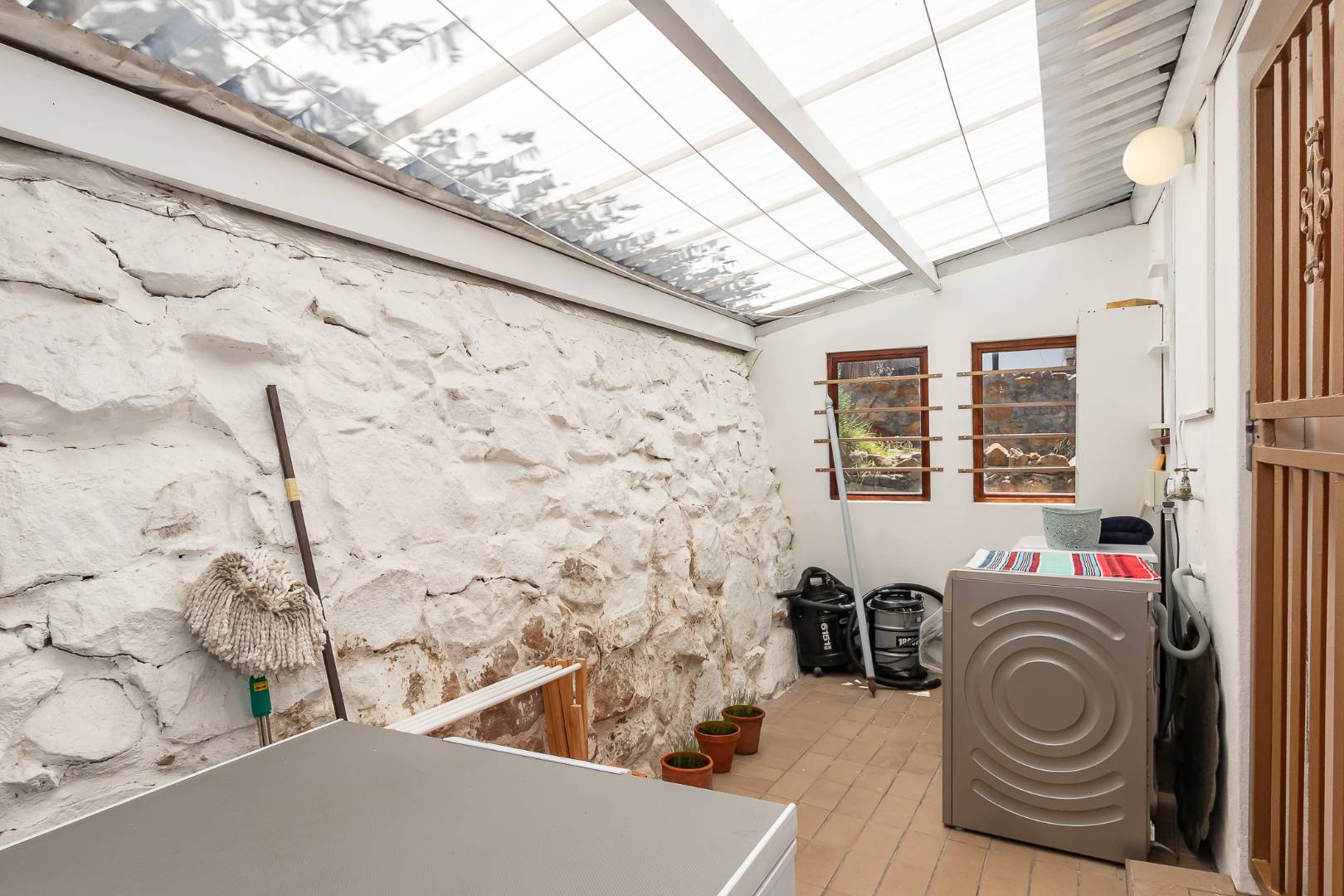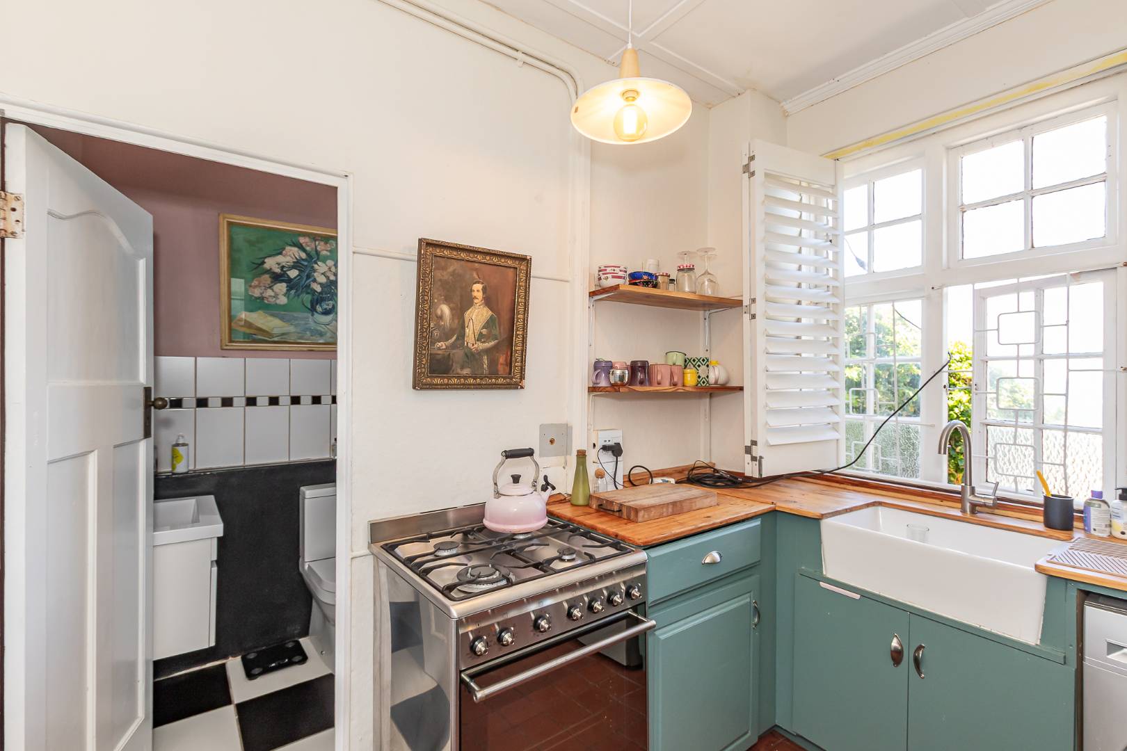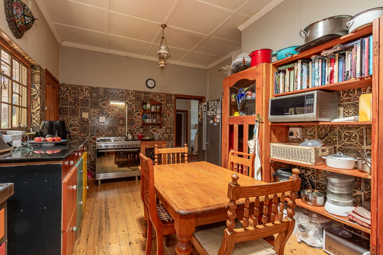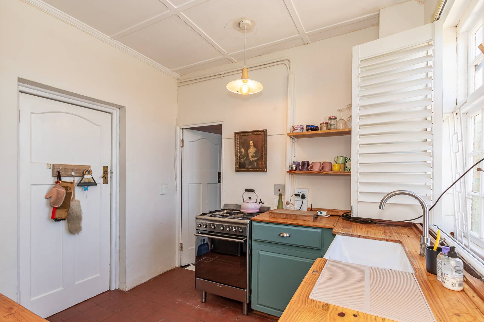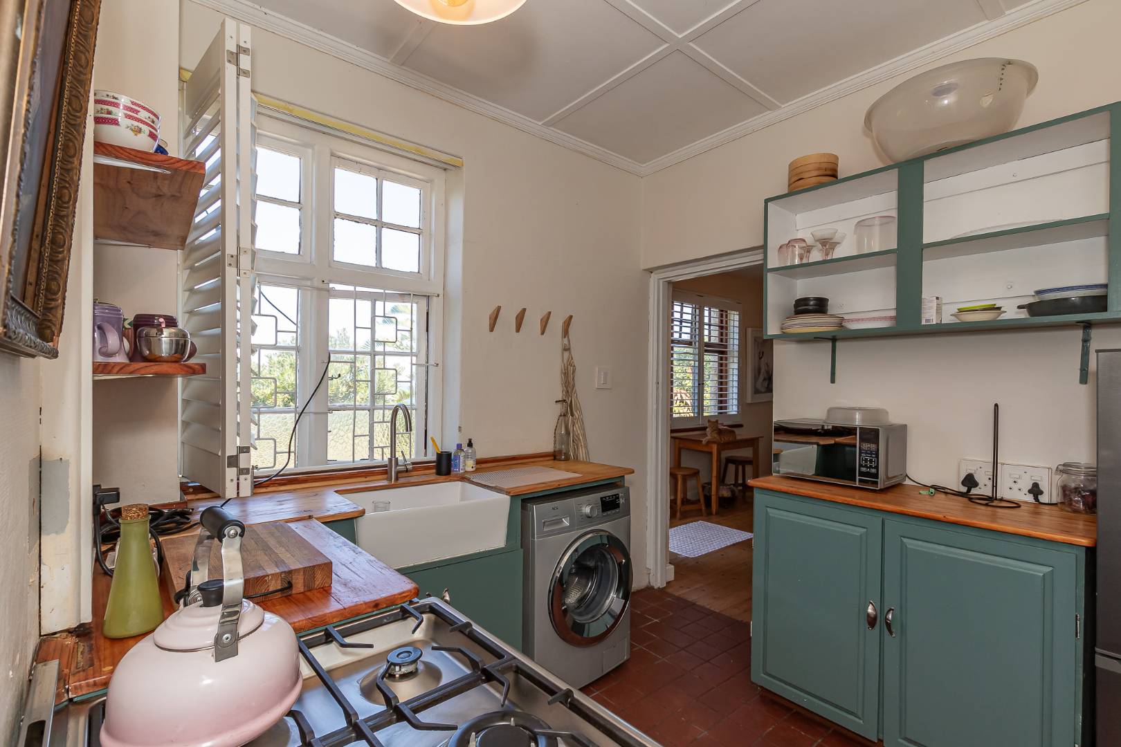 Farm style kitchen with 6 burners gas hob and electrical oven. There is a washing machine point.
