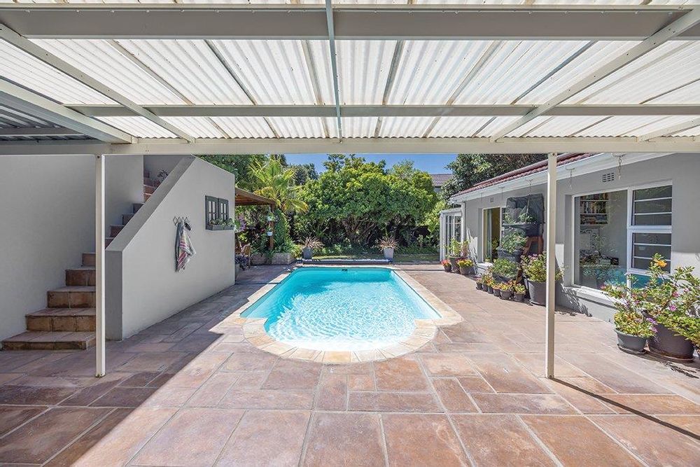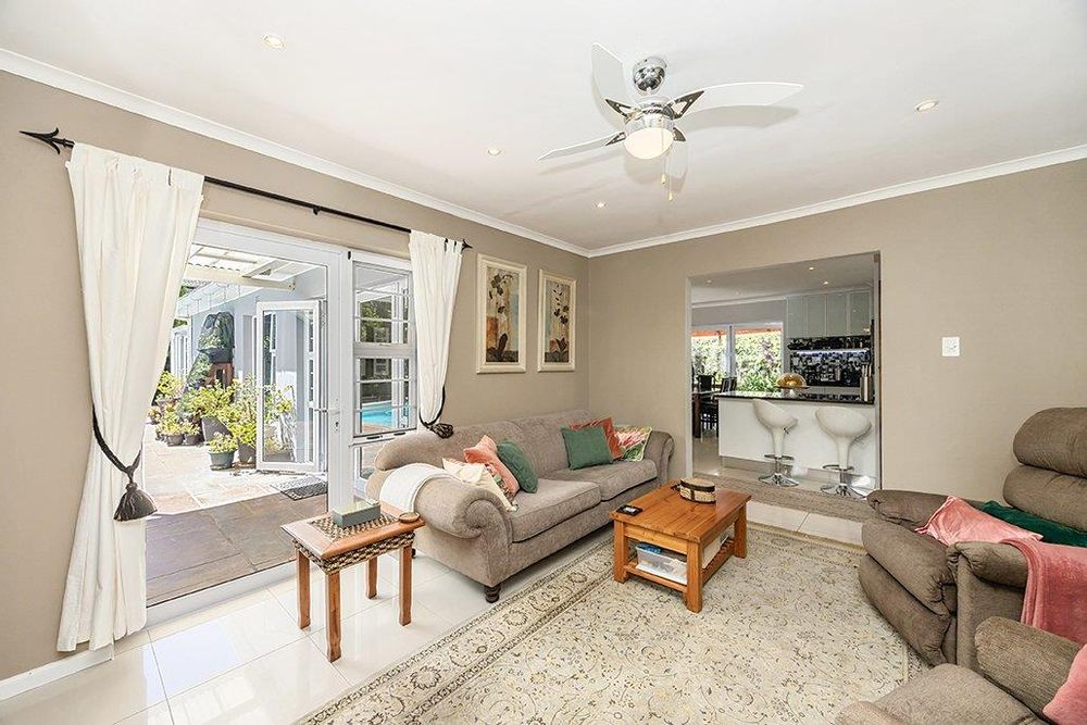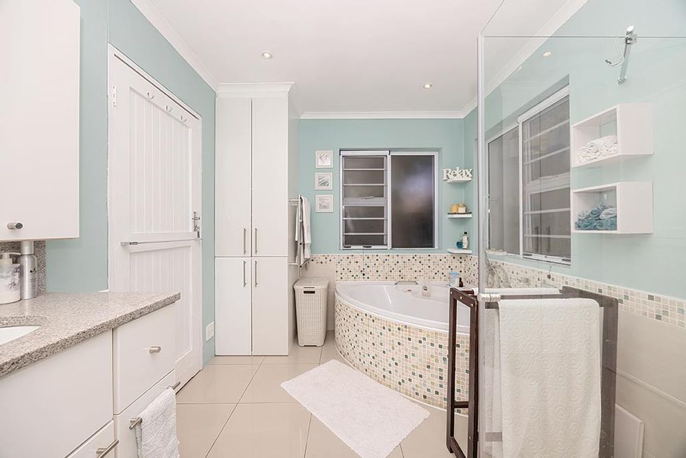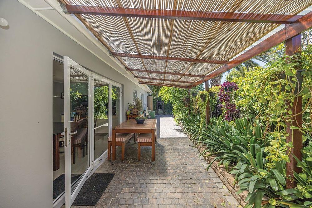 Outside, the home is an entertainer's dream with a heated pool, perfect for year-round enjoyment. The property is self-sufficient with solar panels, an inverter, a borehole, and a JoJo tank for water storage. The sprinkler system ensures the beautifully landscaped garden remains lush and vibrant. For added convenience, there is a spacious garage that accommodates up to four cars, alongside a practical storeroom for extra storage space.