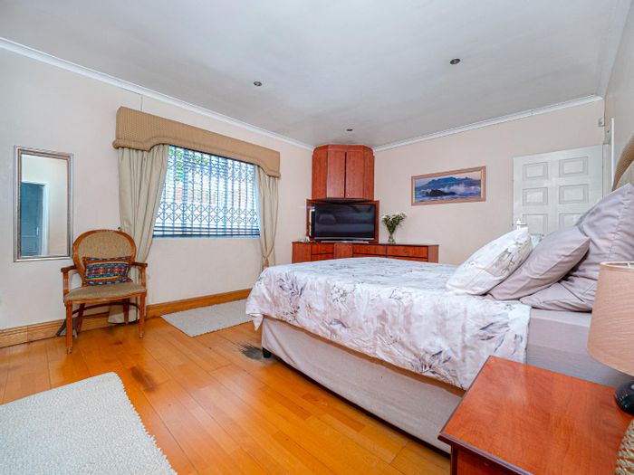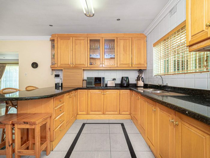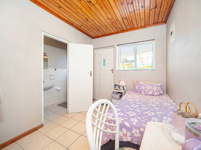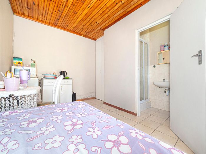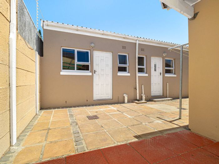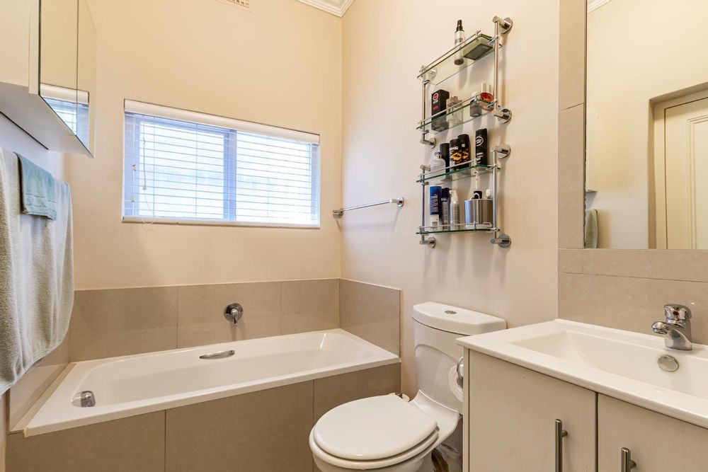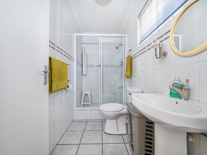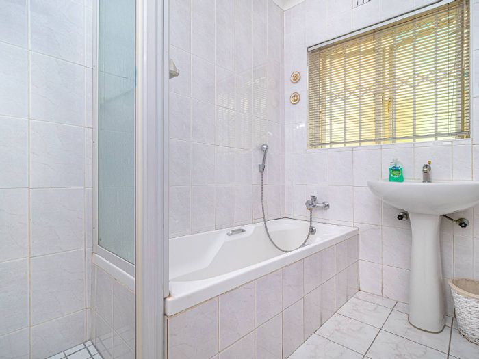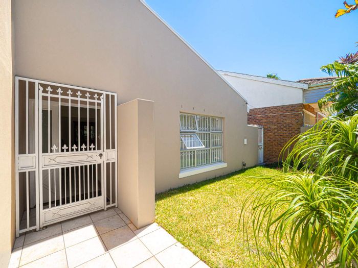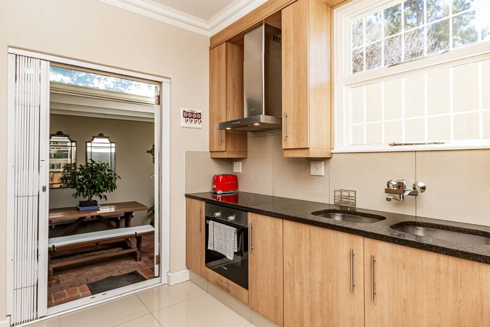 This pristine house comprises 2 bedrooms, 1 bathroom, small office/study space, lounge/dining area, modern open plan kitchen with granite kitchen tops, glass top stove with oven, and a neatly enclosed cupboard space for a washing machine and tumble dryer. The kitchen has double doors leading out onto a totally private undercover entertainment patio/conservatory providing a peaceful retreat. Access this smaller home from the street level onto a brickpaved courtyard with security doors leading into a tiled entrance hall. This property offers excellent security viz security doors, burglar alarm and outside beams.