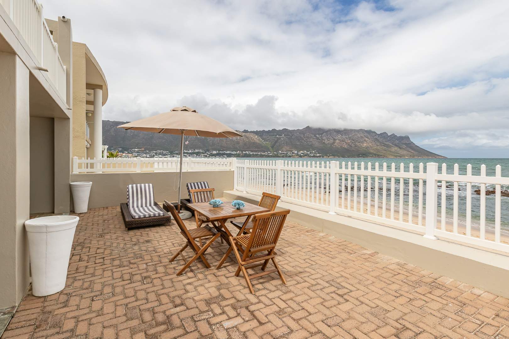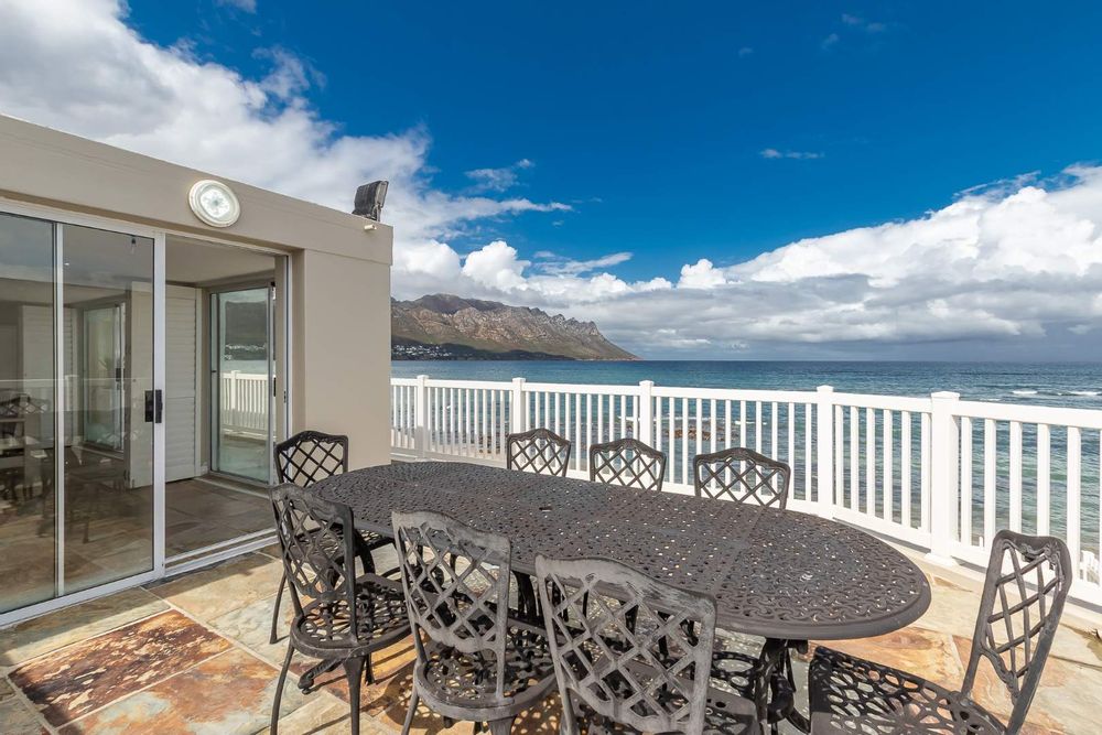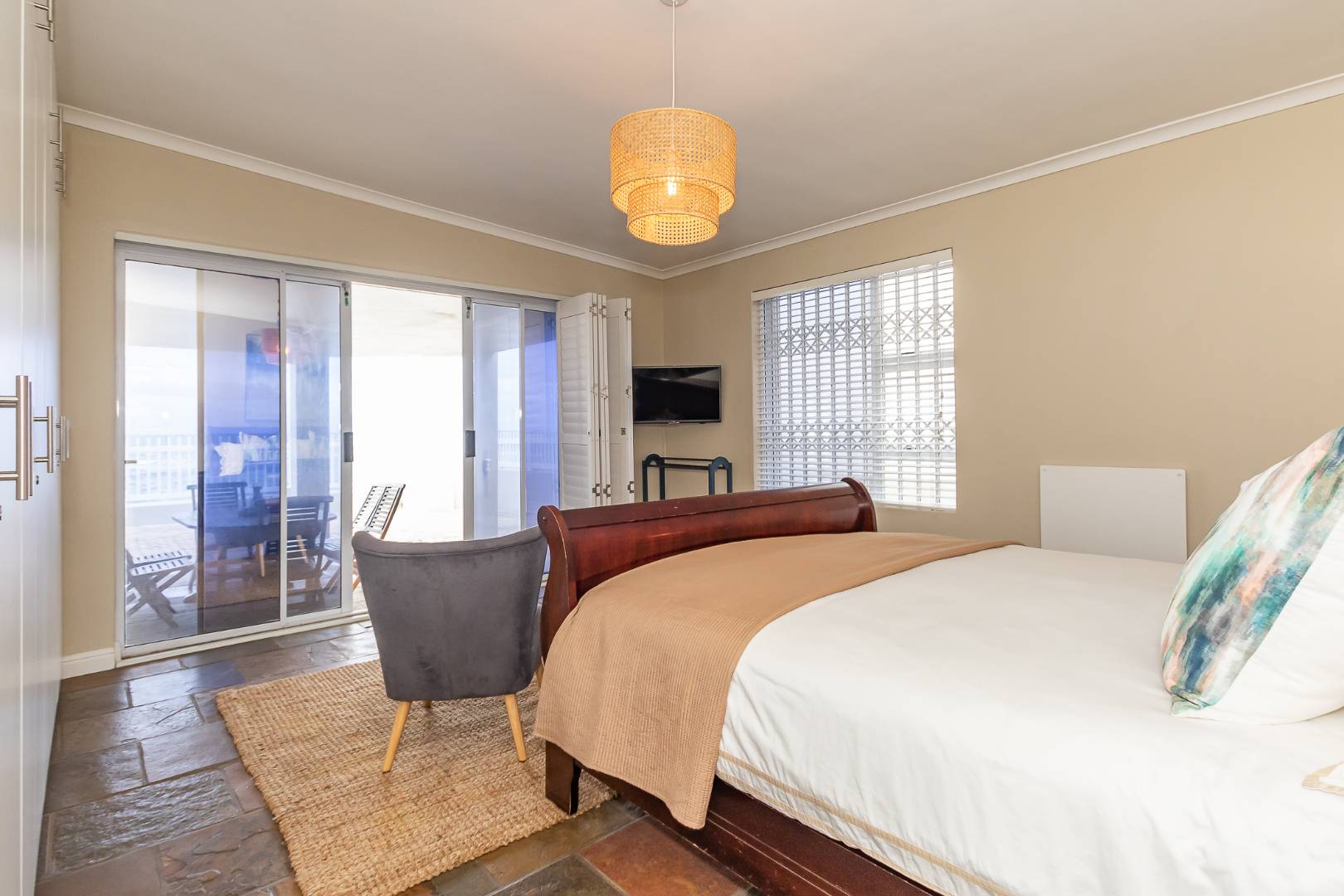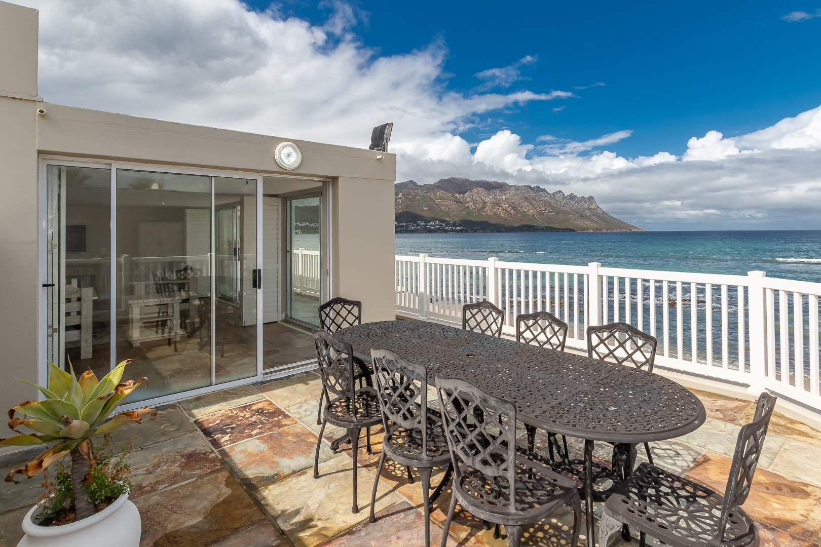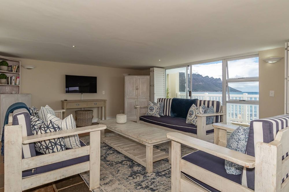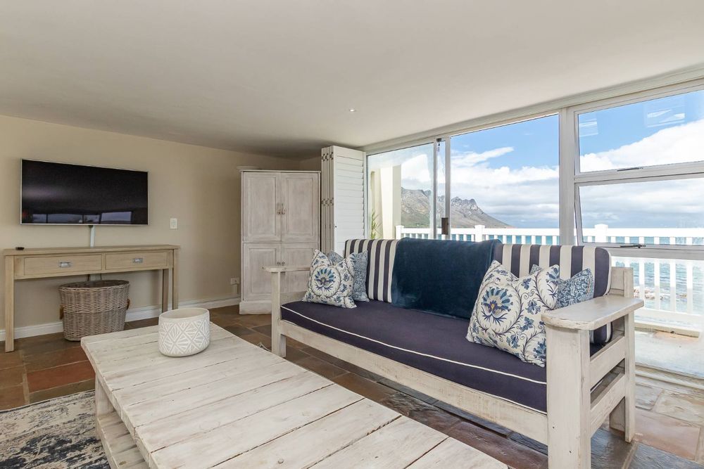 The modern open-plan kitchen flows seamlessly into the dining and lounge areas. It features solid Caesarstone countertops, a fitted oven, gas stove, cooker hood, double basin, and space for a dishwasher. The dining and lounge areas open onto a patio offering uninterrupted sea and mountain views perfect for entertaining or relaxing.