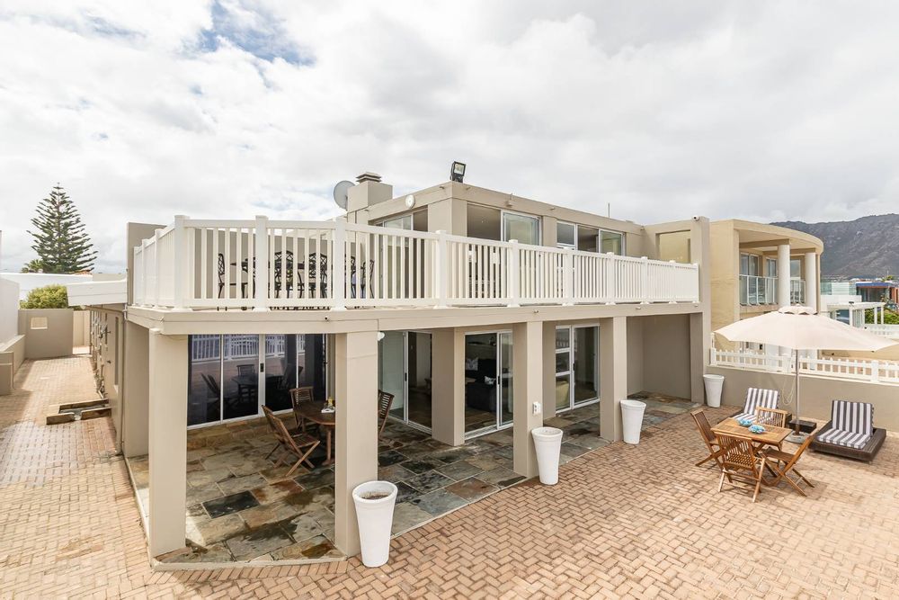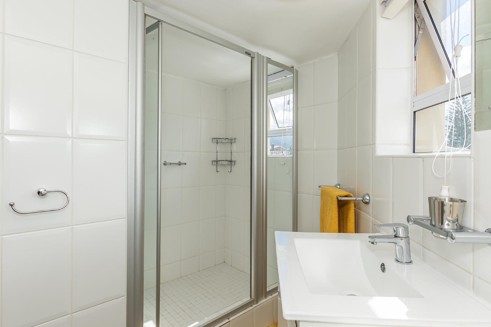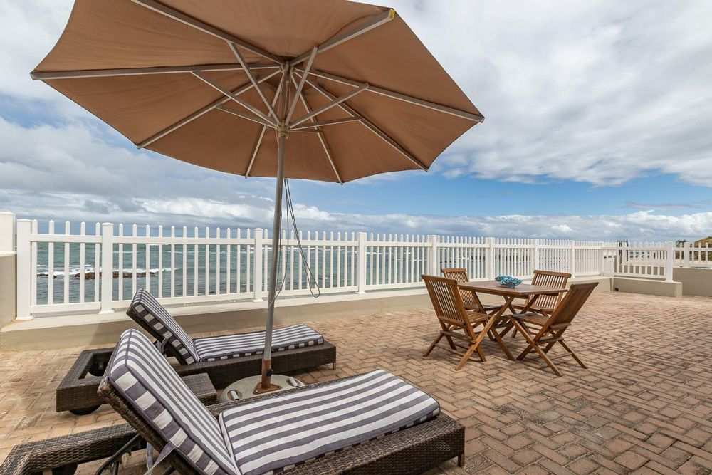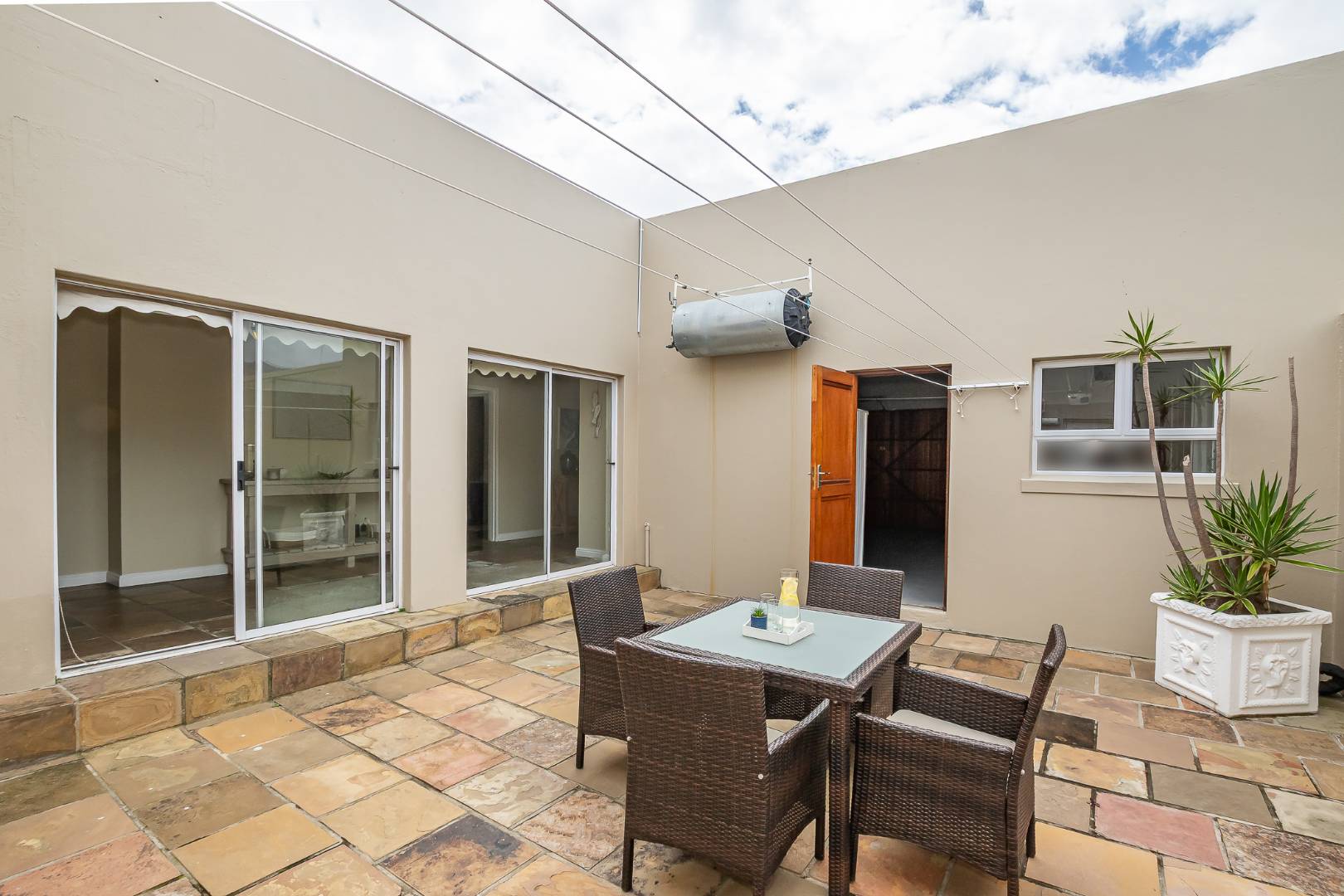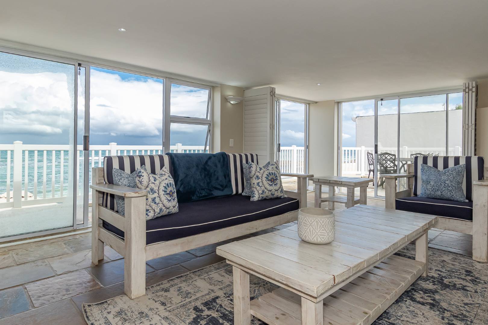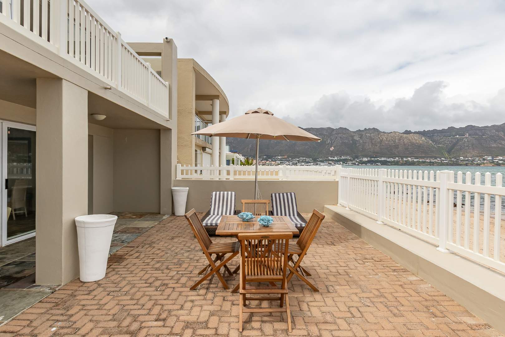 The modern open-plan kitchen flows seamlessly into the dining and lounge areas. It features solid Caesarstone countertops, a fitted oven, gas stove, cooker hood, double basin, and space for a dishwasher. The dining and lounge areas open onto a patio offering uninterrupted sea and mountain views perfect for entertaining or relaxing.