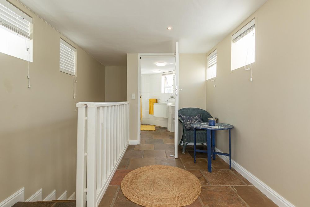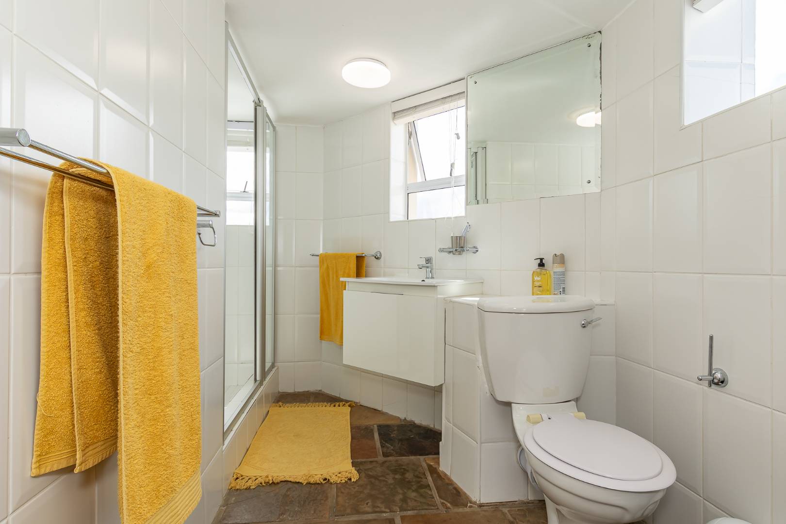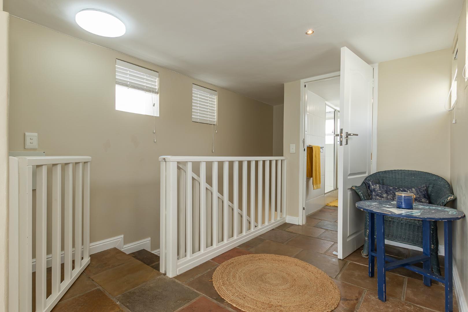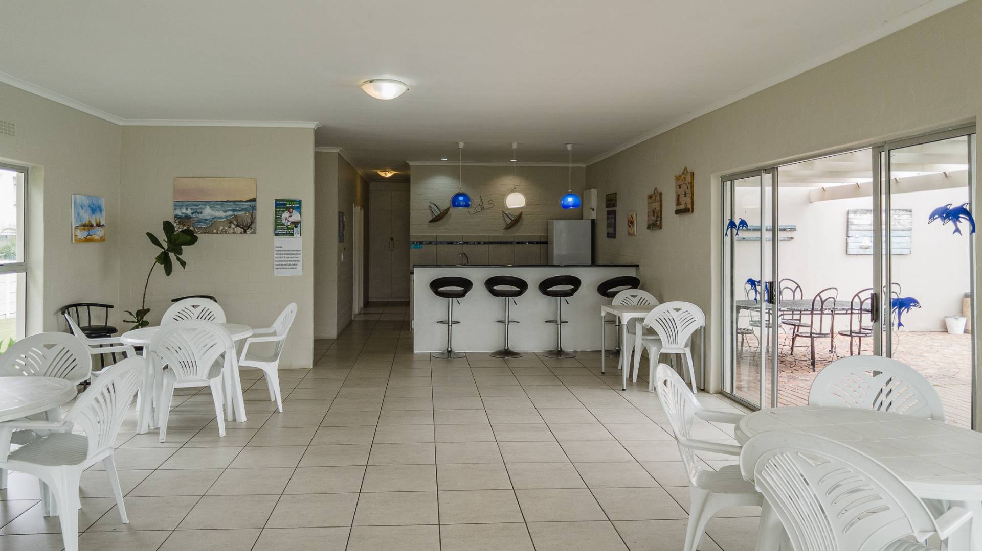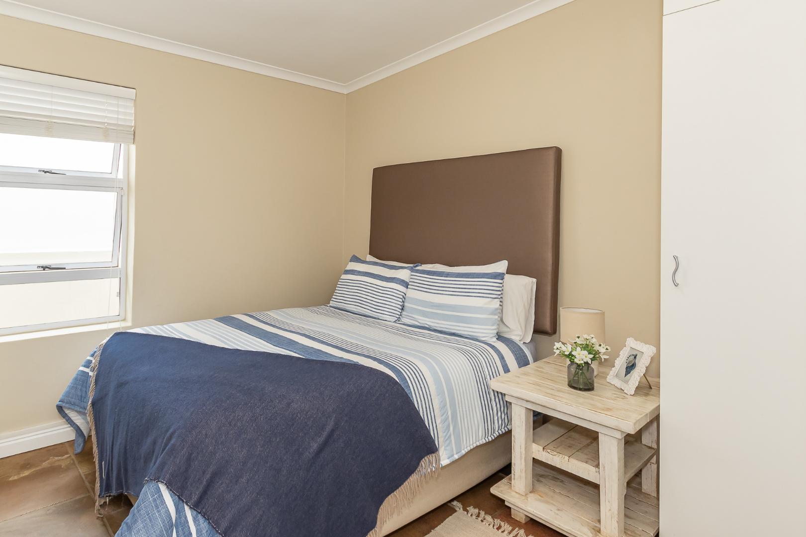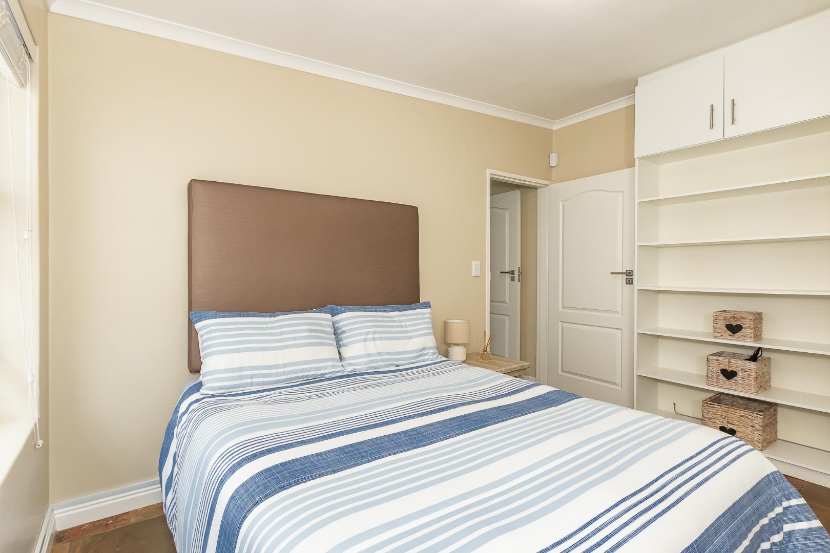 The modern open-plan kitchen flows seamlessly into the dining and lounge areas. It features solid Caesarstone countertops, a fitted oven, gas stove, cooker hood, double basin, and space for a dishwasher. The dining and lounge areas open onto a patio offering uninterrupted sea and mountain views perfect for entertaining or relaxing.