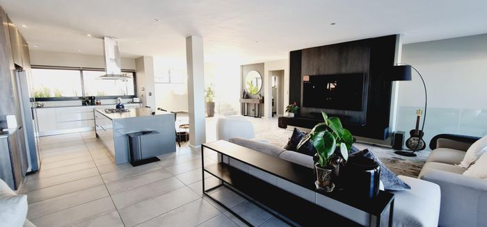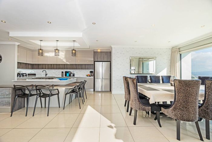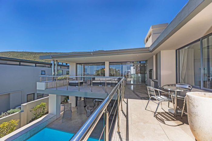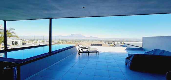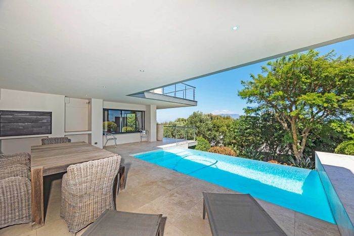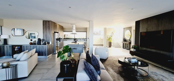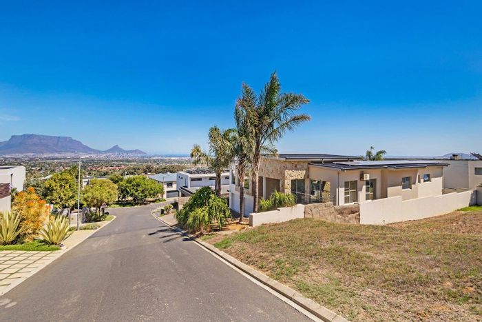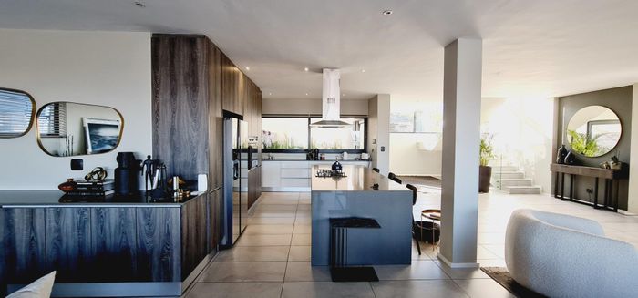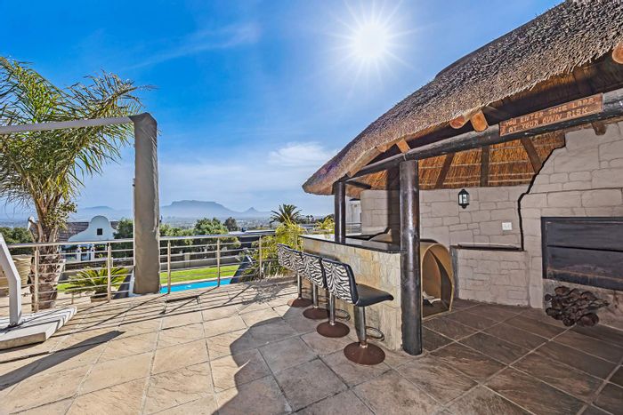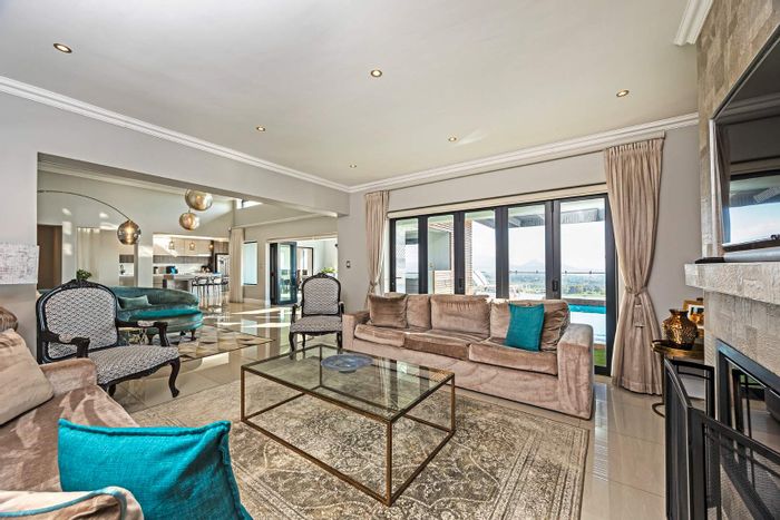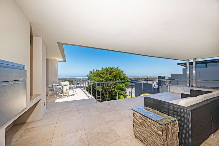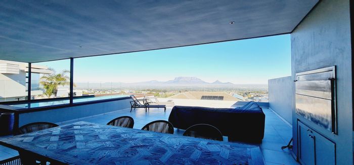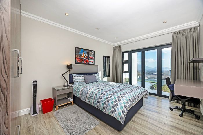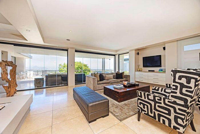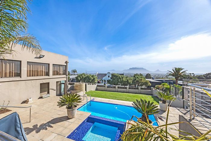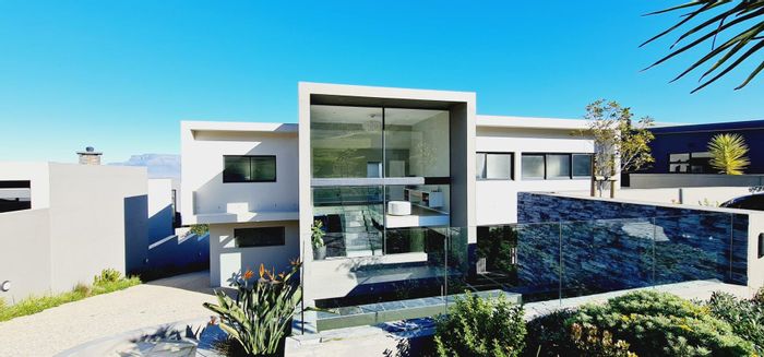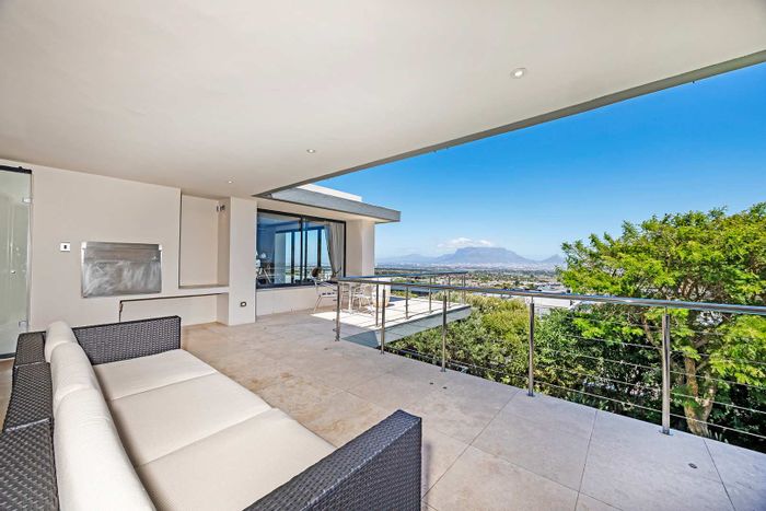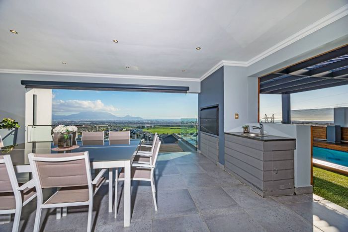 Panoramic Table Mountain views from prestigious Baronetcy Estate — contemporary showpiece with bespoke chef’s kitchen, heated pool, undercover braai and home cinema. 5 beds, 4 baths, 3 garages.