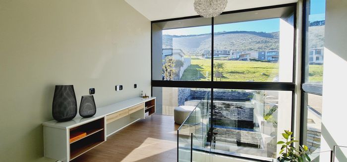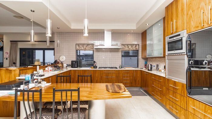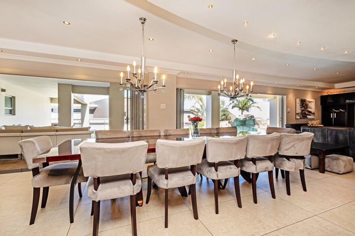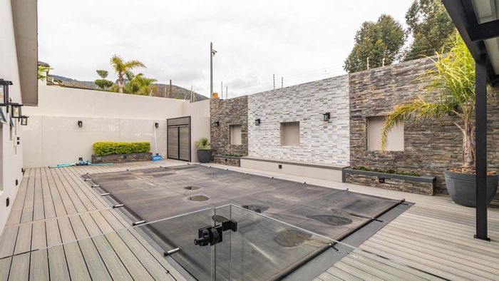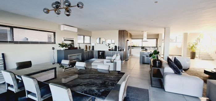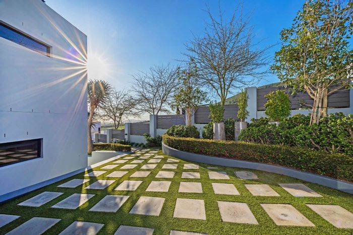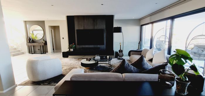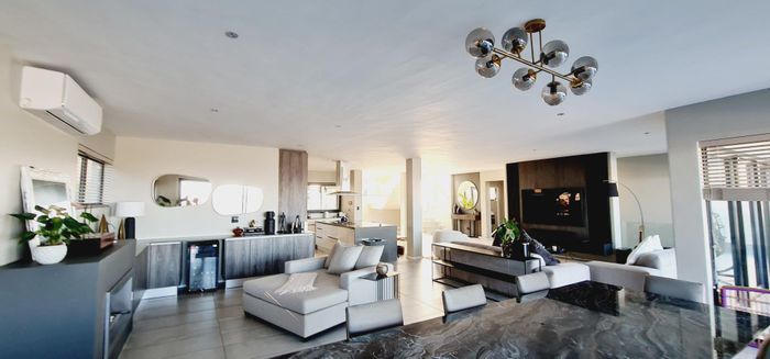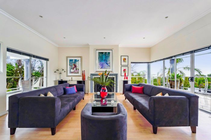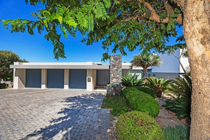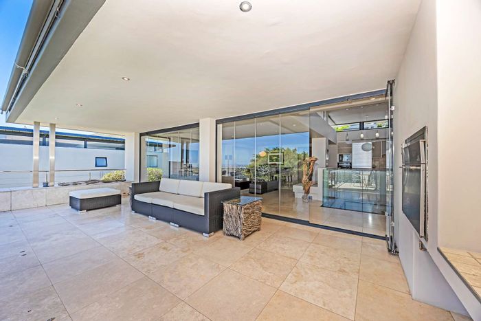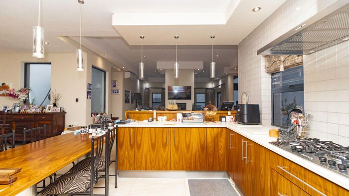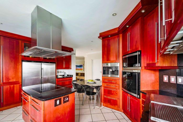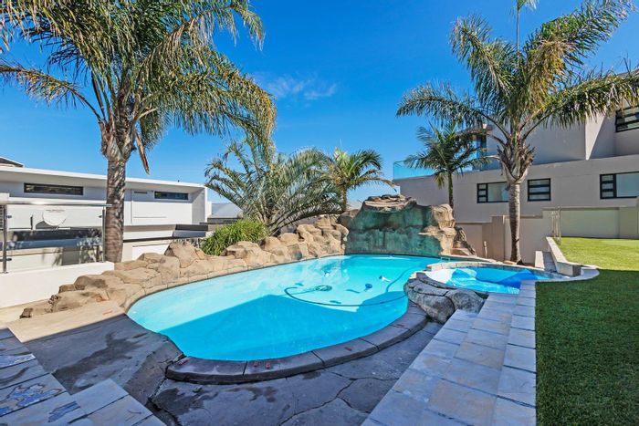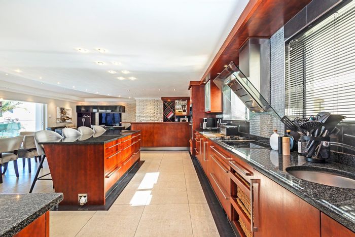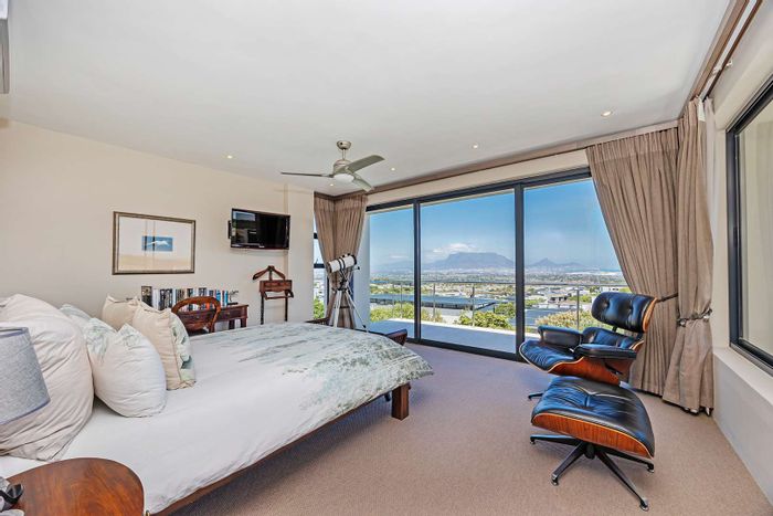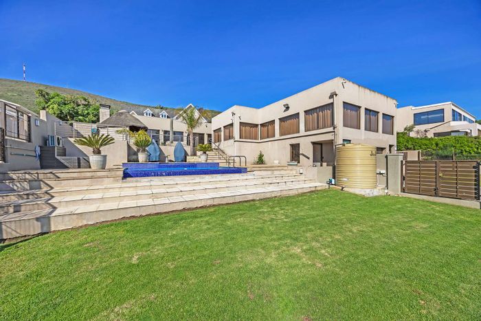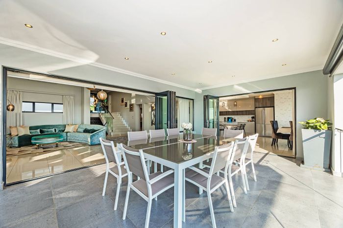 Panoramic Table Mountain views from prestigious Baronetcy Estate — contemporary showpiece with bespoke chef’s kitchen, heated pool, undercover braai and home cinema. 5 beds, 4 baths, 3 garages.