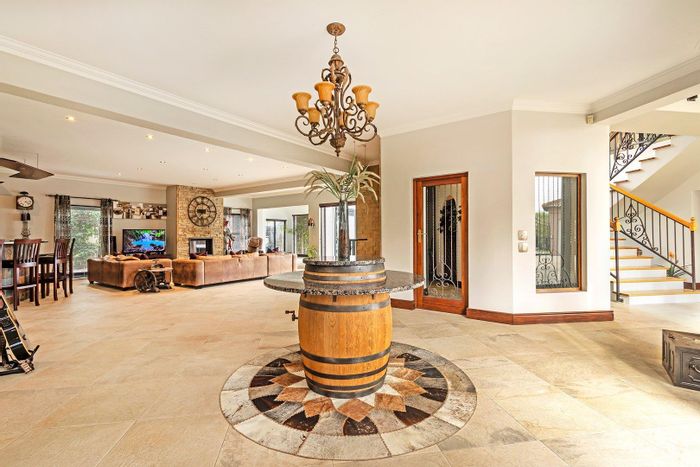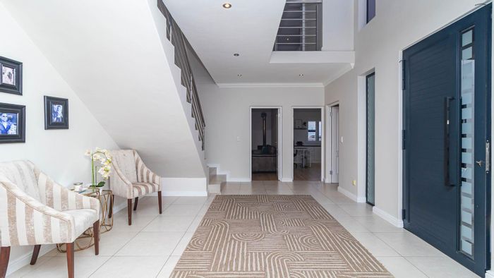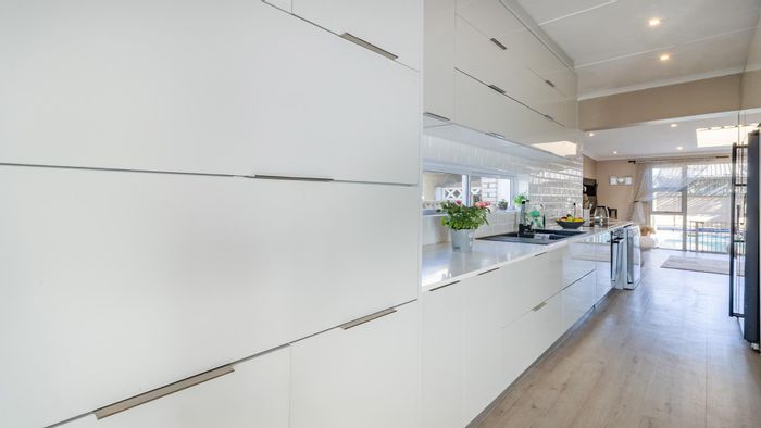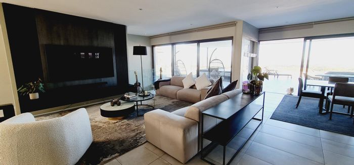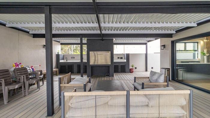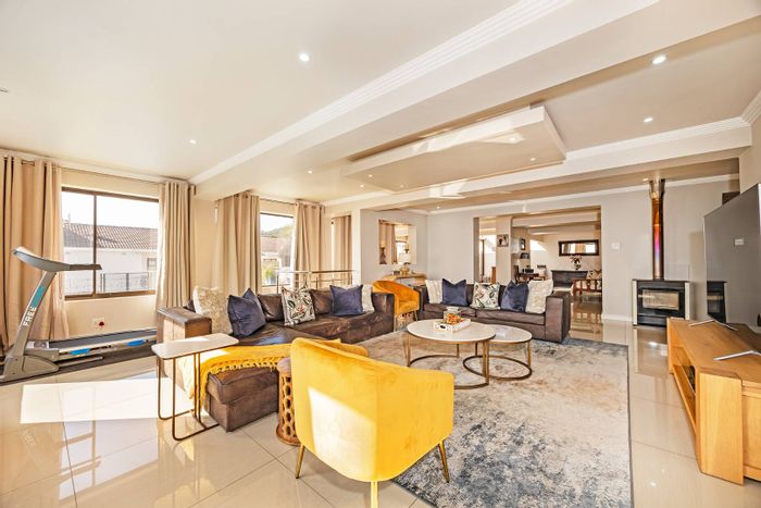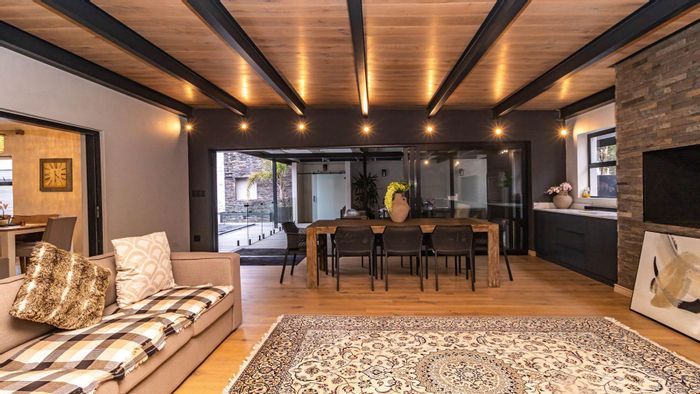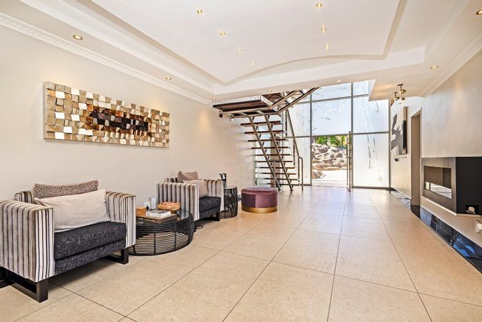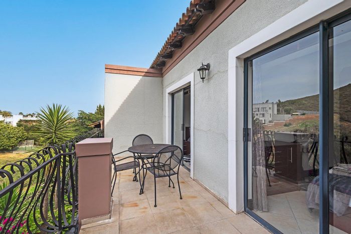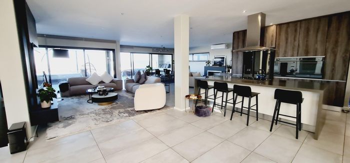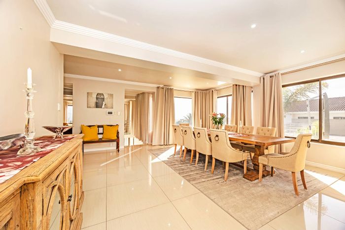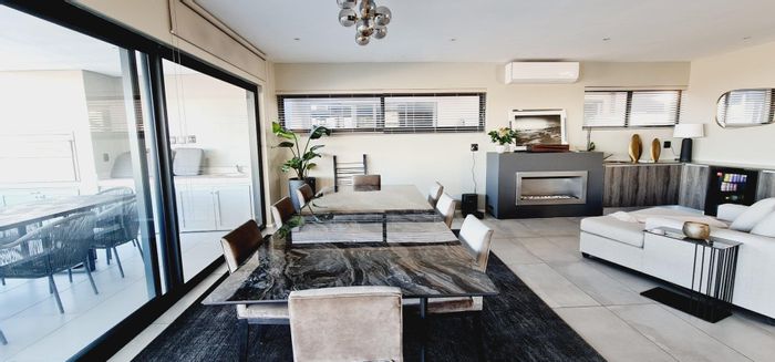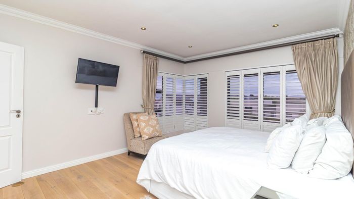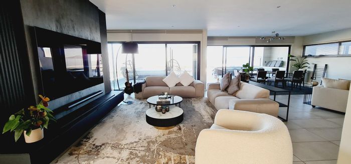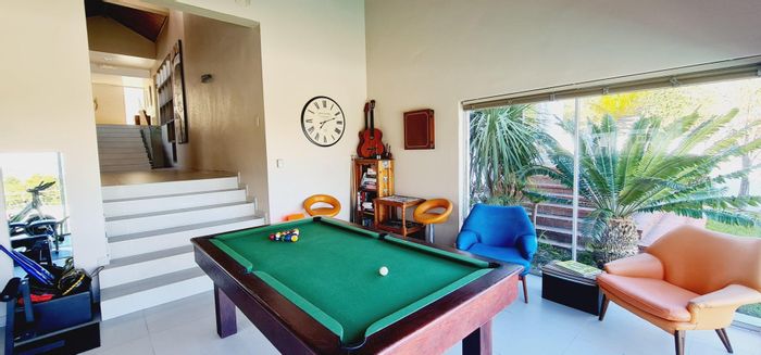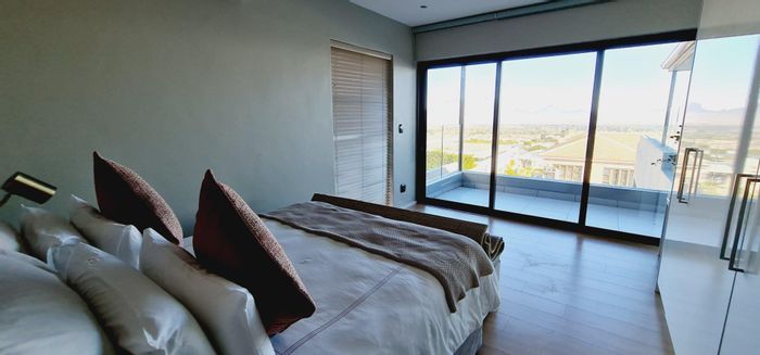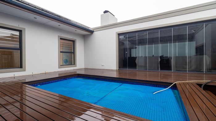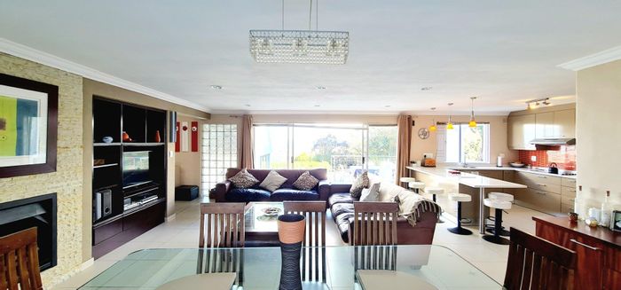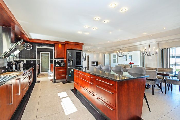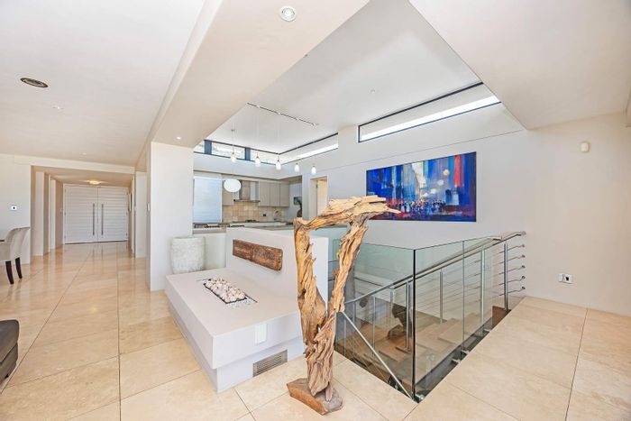 Panoramic Table Mountain views from prestigious Baronetcy Estate — contemporary showpiece with bespoke chef’s kitchen, heated pool, undercover braai and home cinema. 5 beds, 4 baths, 3 garages.