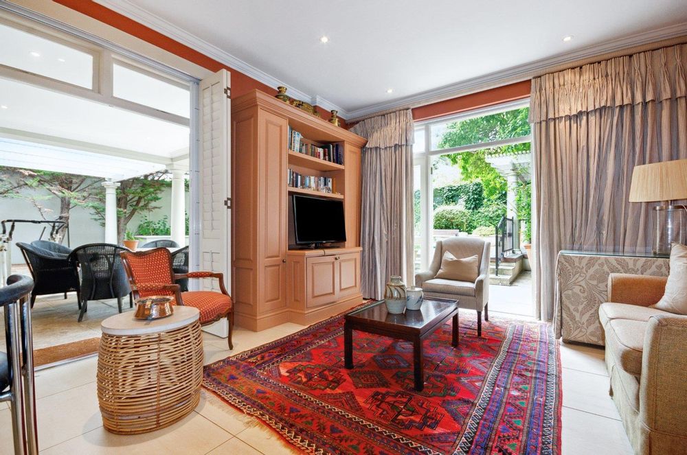 The dining room, with carpets, leads to the patio/garden and the kitchen.
