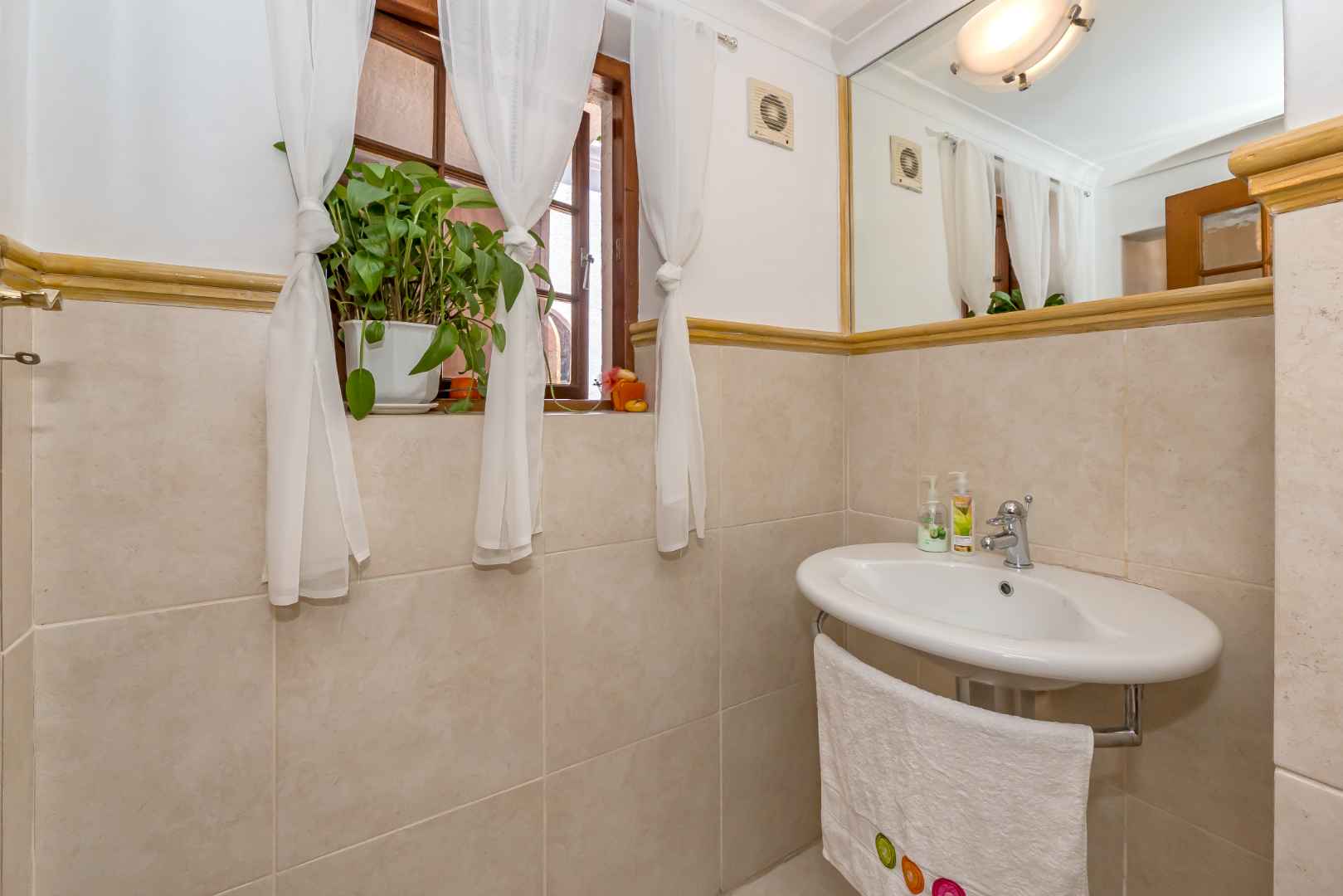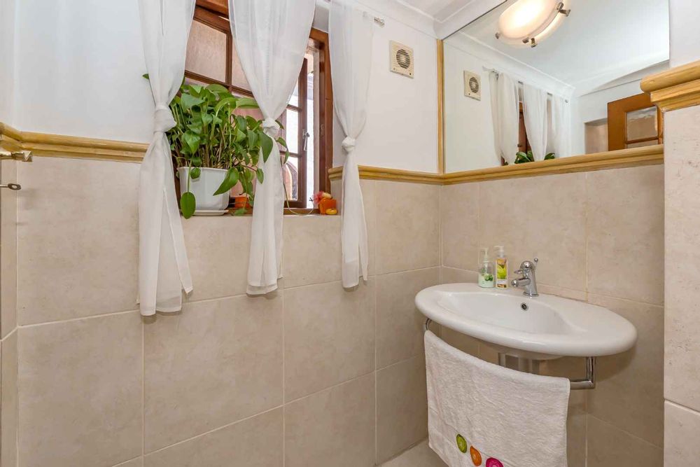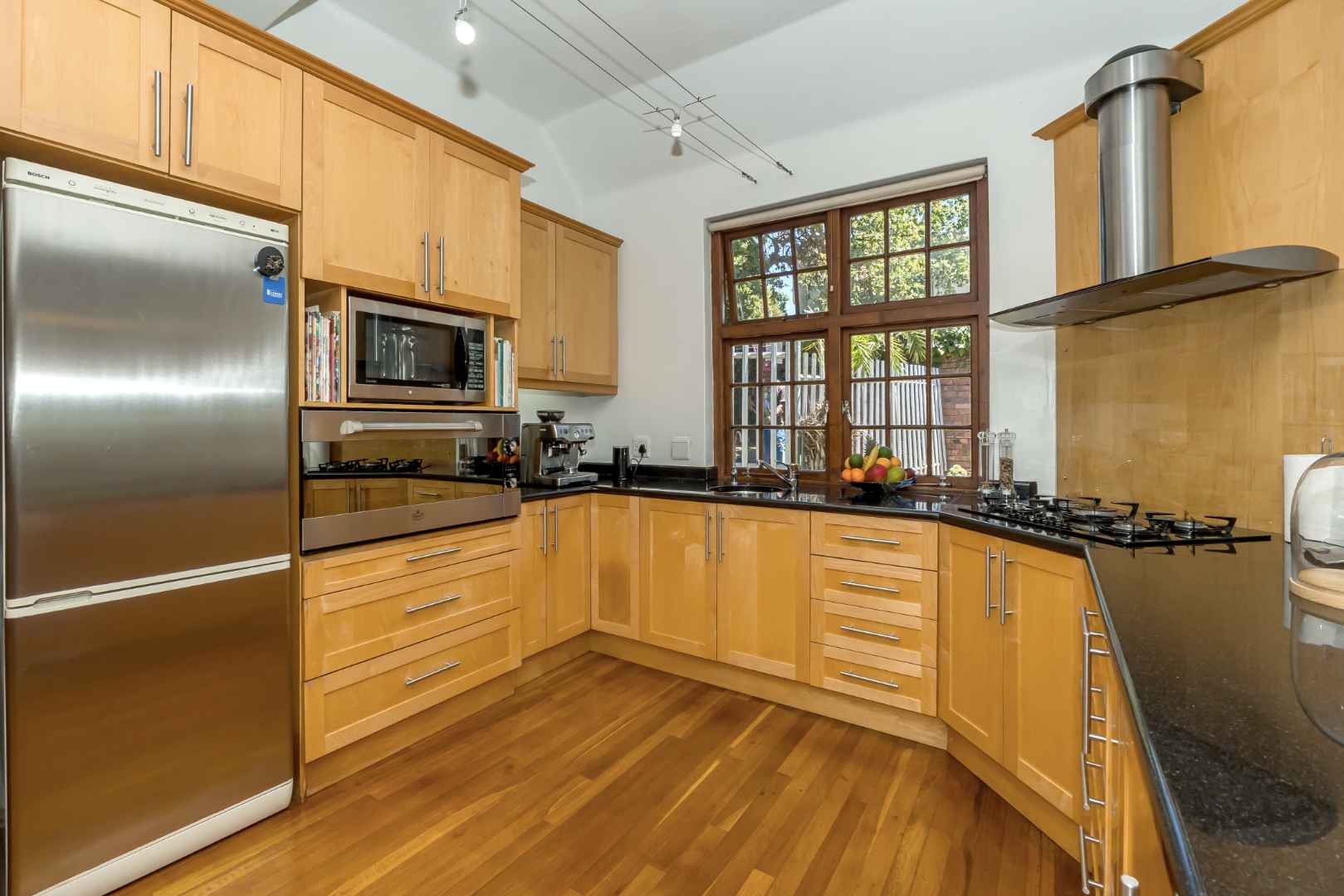 The guest bathroom is neatly appointed with floating sanitary wear. The only bedroom downstairs has direct access to the driveway and can easily function as a separate entrance. The spacious kitchen topped with black granite is the heart of the home, the appliances are all very well ergonomically and thoughtfully situated with abundant cupboard and counter top space flowing into the open plan dining room and sun kissed tv room/ living area. Here the double doors once again open up onto the terrace revealing the impeccable north facing mountain views and lush garden. The scullery and pantry are practically positioned and lead into the laundry/ double garage.