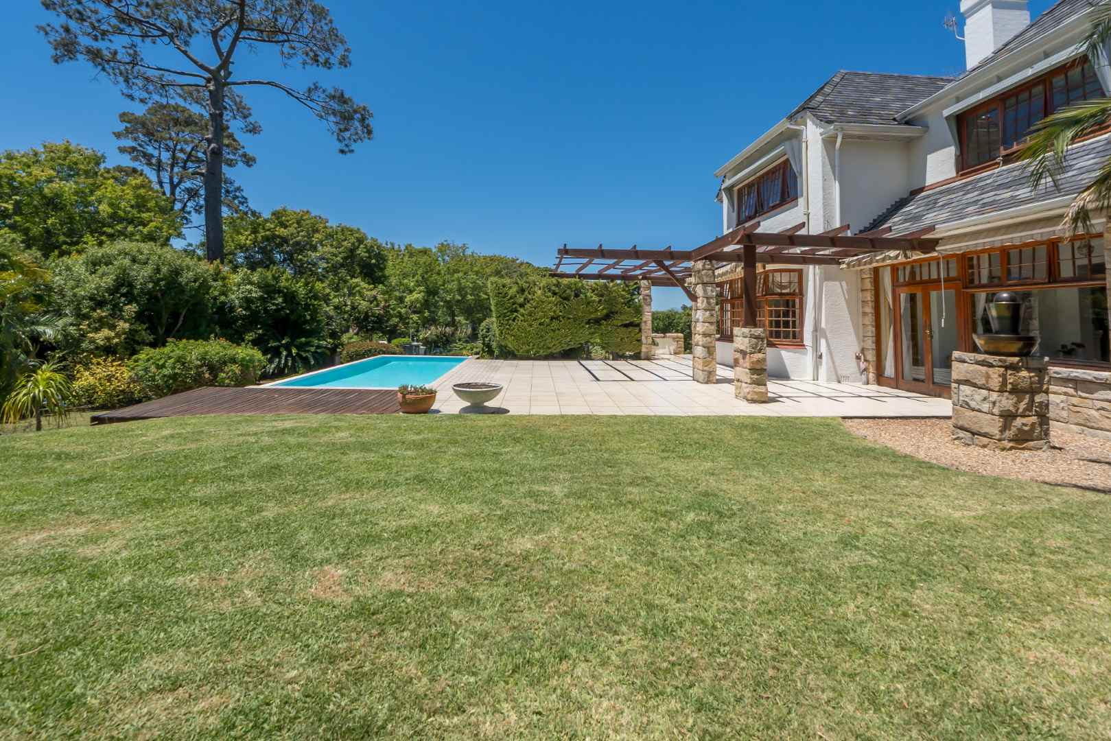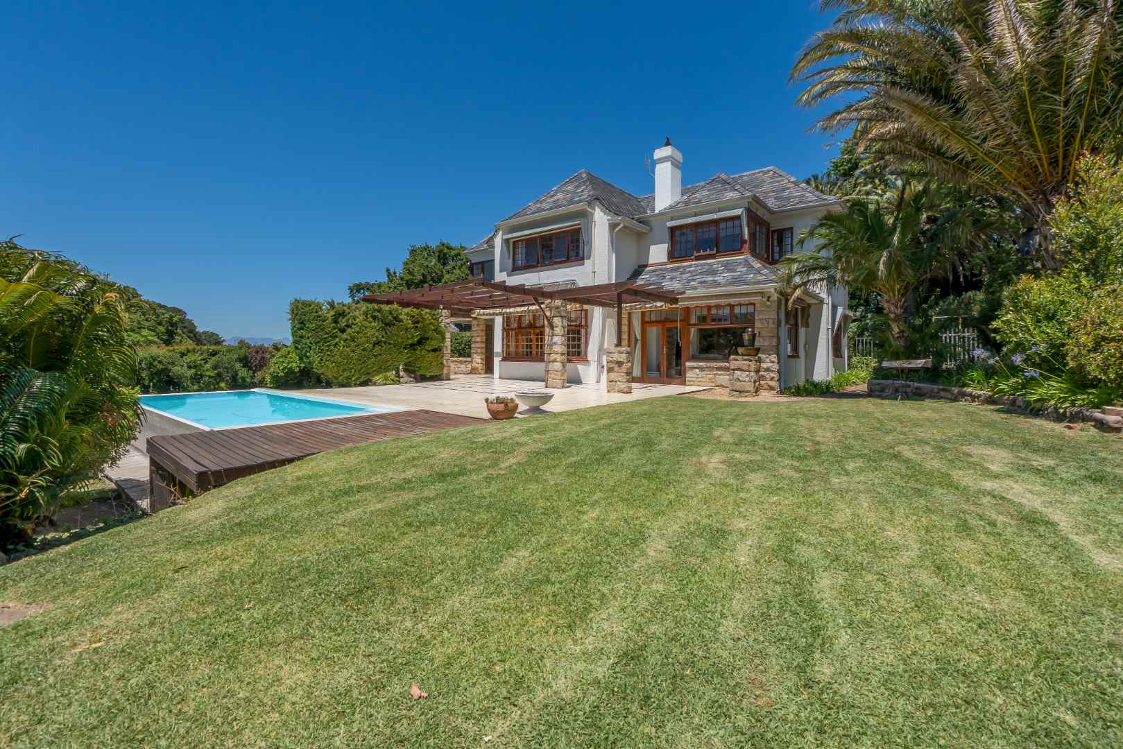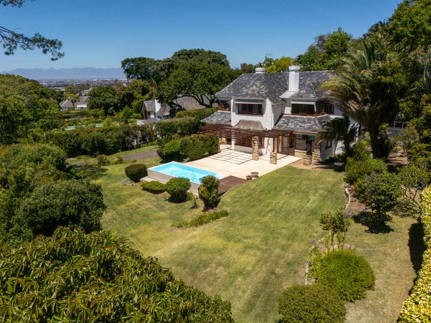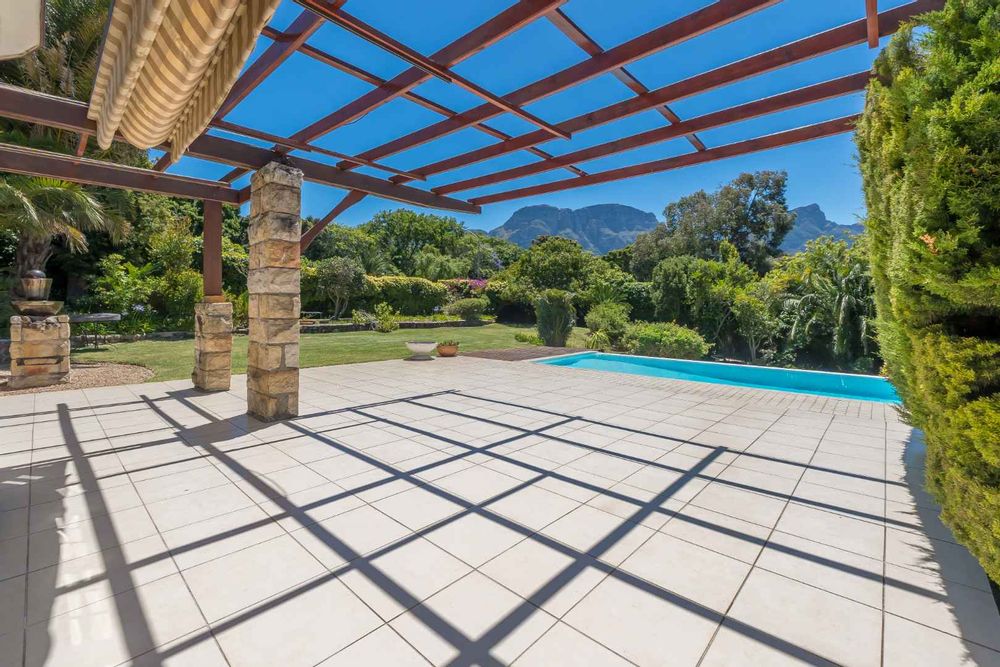 A sweeping driveway leads up to the grand stone-columned entrance, where the terrace flows effortlessly onto a sun soaked pool and rolling lawns, capturing magnificent views of Table Mountain, an outlook enjoyed from select upstairs bedrooms.