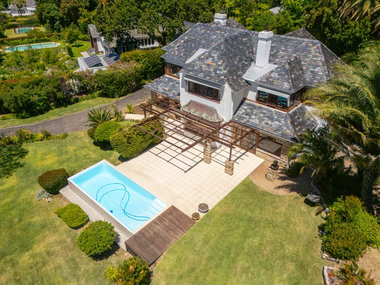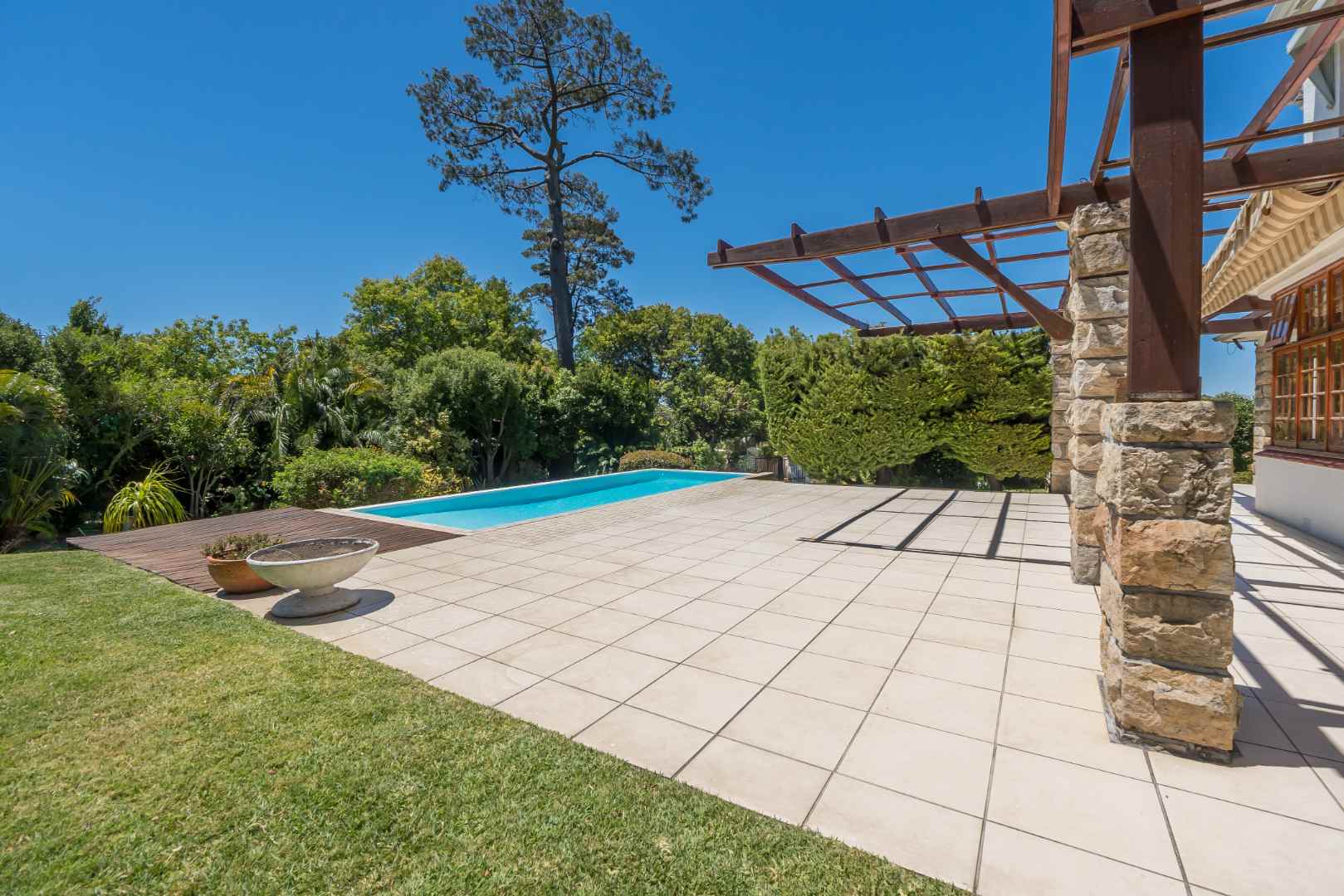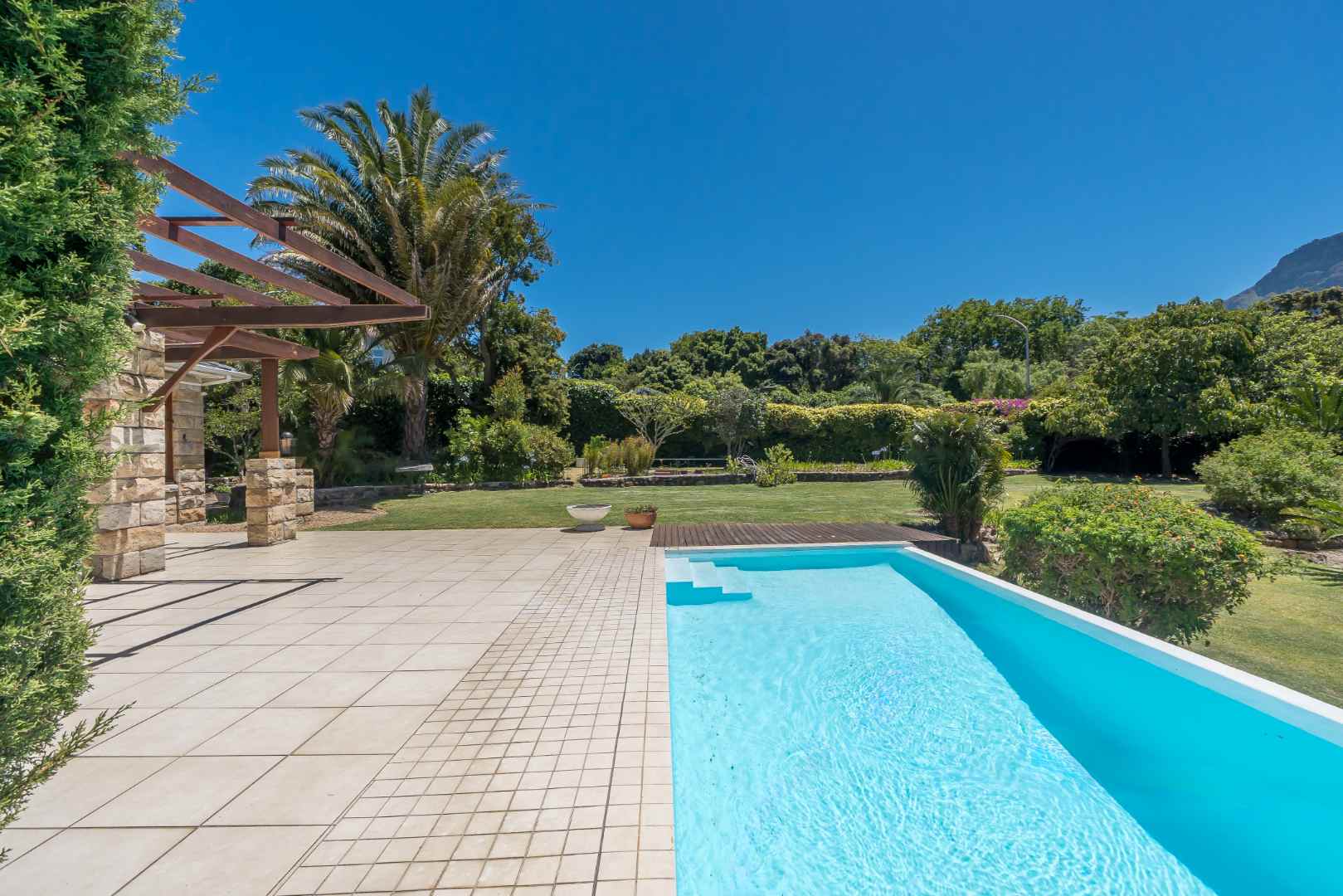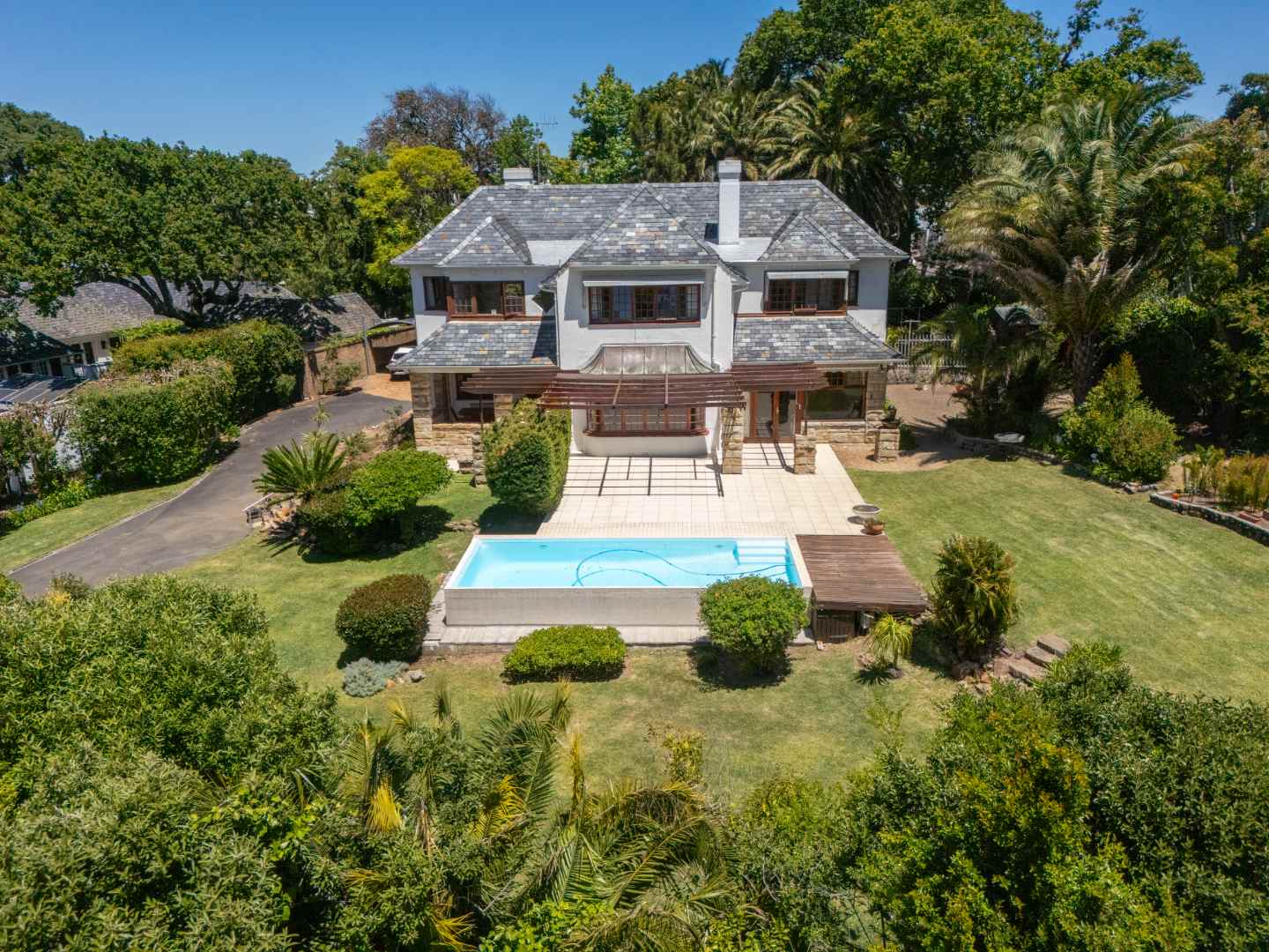 A sweeping driveway leads up to the grand stone-columned entrance, where the terrace flows effortlessly onto a sun soaked pool and rolling lawns, capturing magnificent views of Table Mountain, an outlook enjoyed from select upstairs bedrooms.