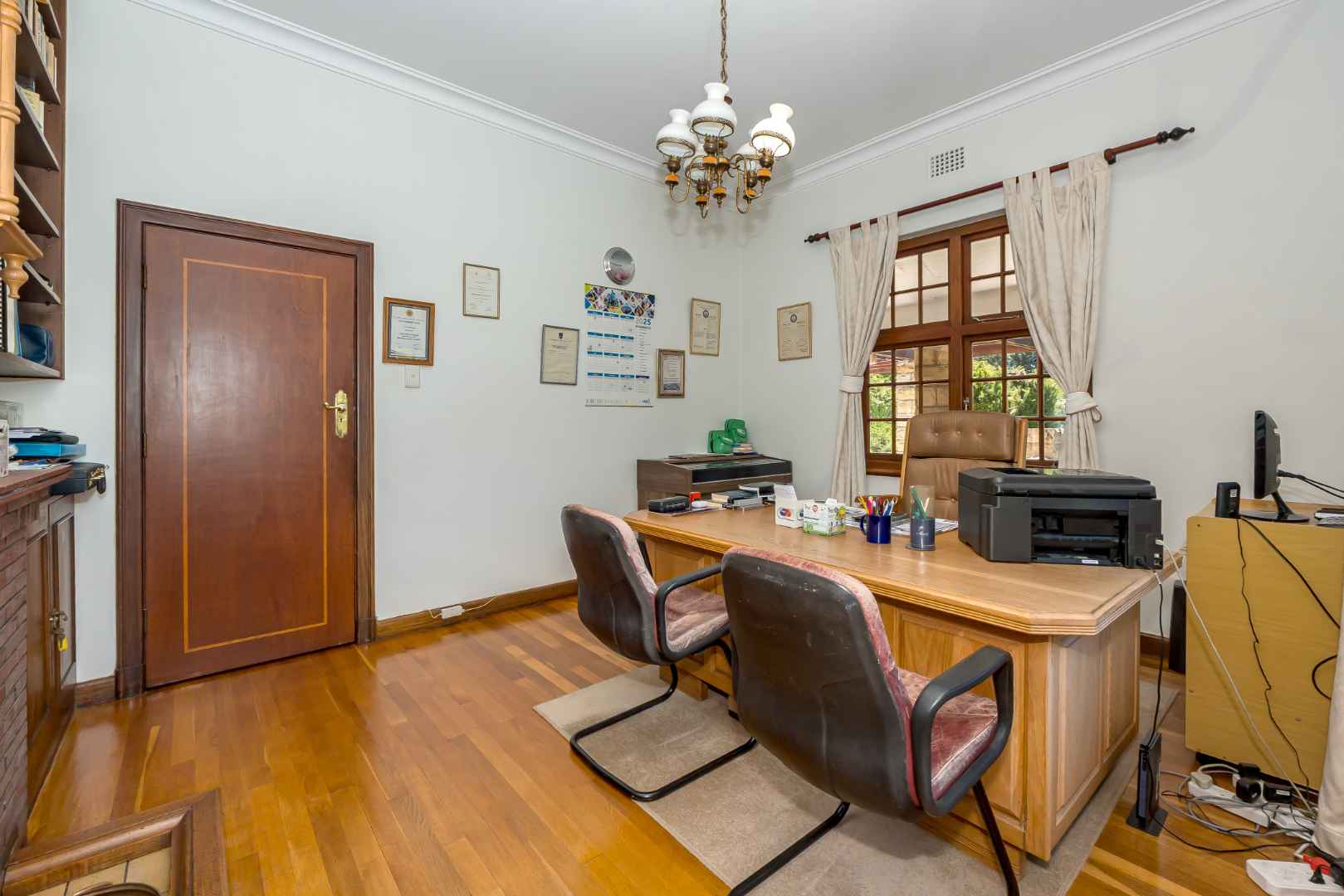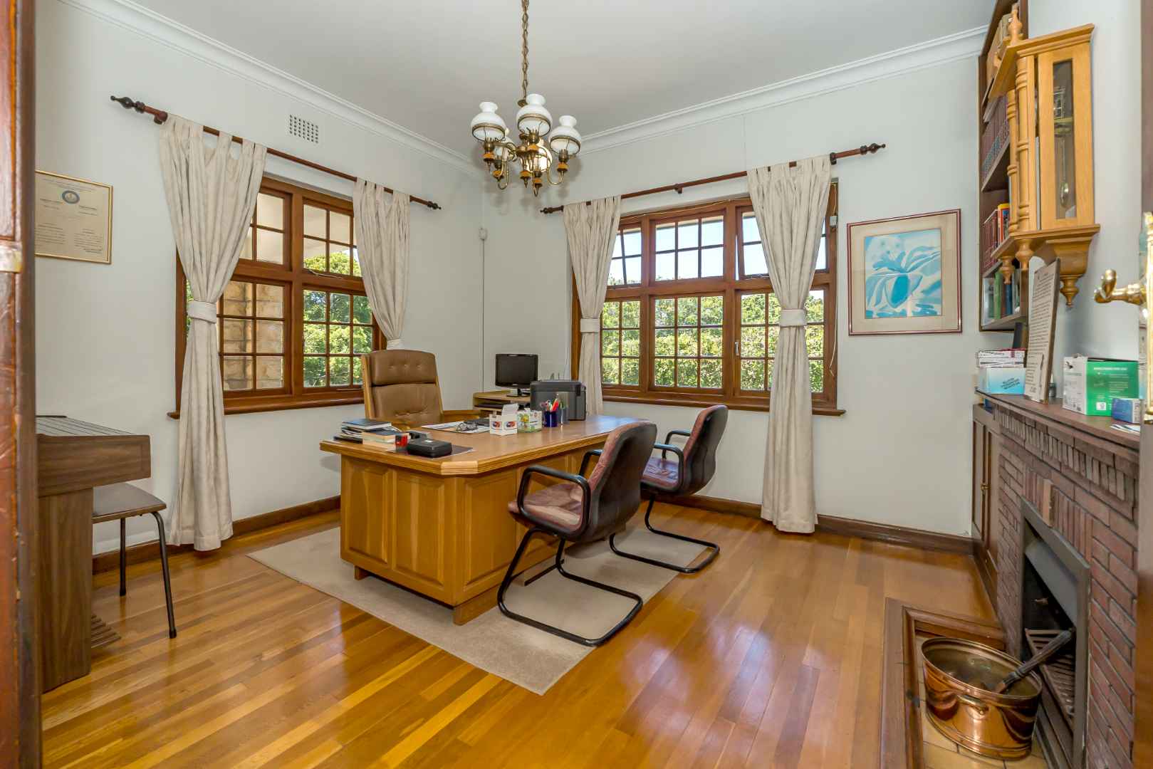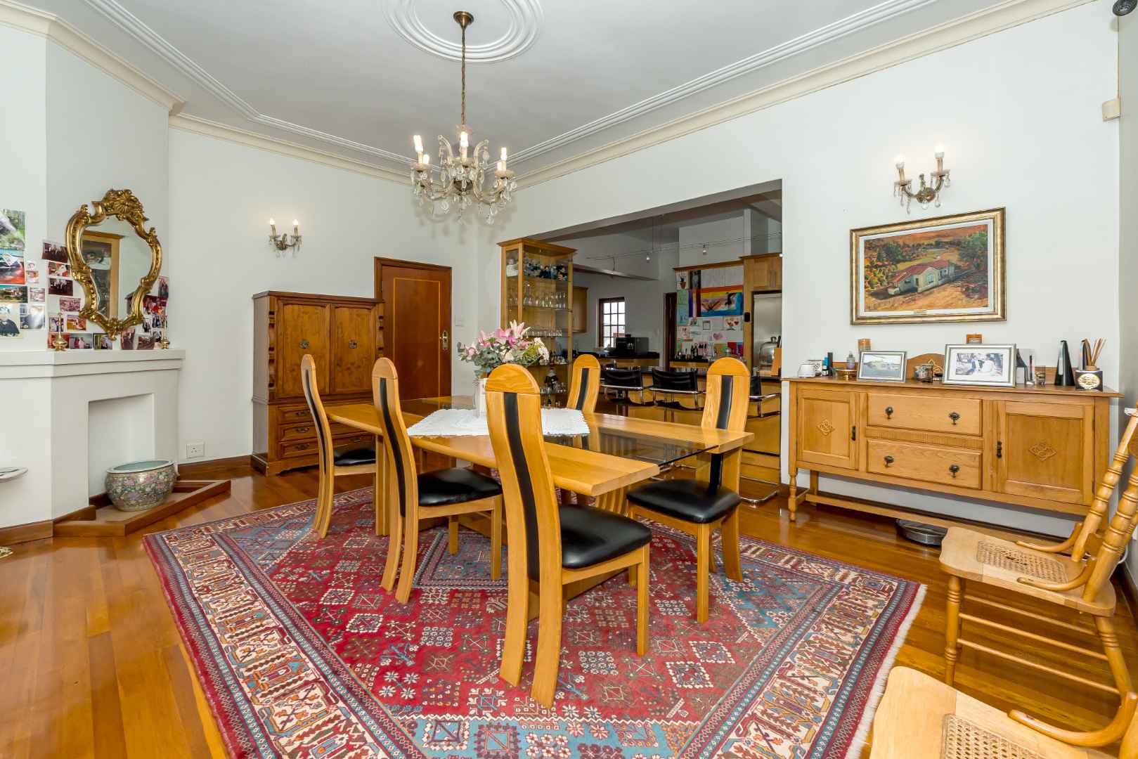 Upon entry, the home is warm and welcoming with beautifully maintained suspended wooden flooring, high ceilings and an effortless sense of scale. The study is spacious with solid wooden teak book racks and a wood burner for those cold winter evenings. In the formal lounge the ornate glass chandelier echoes elegance while the warm timber-framed bay window overlooks the garden. Solid wooden double doors open up onto the veranda and the gas jet master fireplace set in stone allows for an enhanced ambiance whist entertaining or enjoying a quiet night in. Gayleigh’s classic gabled roofline and authentic period detailing reflect impeccable heritage craftsmanship, while the generous proportions throughout the home offer both luxurious family living and effortless entertaining.