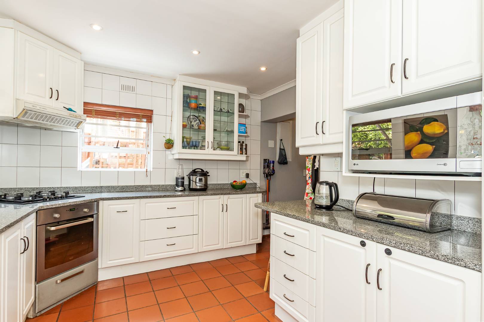 A spacious kitchen fitted with a gas/electric oven and hob, plumbed for a dishwasher, and complemented by a large, separate laundry.