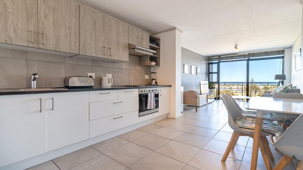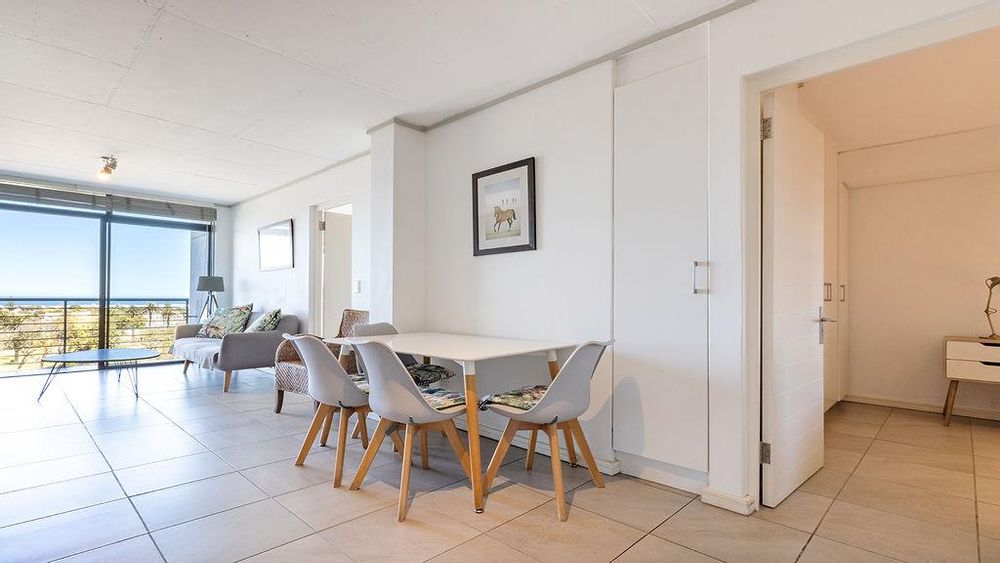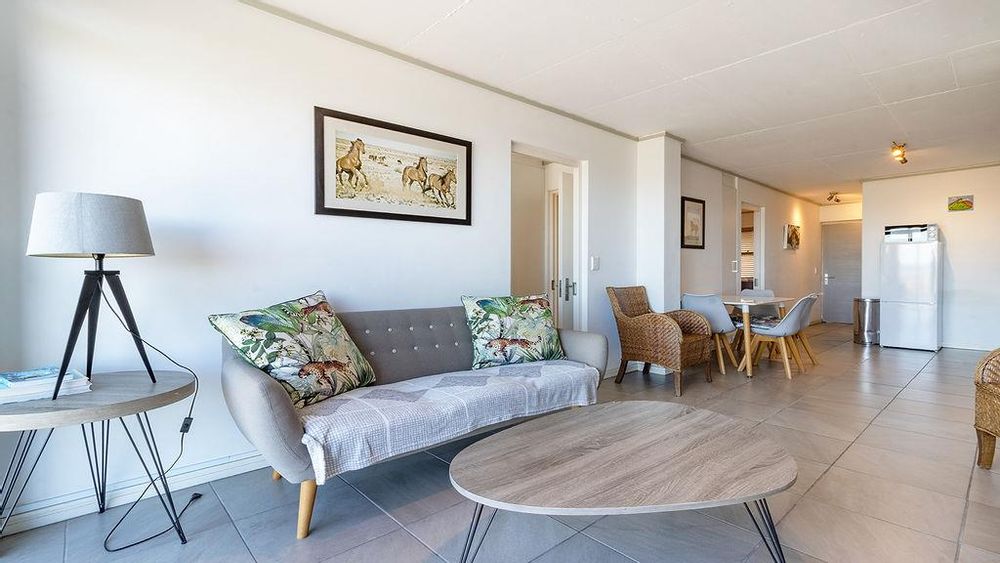The open-plan living area flows to the balcony that offers a stunning view of the ocean and Table Mountain.