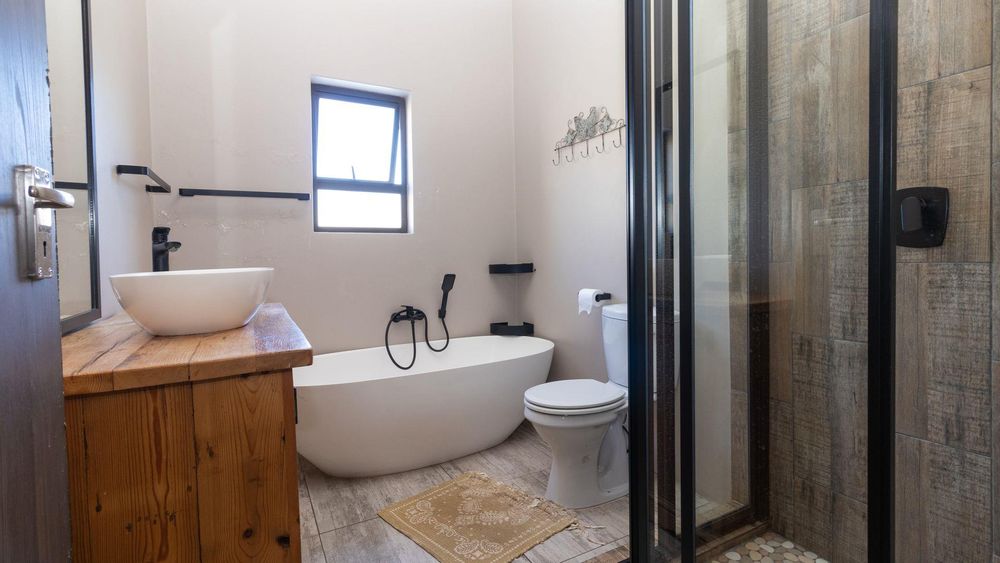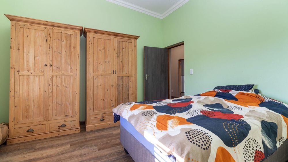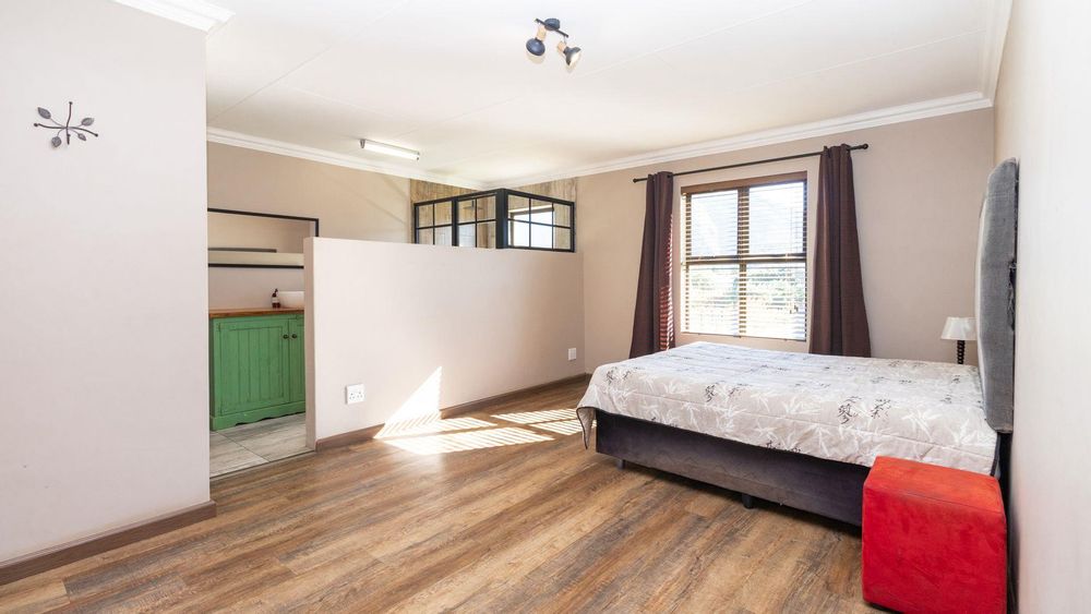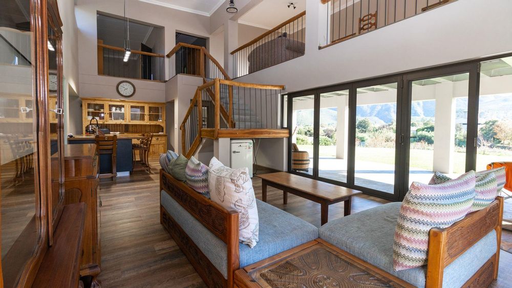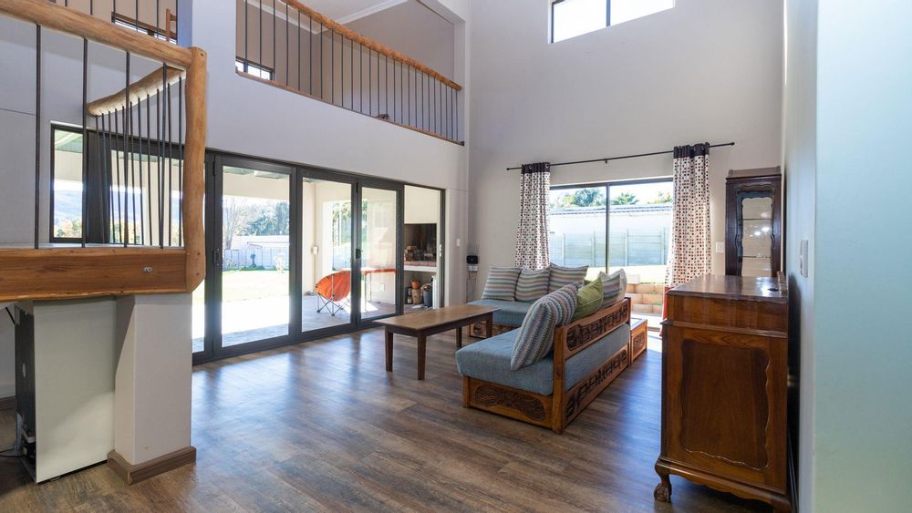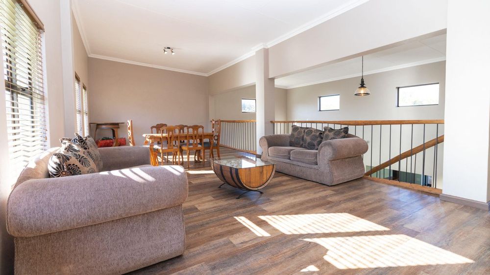 Upstairs: Two well-sized bedrooms (one with en suite), an expansive entertainment and living area, and a large patio with built-in braai and sweeping garden and river views.