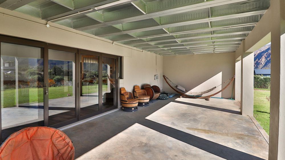 Indoor-Outdoor Living: Large glass doors open from the living area to a covered patio and garden, enhancing the sense of space and connection with nature.