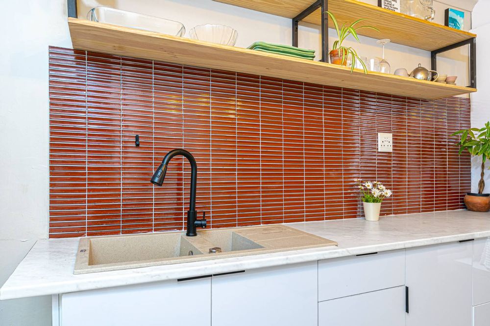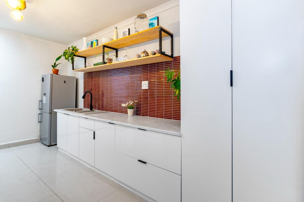 The entrance hall flows to a galley-style kitchen with its modern style with shades of cream and white, complementing the warm colour backsplash and mat black mixer and taps. The kitchen is the heart of the home bringing the second bedroom and common bathroom together by linking these spaces and flows to the living room.