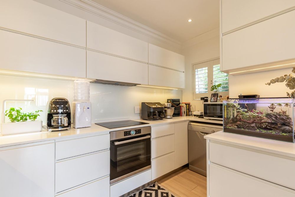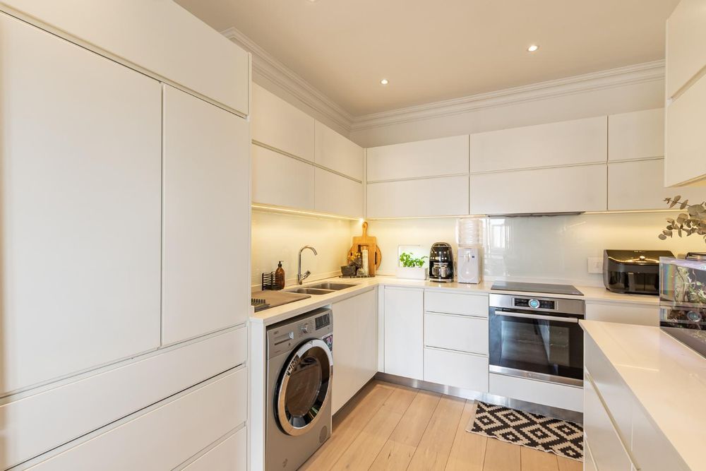 The kitchen is a chef's dream, equipped with Caesarstone countertops, bespoke cabinetry, and high-end appliances including a double sink with a stylish Hansgrohe mixer.