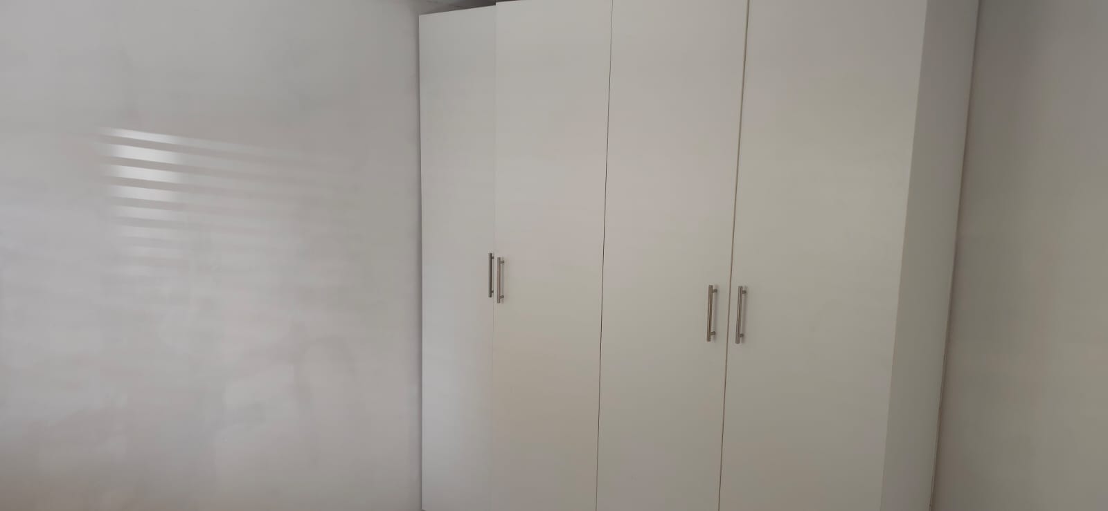 The kitchenette comes equipped with built-in cupboards, providing ample storage space. (Please note: no stove included.)