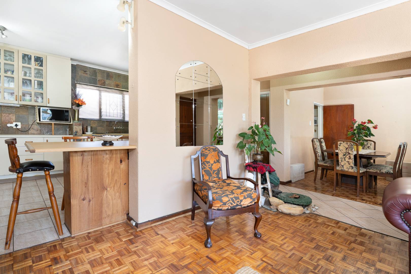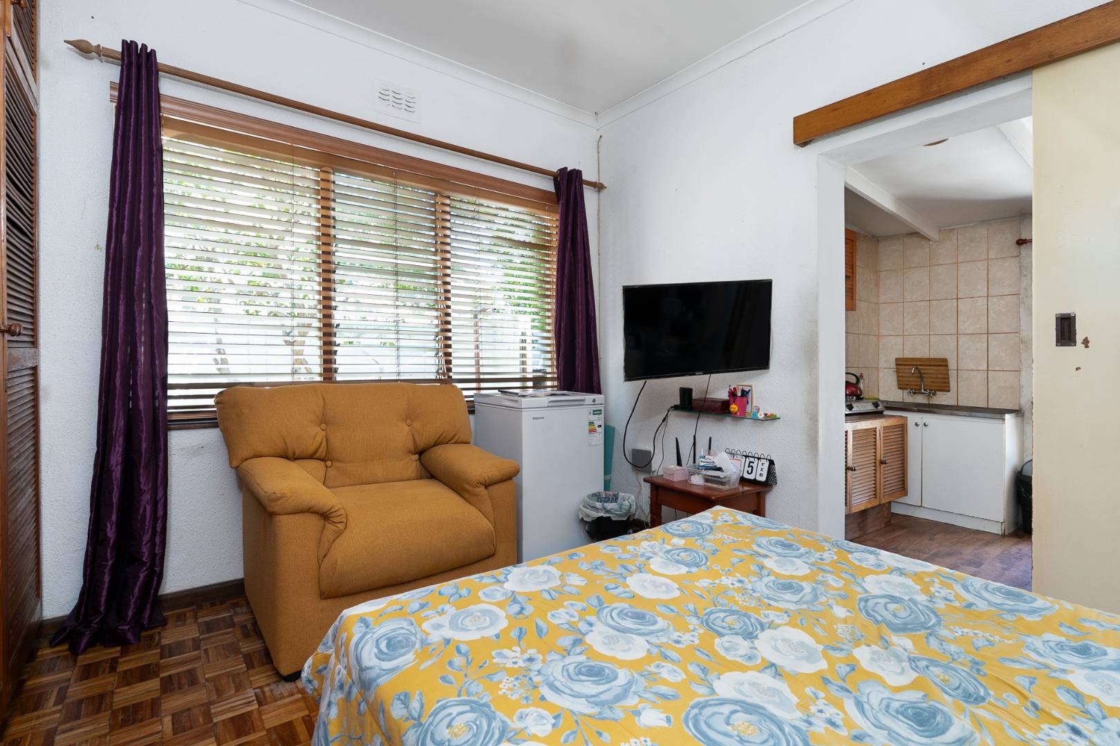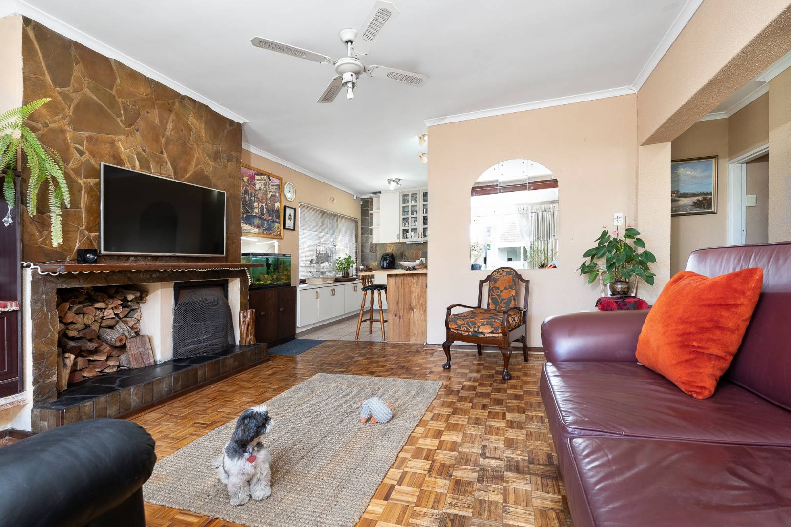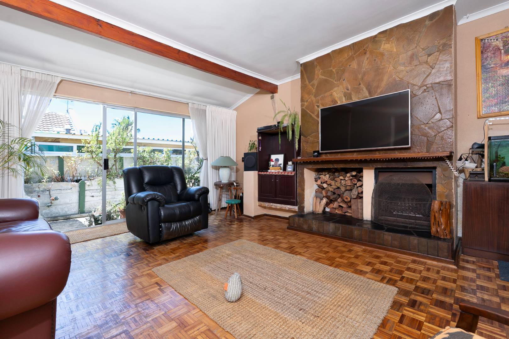 The sunny, airy lounge and kitchen are open-plan, featuring large windows and sliding aluminium doors that create seamless flow between the spaces. The lounge boasts beautiful wooden parquet floors and a cozy wood-burning fireplace, making it the heart of the home.