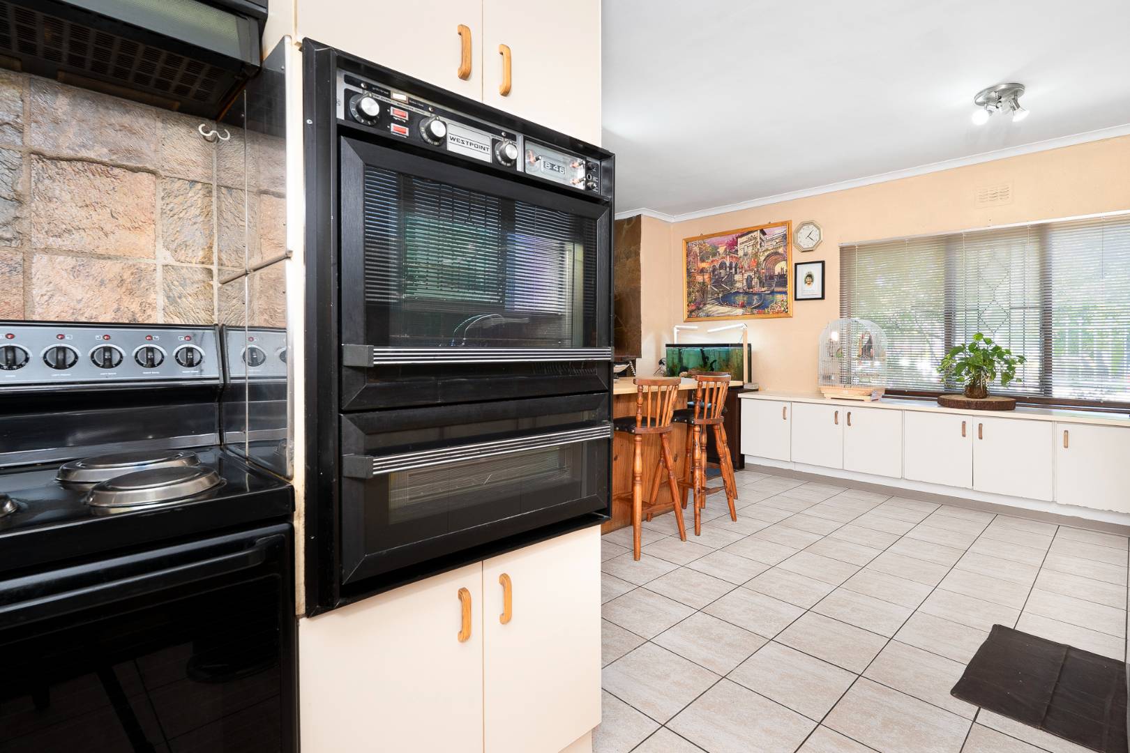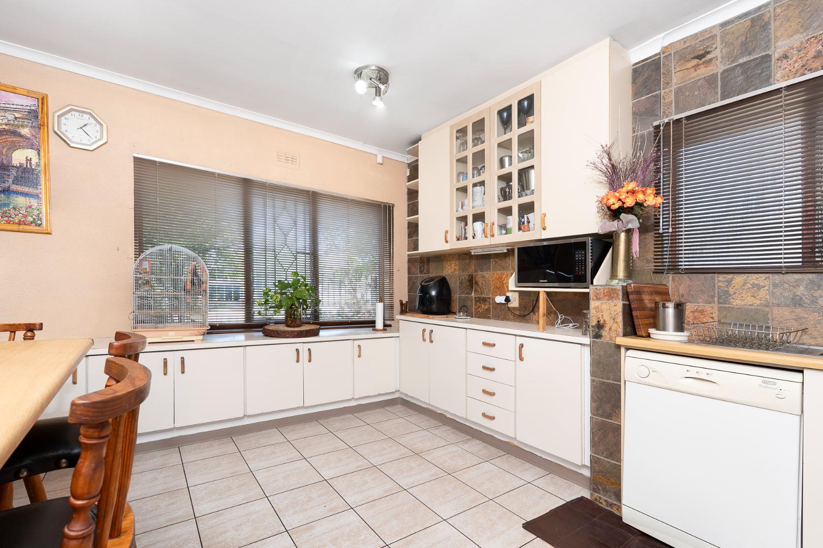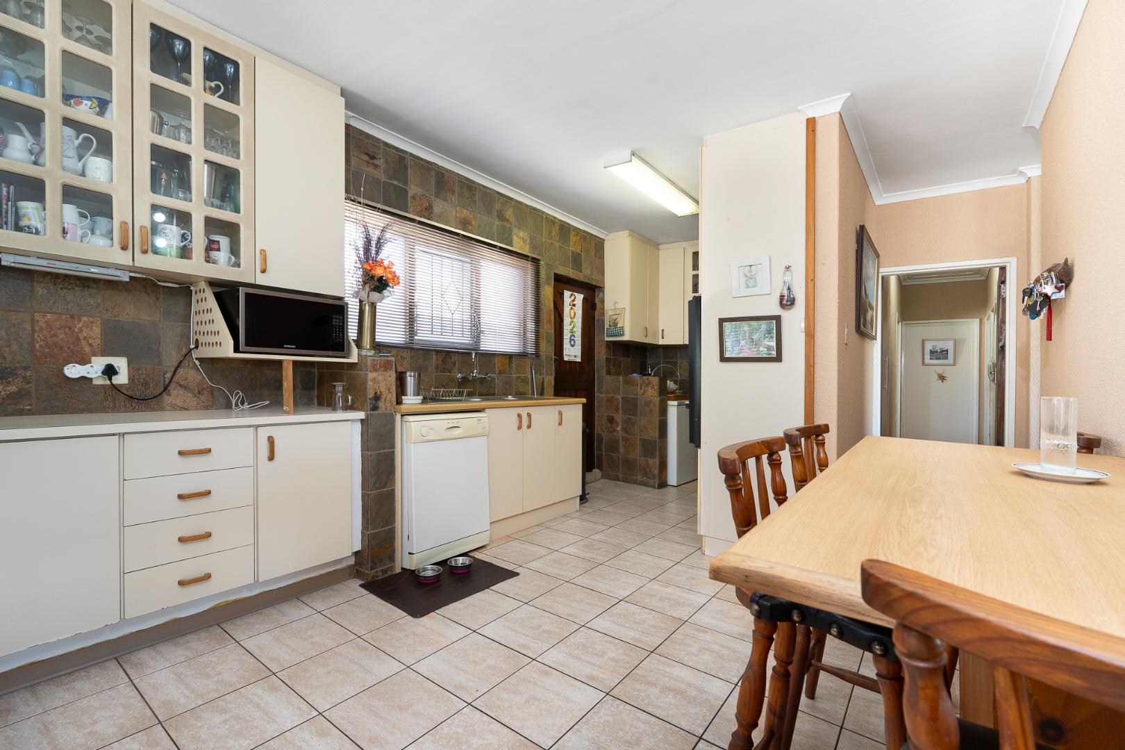 The spacious, fully fitted kitchen is tiled and well-designed, offering a breakfast area, eye-level oven, plumbing for one appliance, and ample space for a dining area.