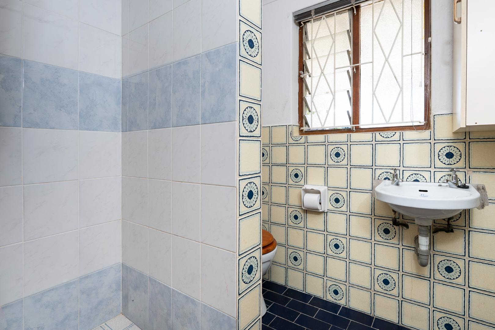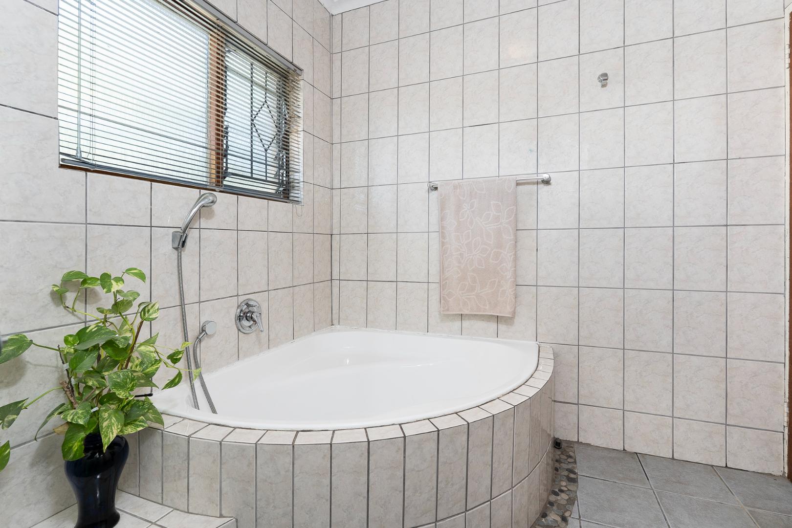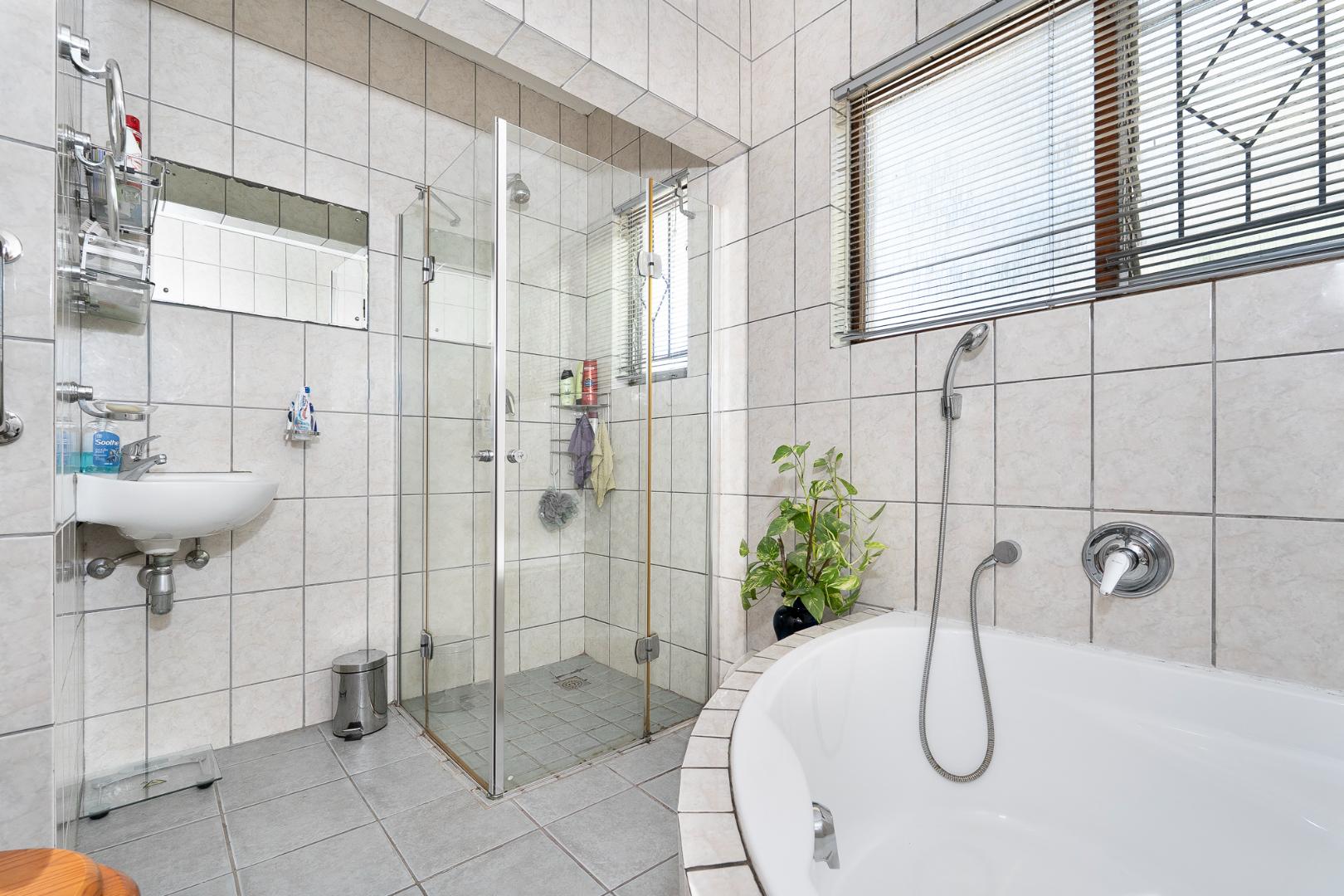 All three bedrooms feature parquet flooring, built-in cupboards, and blinds, and are privately tucked away on the right wing of the home. The generous family bathroom includes both a bath and a separate shower.