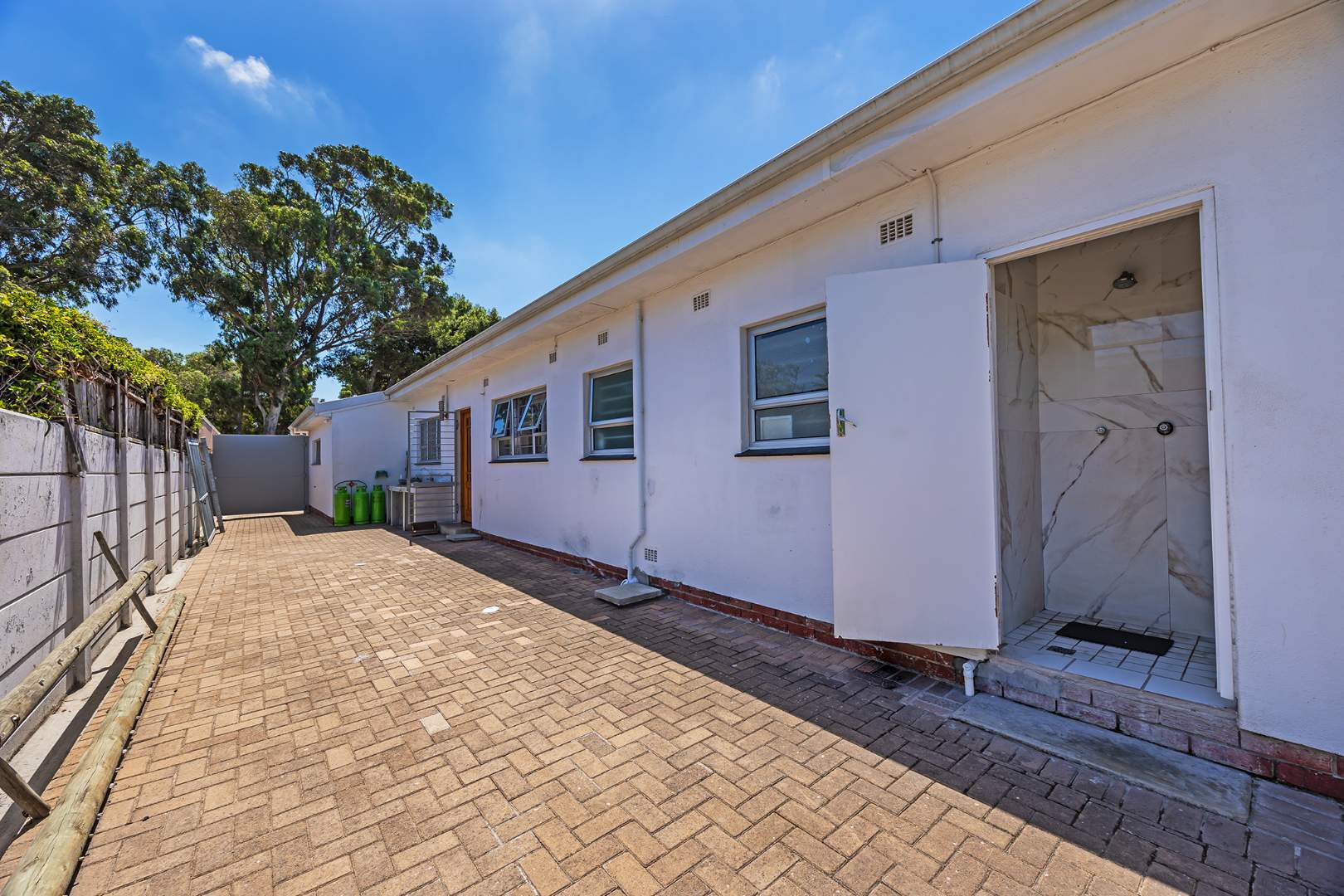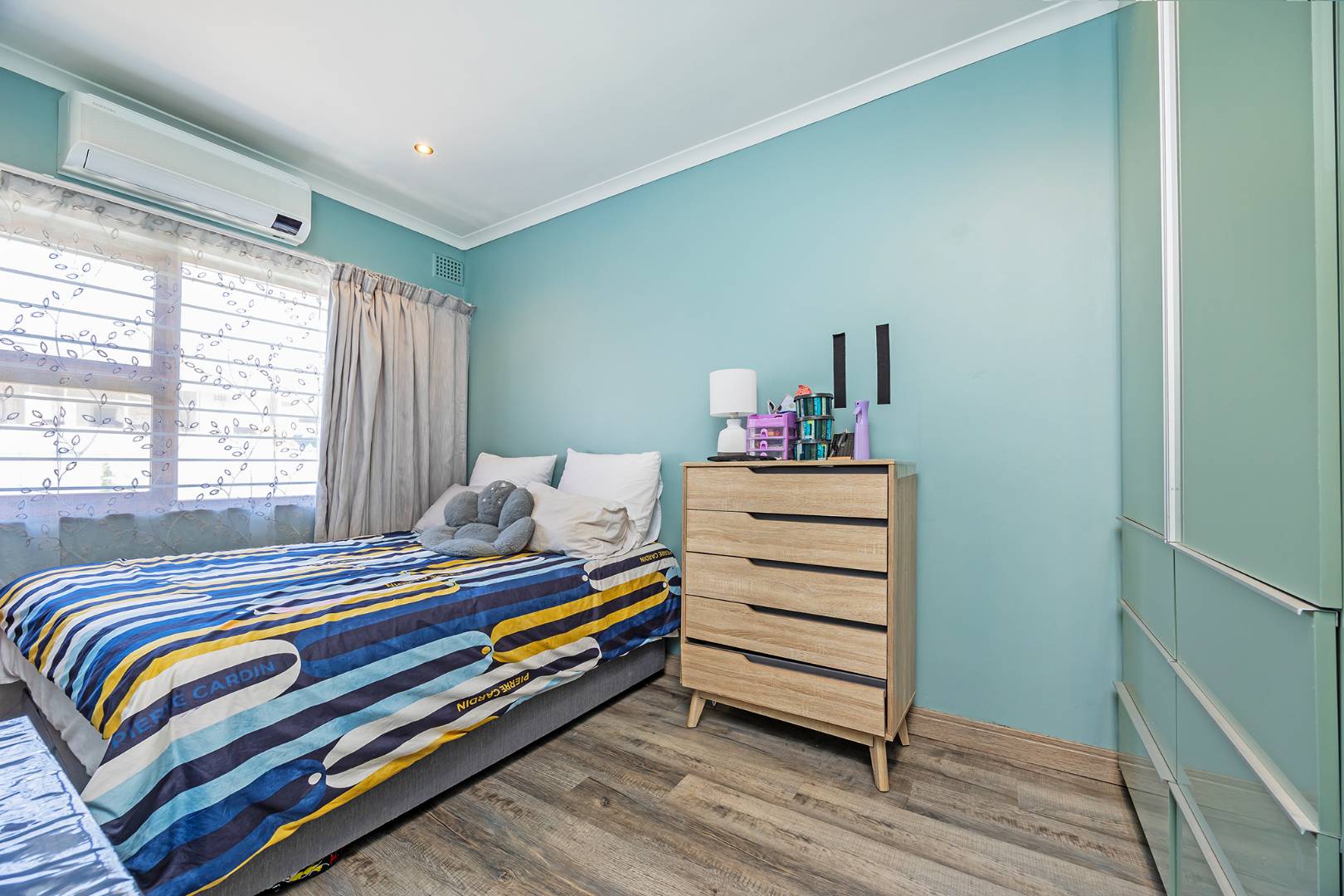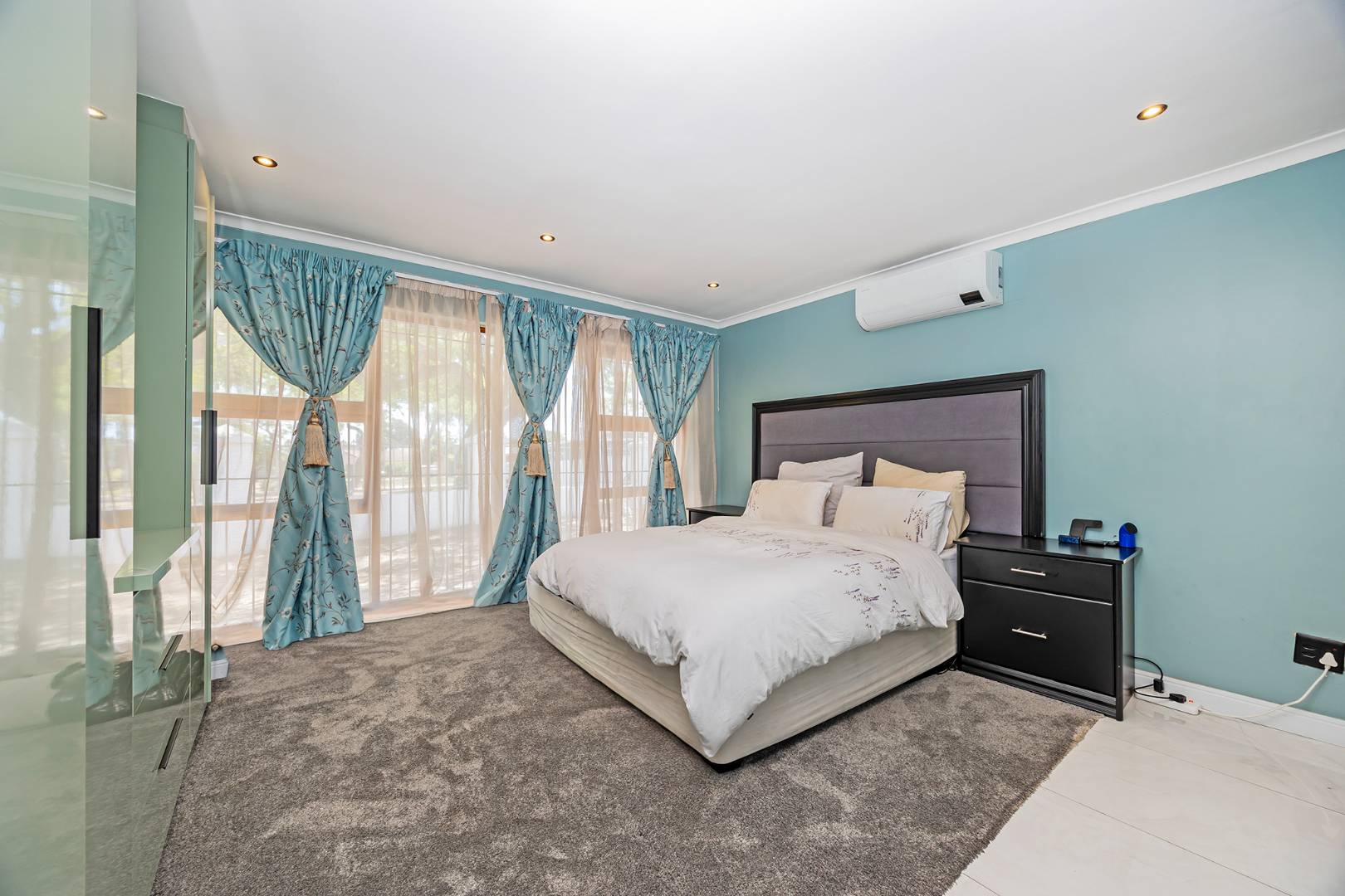 The front section of the home hosts a luxurious main suite with a walk-through dressing area and a stunning modern bathroom. This space offers exciting flexibility and can easily be adapted into a private apartment for extended family, guests, or rental potential, complete with an additional smaller kitchen to create a fully functional and self-contained living space. The remaining four well-sized bedrooms are thoughtfully positioned, featuring vinyl flooring, excellent security with burglar bars, and beautifully finished bathrooms with refined, modern touches. The main suite also enjoys its own private dressing room and air-conditioning for year-round comfort.