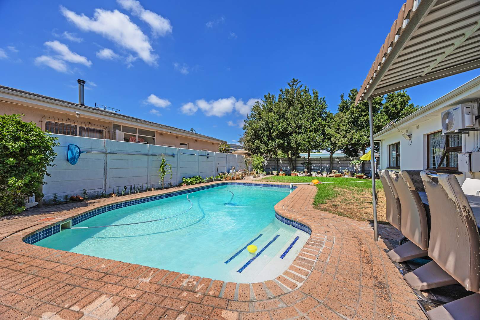 Outdoors, the paved backyard complements a lovely established garden with mature trees, a large sparkling pool, and generous lawn space ideal for children and pets. Off-street parking comfortably accommodates up to four vehicles in addition to the double garage.