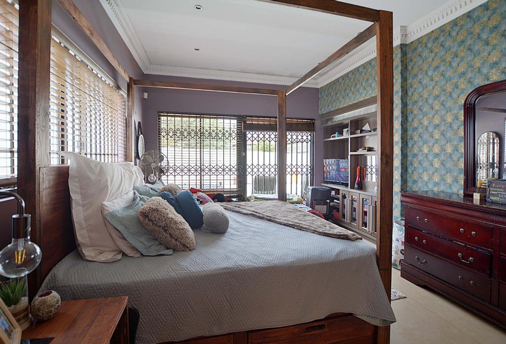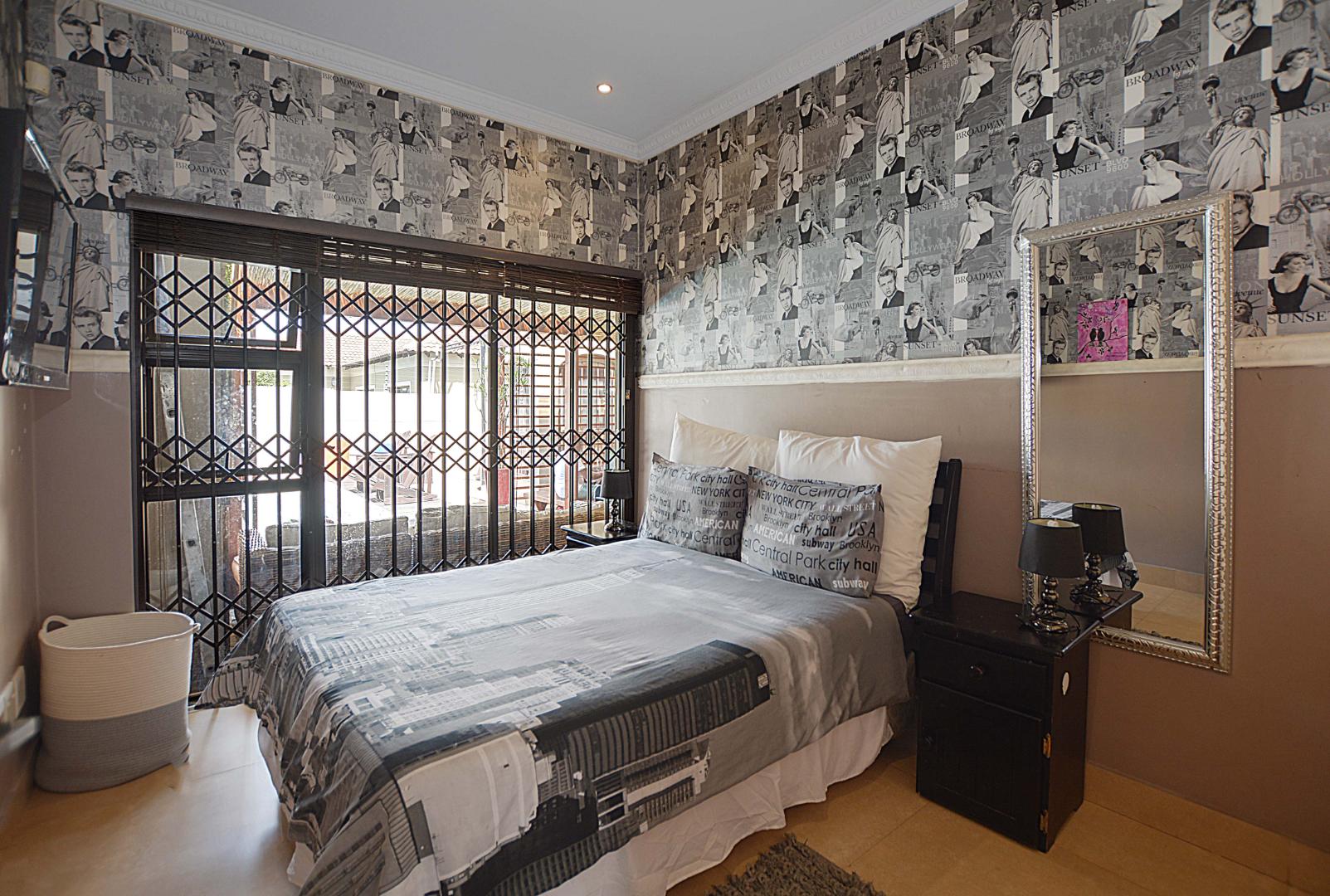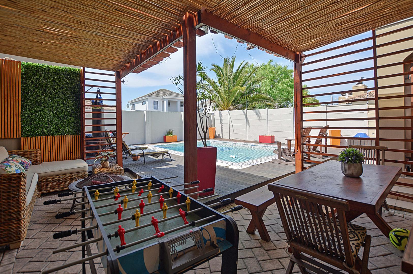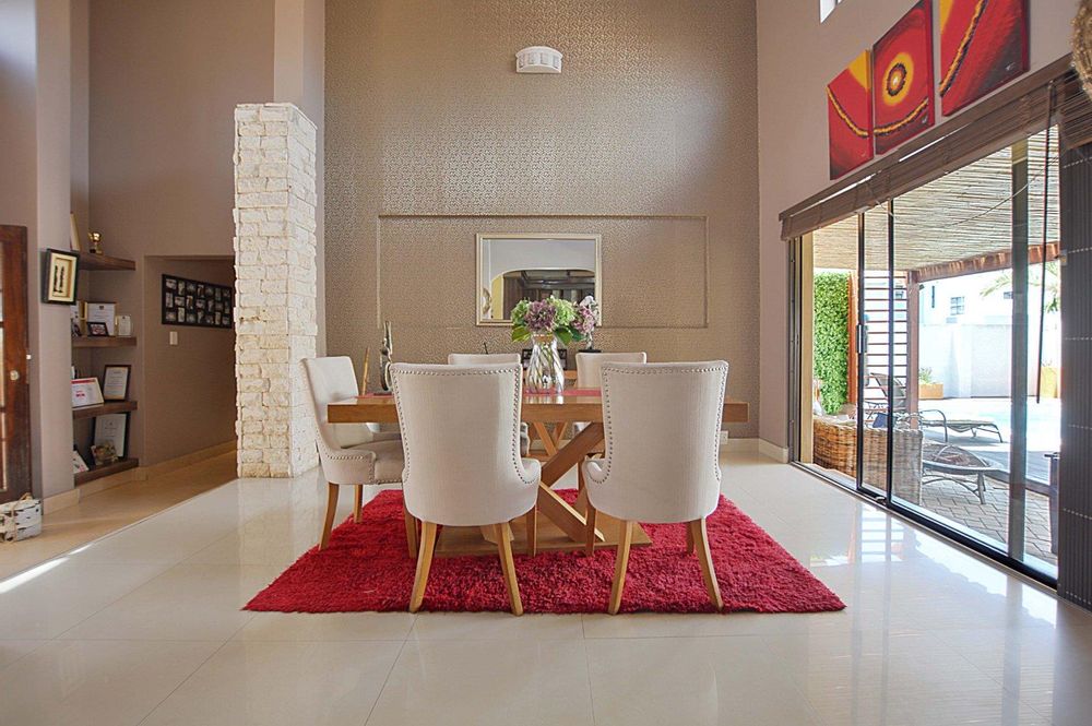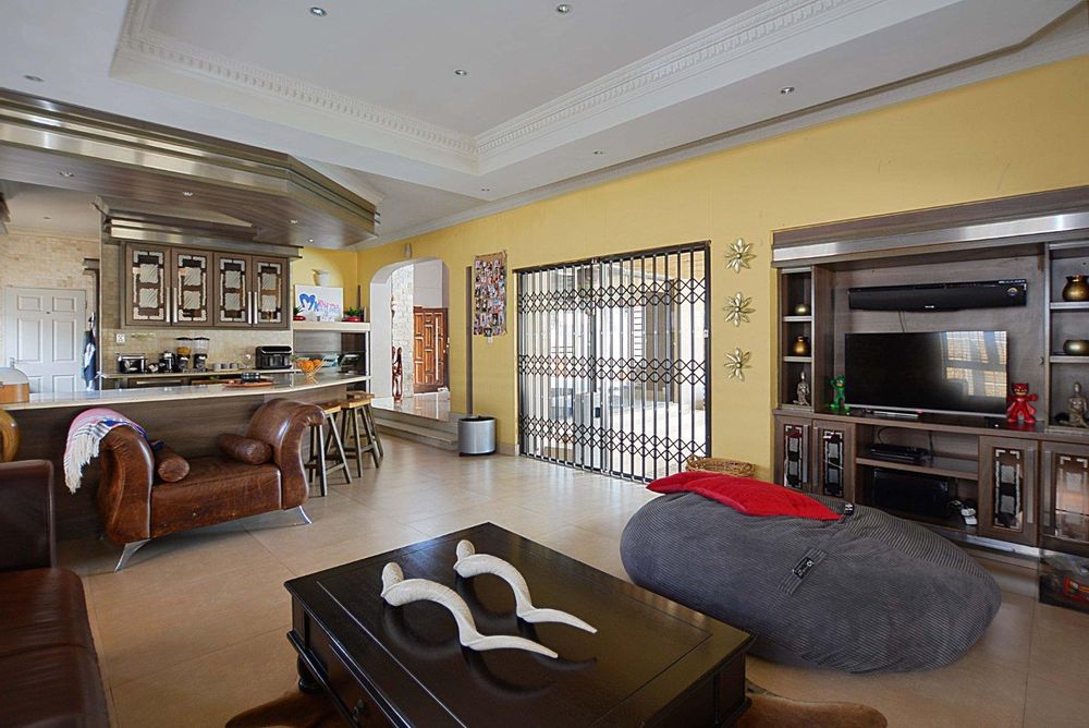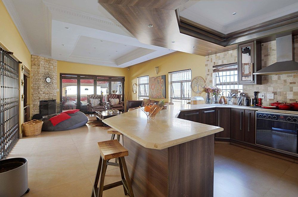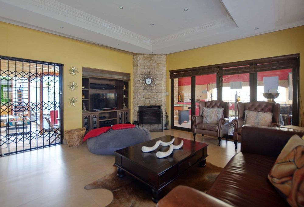 The open-plan lounge is bright and inviting, featuring a cozy fireplace, detailed ceilings, and access to the pool through another set of sliding doors. It leads into the braai room, which can be opened with stacker doors for ultimate entertaining.