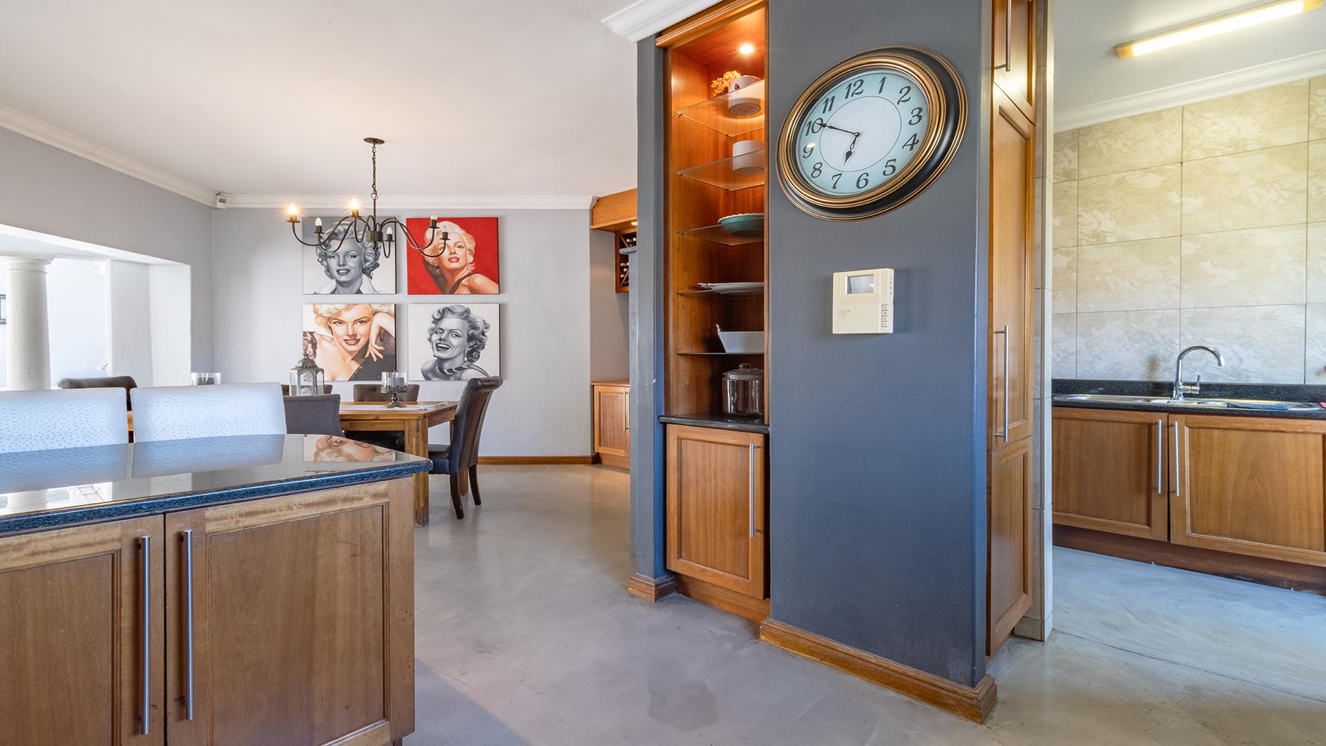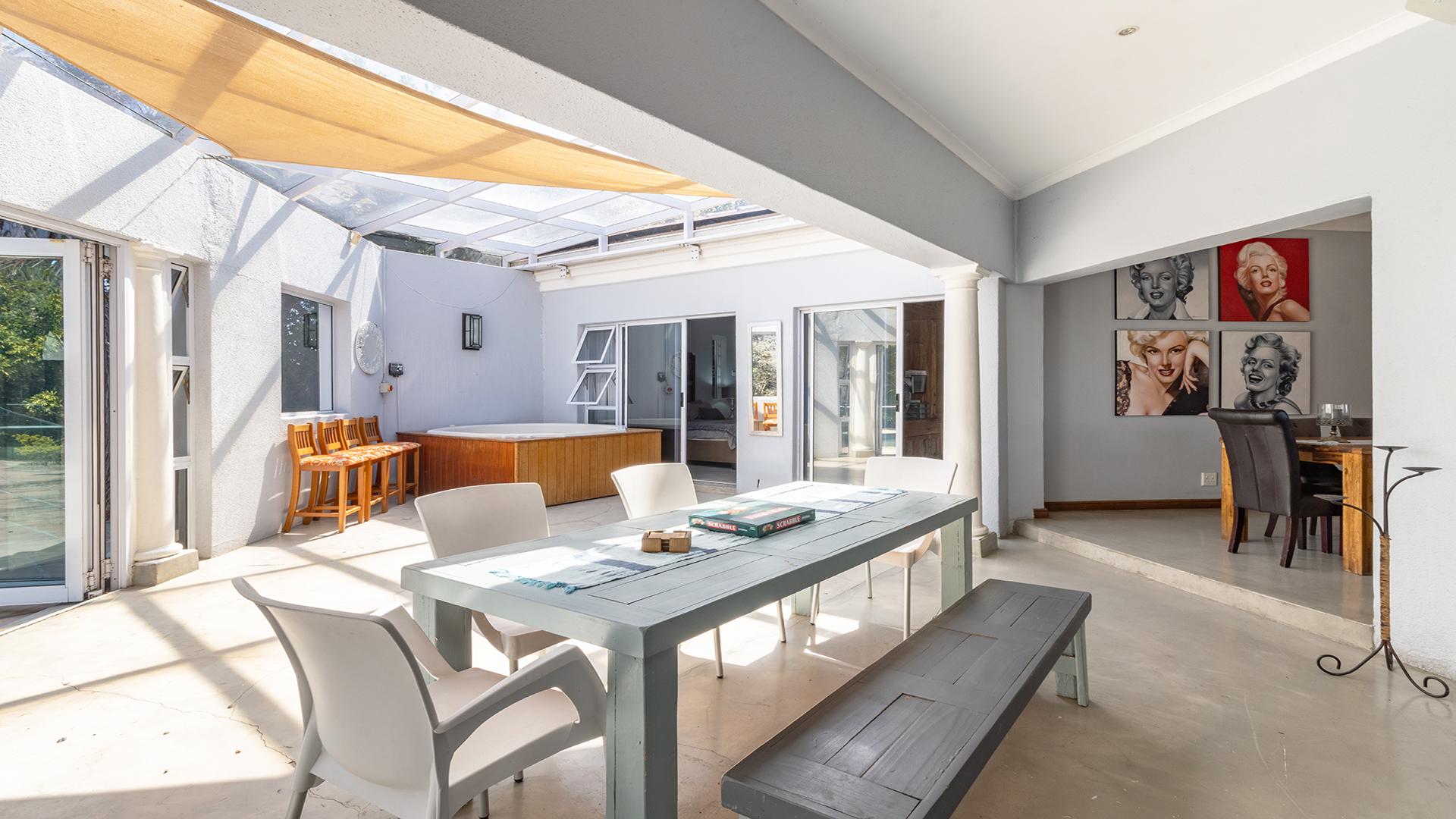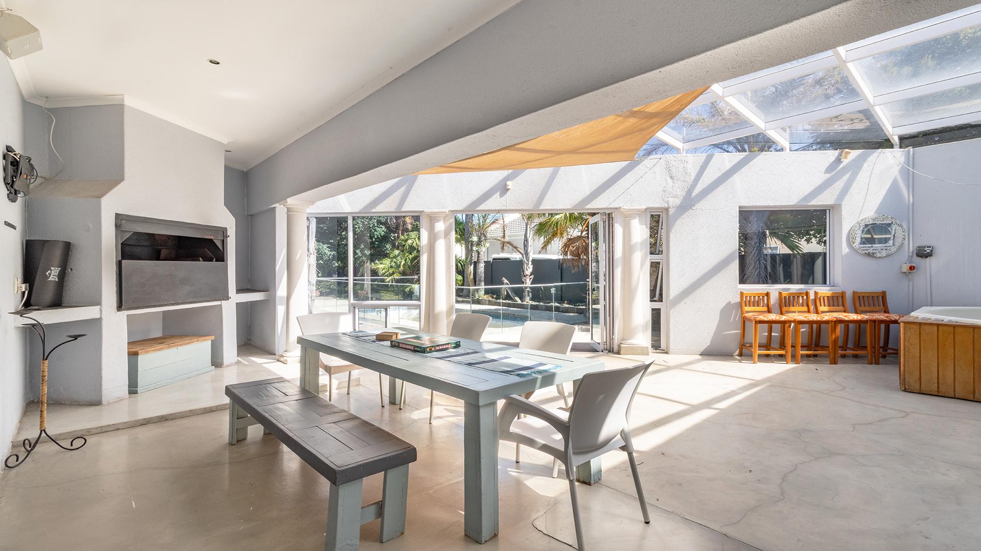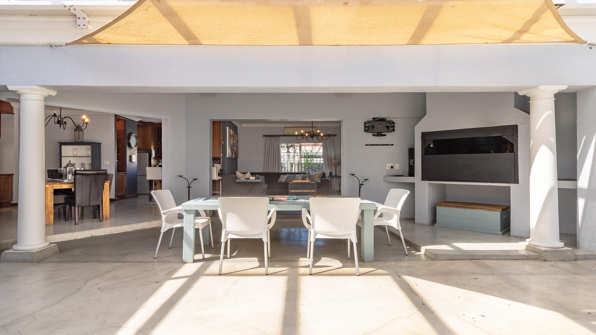 The open-plan kitchen features a gas stove, electric oven, and ample workspace, complemented by a separate scullery for added convenience. Overlooking the dining area, the kitchen flows naturally into the enclosed entertainment space — the perfect setting for hosting friends and family. Here you’ll find a built-in braai and jacuzzi, making year-round entertaining a pleasure.