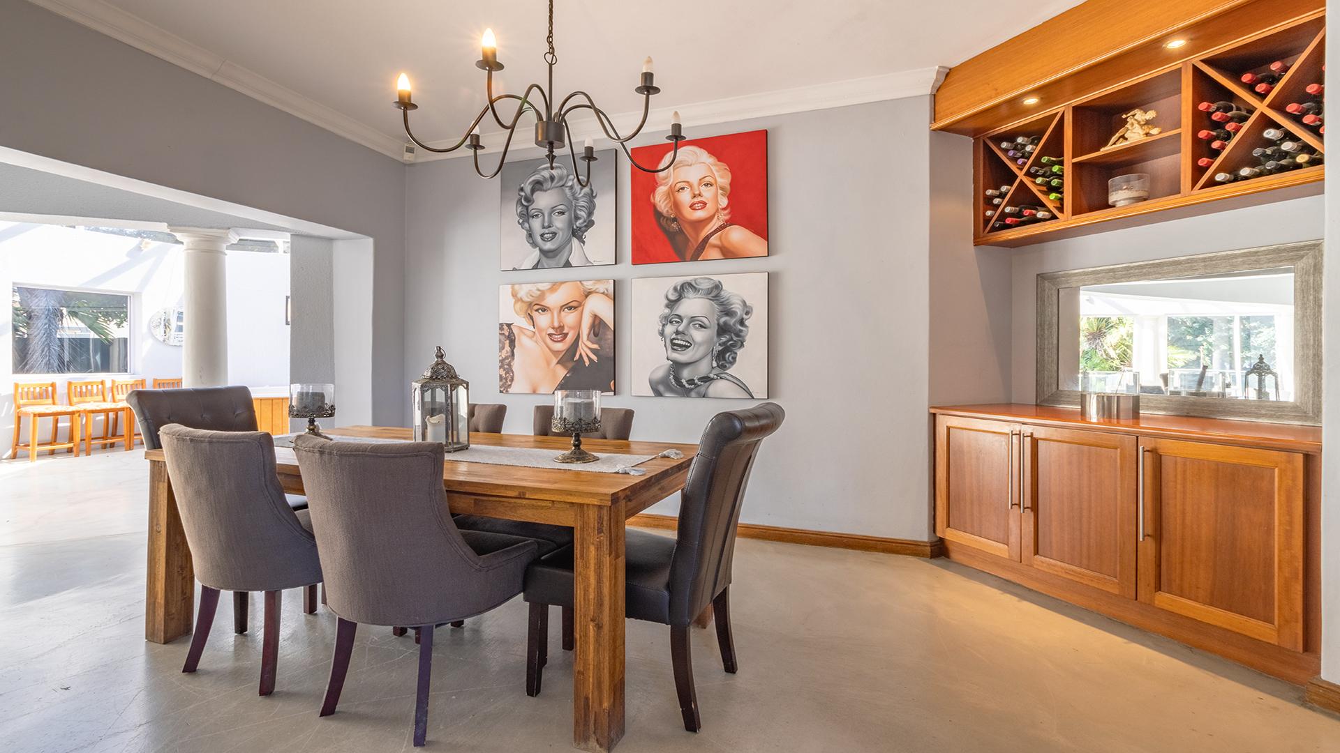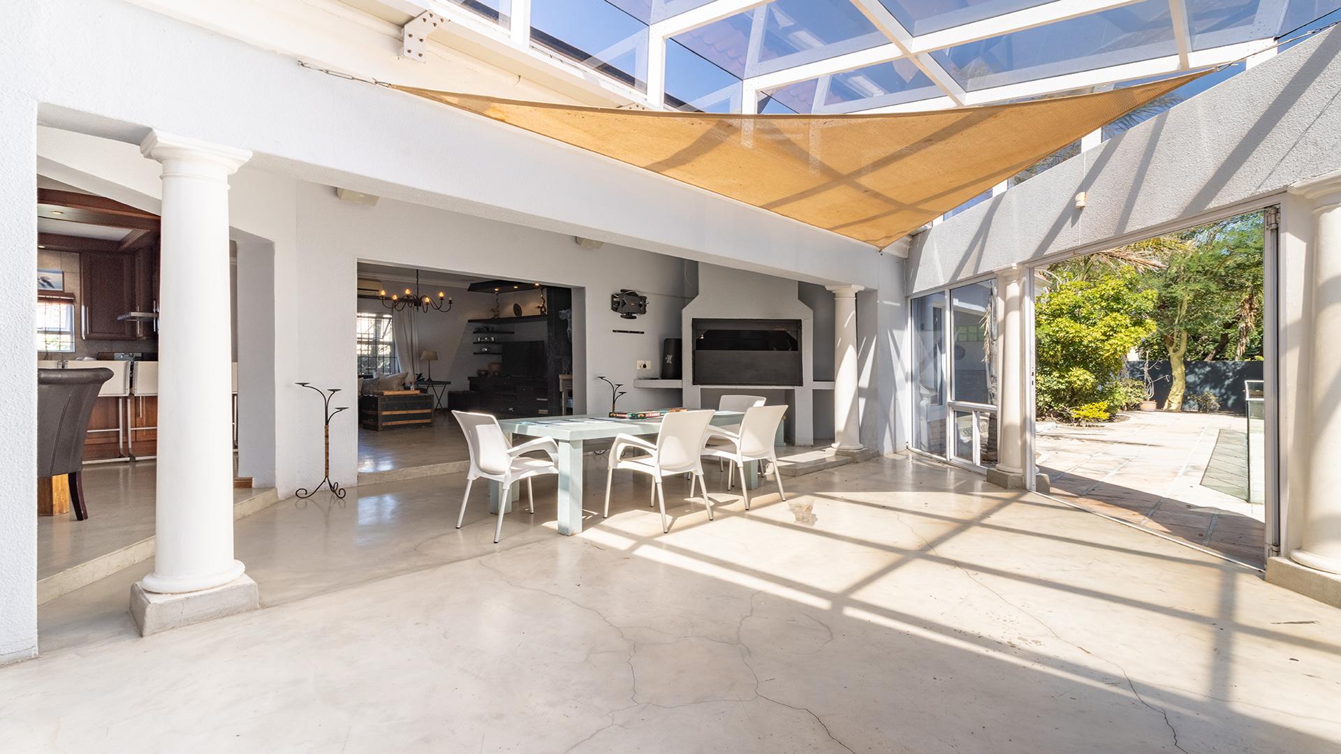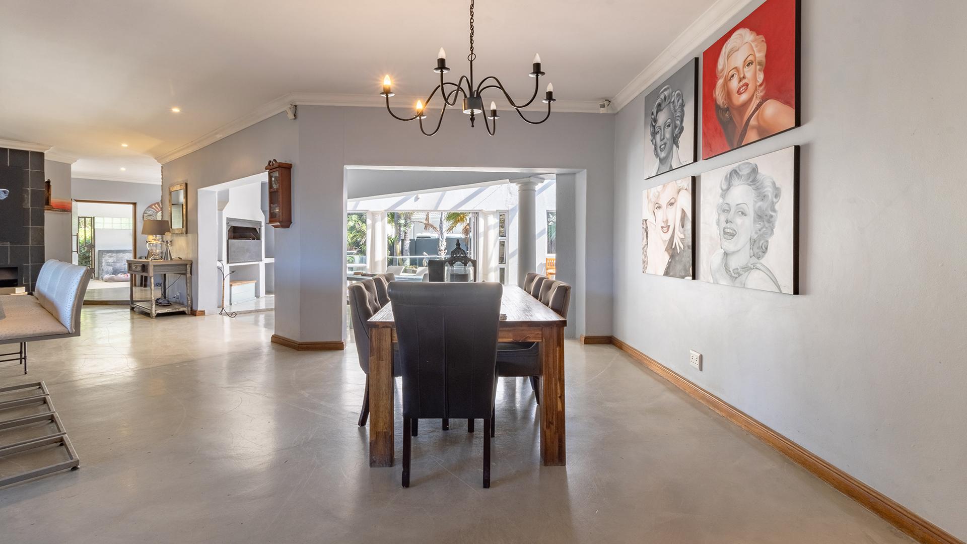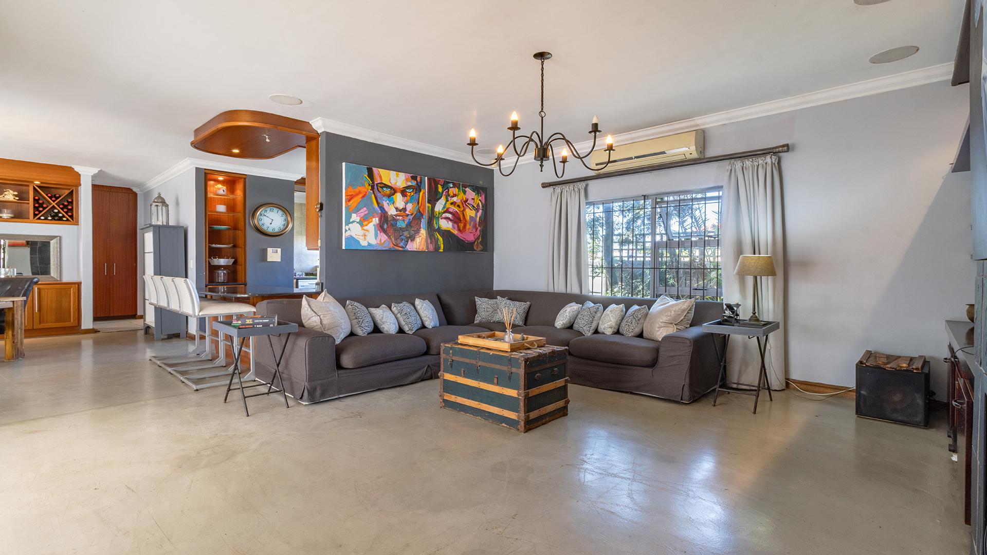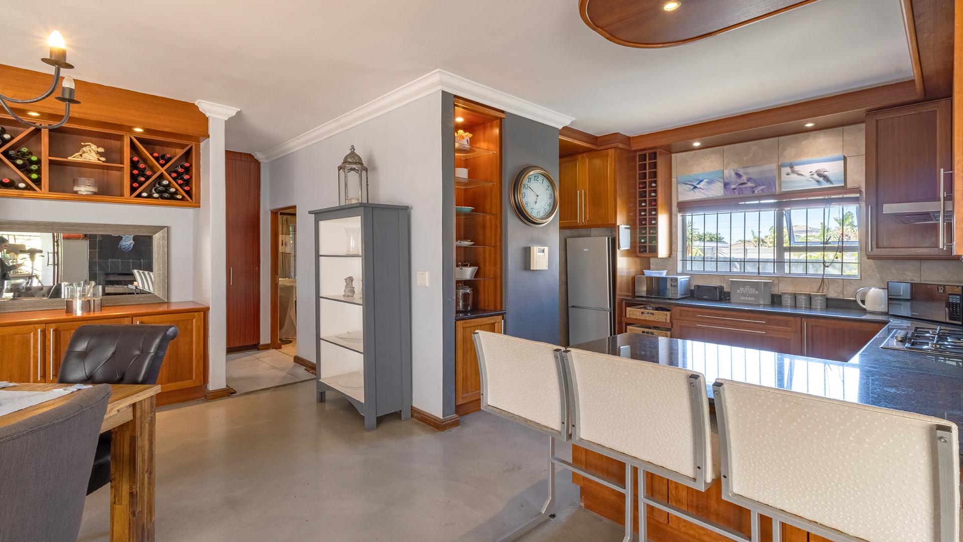 The open-plan kitchen features a gas stove, electric oven, and ample workspace, complemented by a separate scullery for added convenience. Overlooking the dining area, the kitchen flows naturally into the enclosed entertainment space — the perfect setting for hosting friends and family. Here you’ll find a built-in braai and jacuzzi, making year-round entertaining a pleasure.