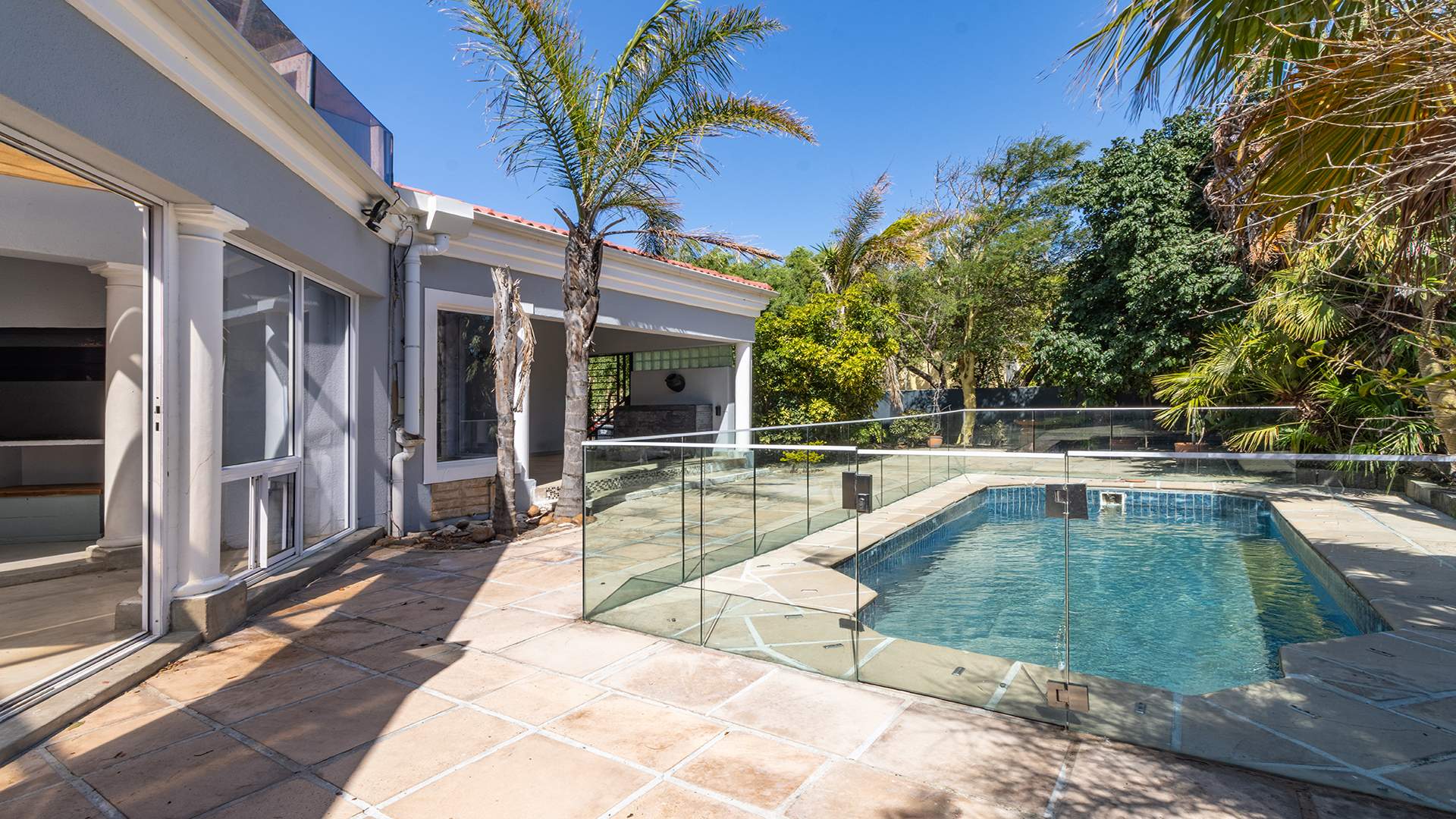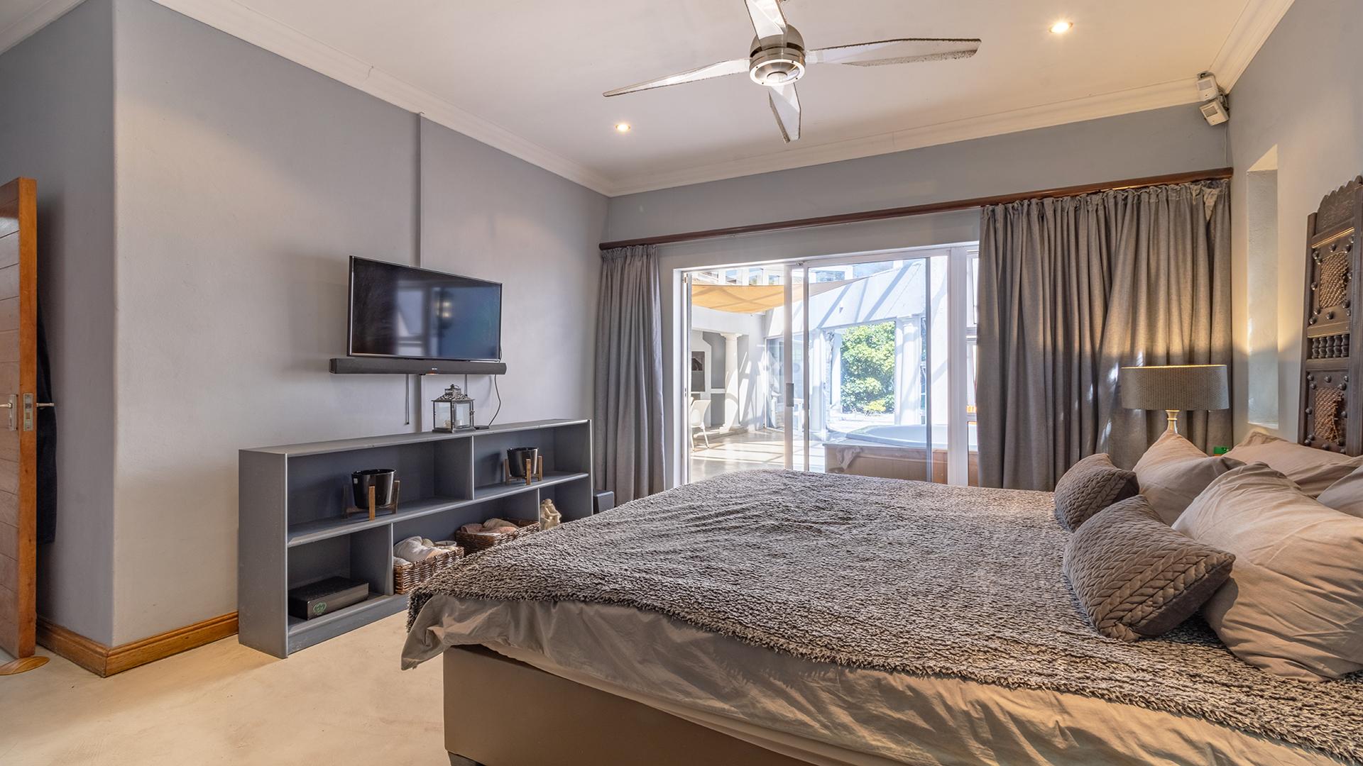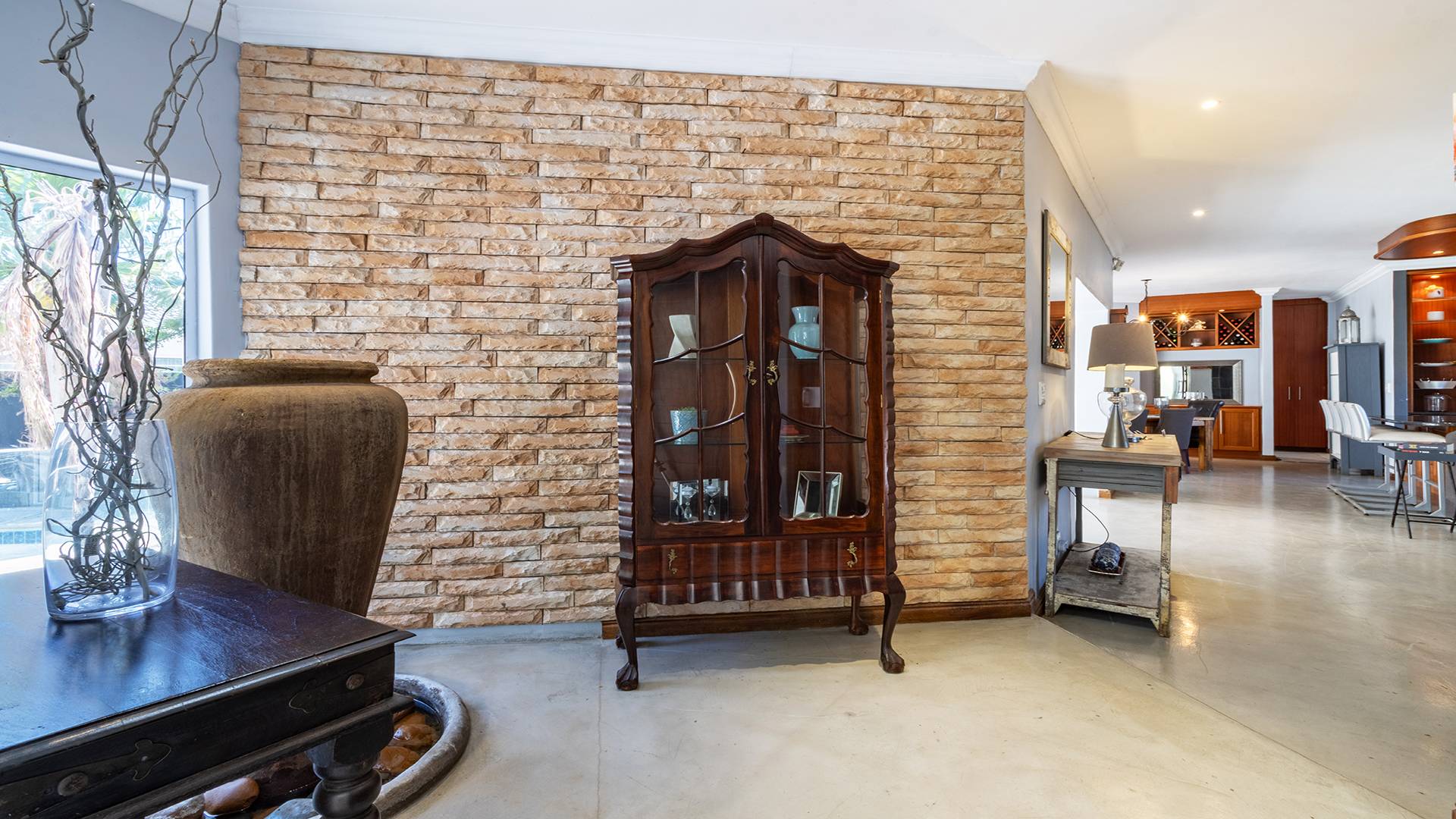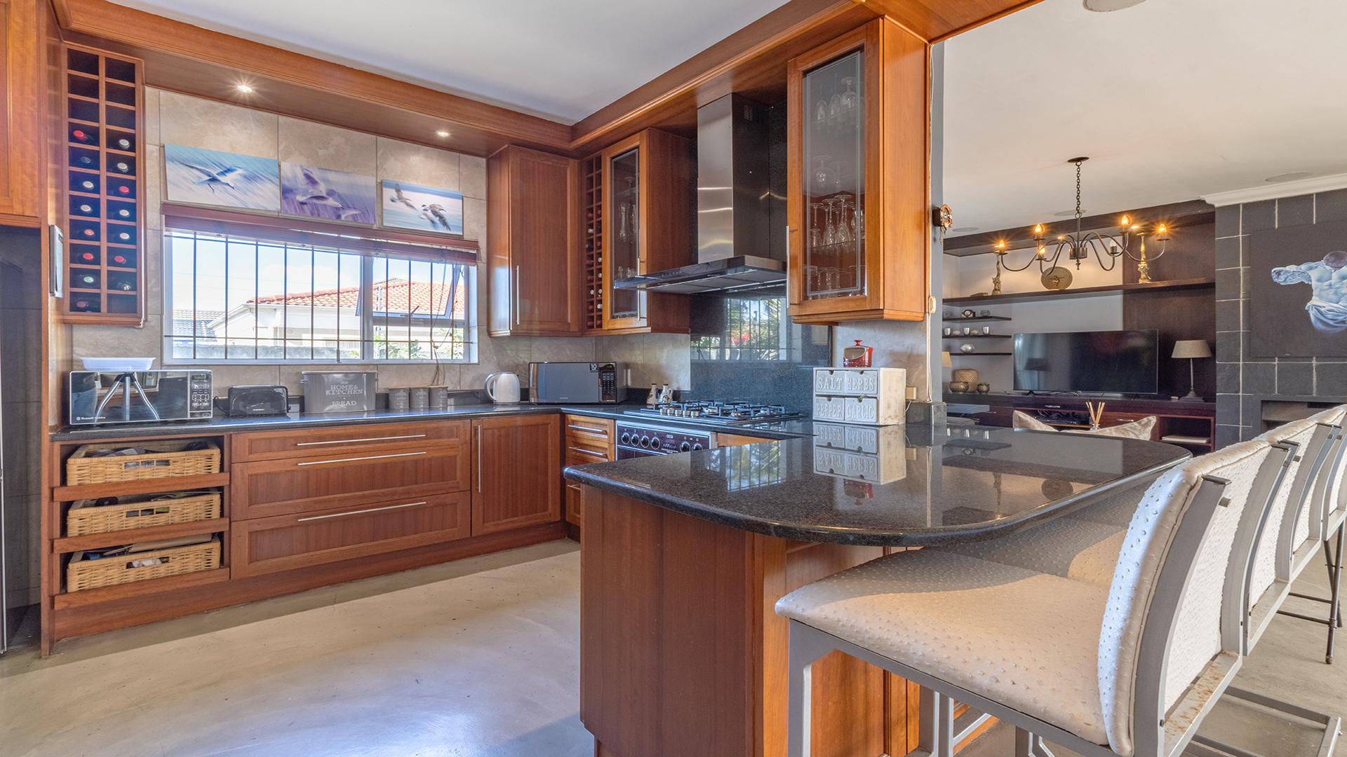 The open-plan kitchen features a gas stove, electric oven, and ample workspace, complemented by a separate scullery for added convenience. Overlooking the dining area, the kitchen flows naturally into the enclosed entertainment space — the perfect setting for hosting friends and family. Here you’ll find a built-in braai and jacuzzi, making year-round entertaining a pleasure.