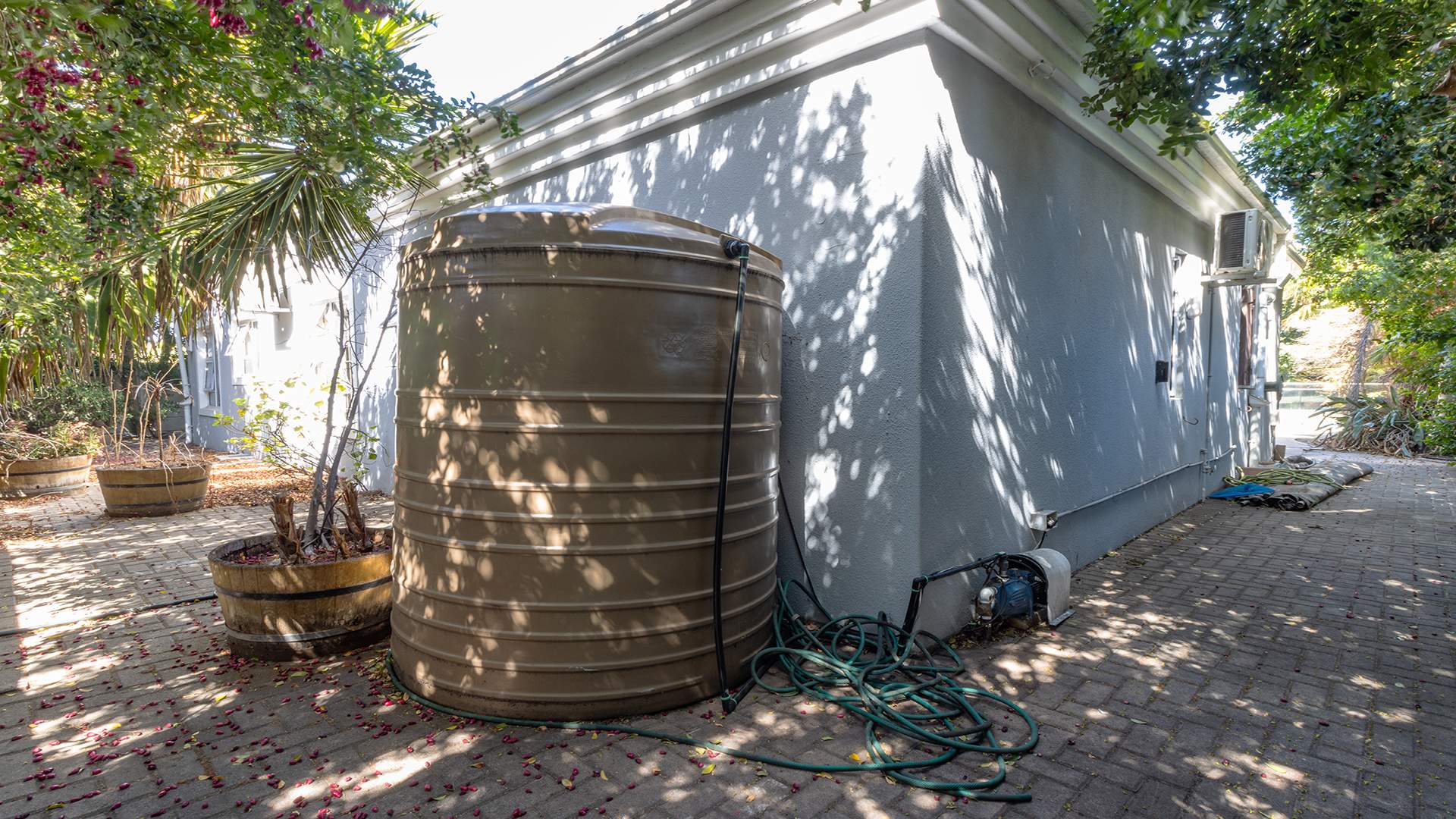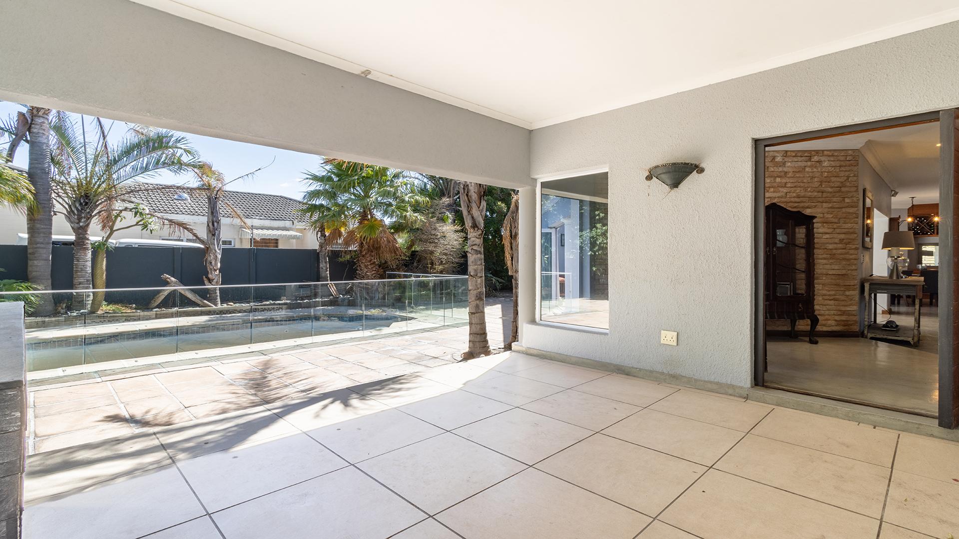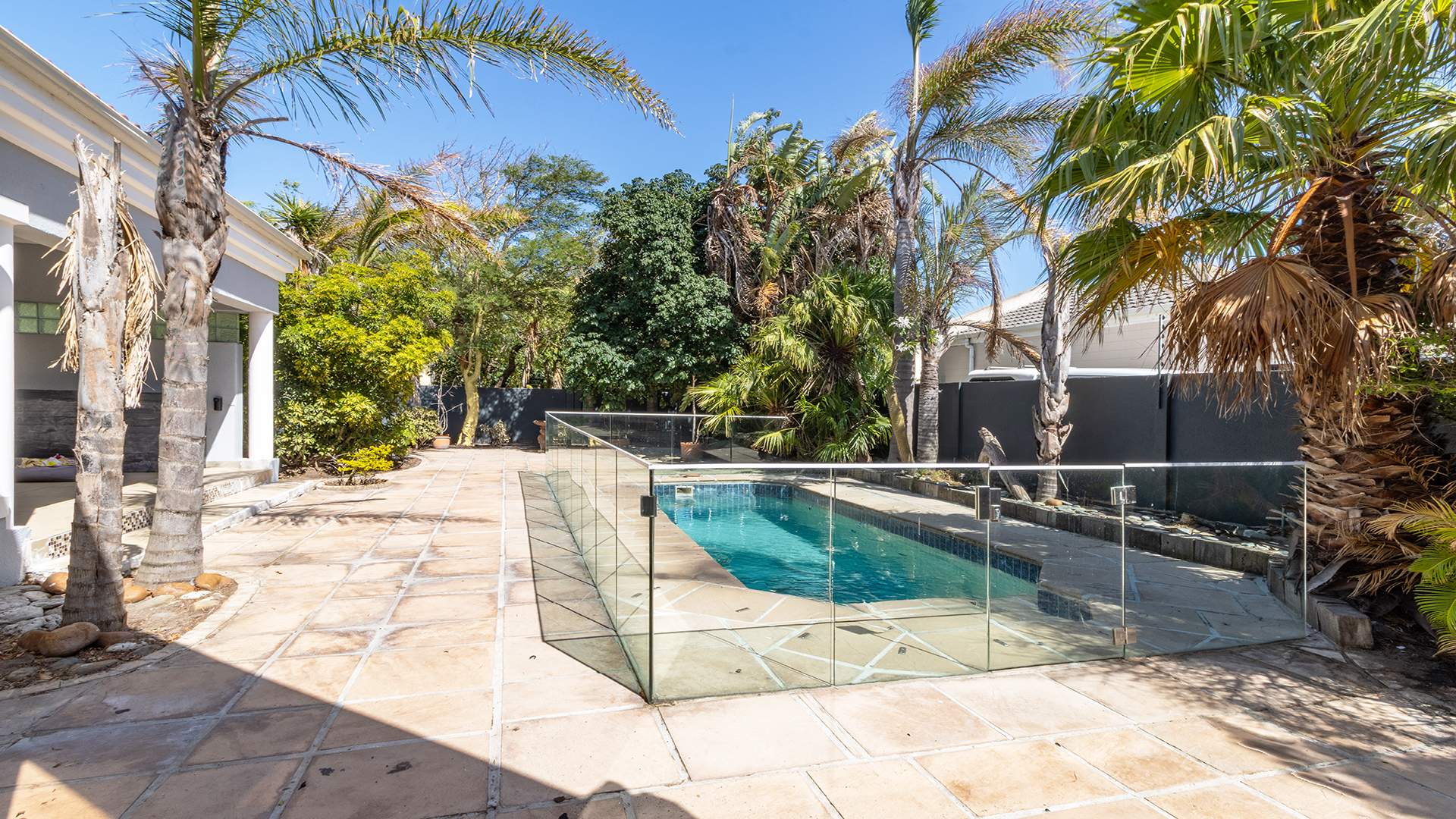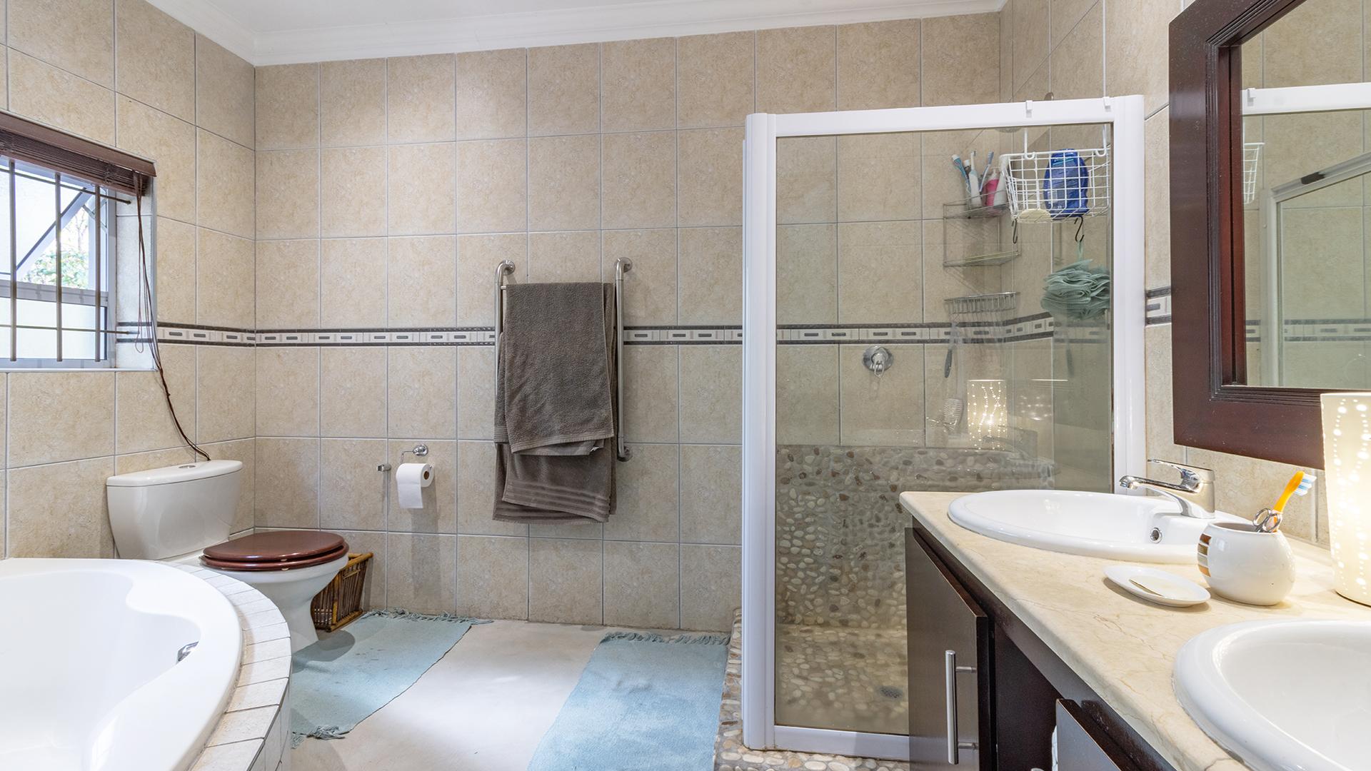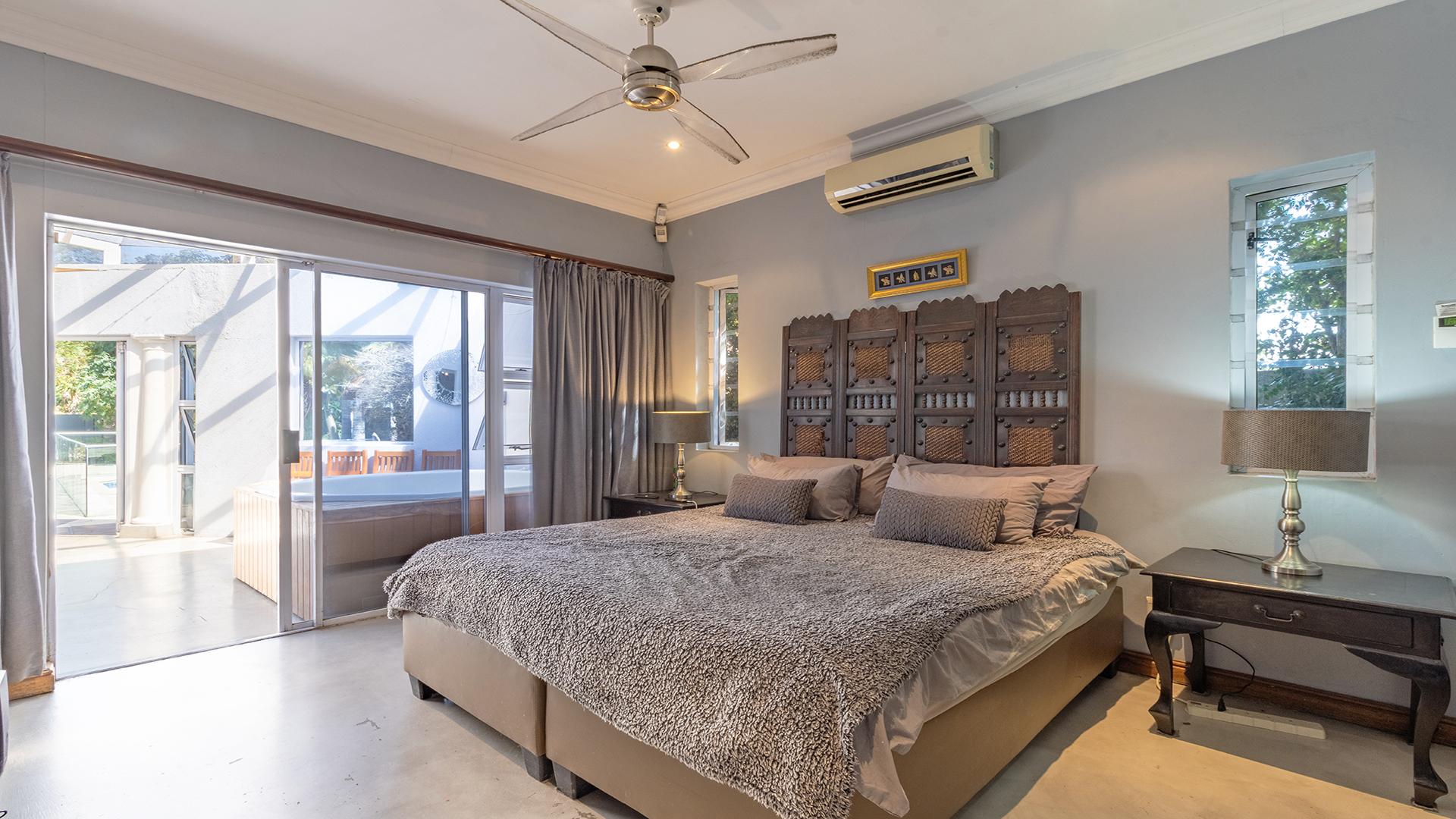 The open-plan kitchen features a gas stove, electric oven, and ample workspace, complemented by a separate scullery for added convenience. Overlooking the dining area, the kitchen flows naturally into the enclosed entertainment space — the perfect setting for hosting friends and family. Here you’ll find a built-in braai and jacuzzi, making year-round entertaining a pleasure.