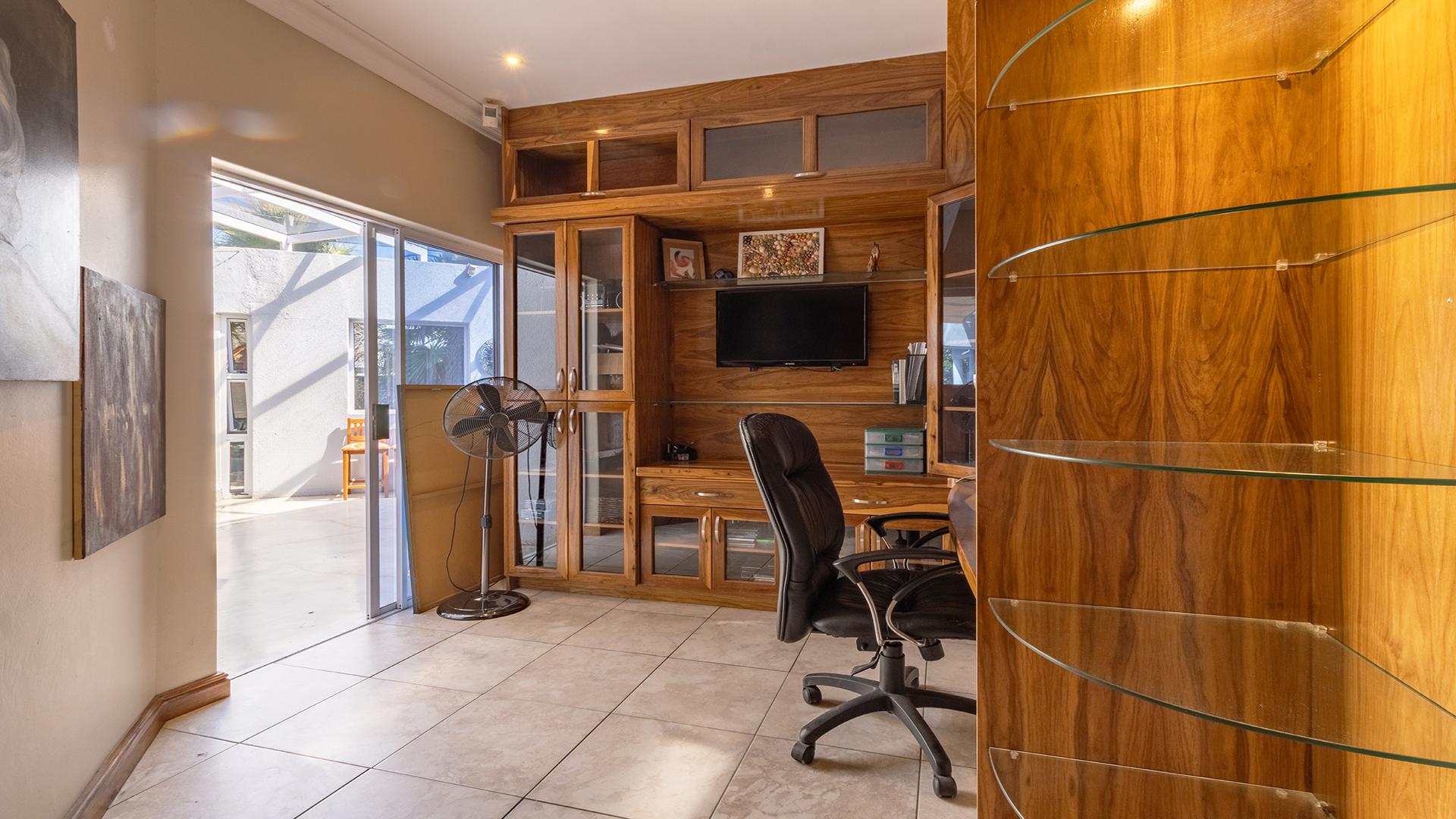 Accommodation includes three generously sized bedrooms, all with built-in cupboards. The main bedroom boasts plenty of cupboard space and a full en-suite bathroom, while the additional bedrooms are well proportioned and serviced by a second bathroom. A separate office with built-in cupboards provides an excellent work-from-home solution or study space.