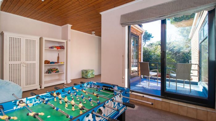 Leafy Silver Mile Rondebosch living with north-facing patio shaded by oak trees, Table Mountain balcony views, island kitchen for entertaining, communal pool — three ensuite bedrooms and single garage.