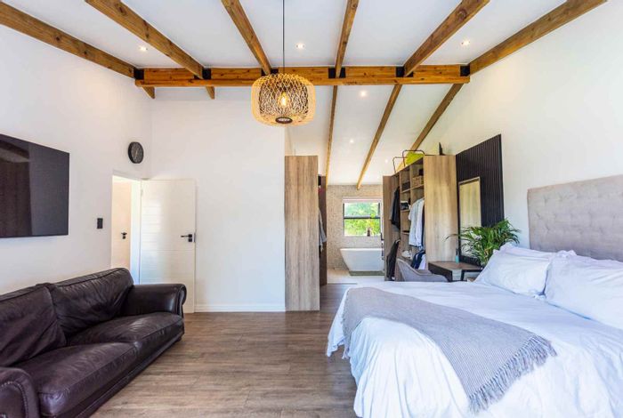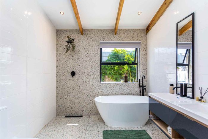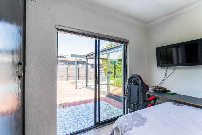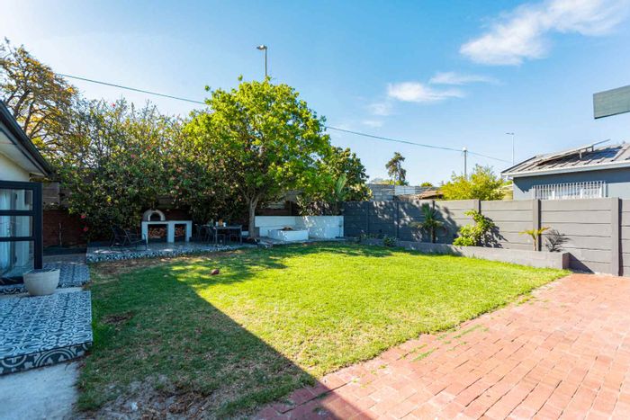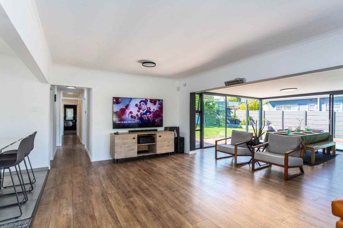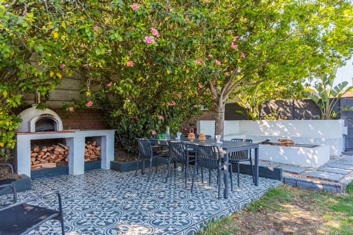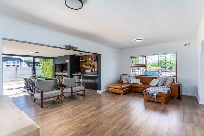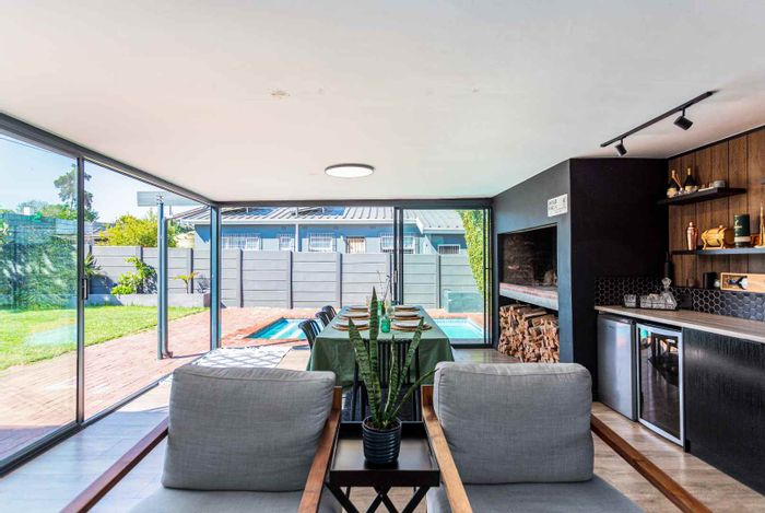 Entertainer's dream in a leafy, tree-lined neighbourhood — braai room opening to pool and landscaped garden with wood-fired pizza oven. Five bedrooms, three bathrooms, single garage.