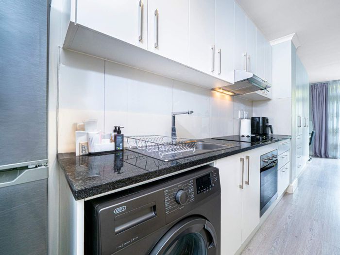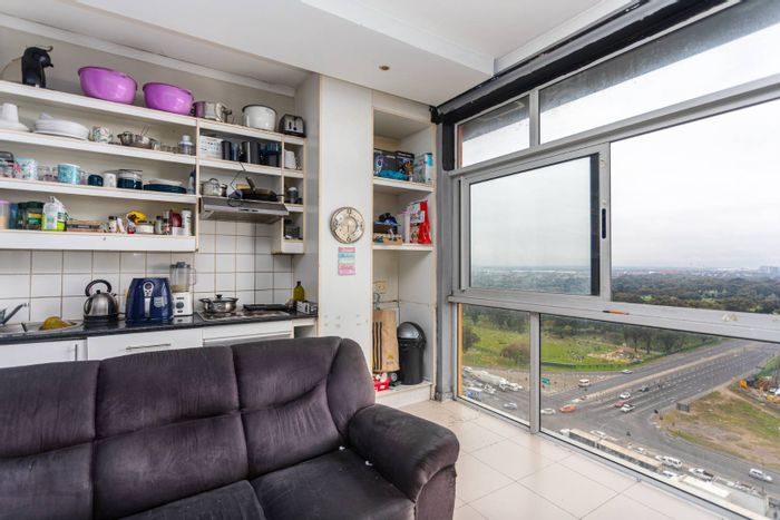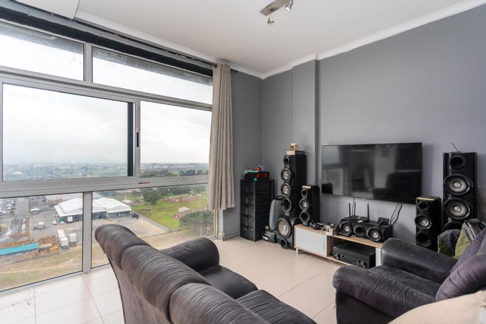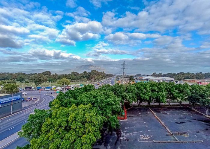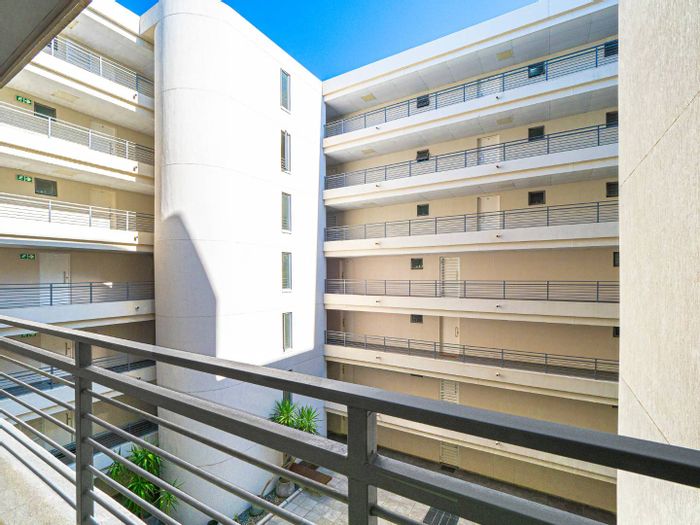 Top-floor Liberty Grande apartment offers city-edge living with sweeping Table Mountain and Century City views, pool and gym access, open-plan kitchen — one bedroom, one bathroom, secure underground parking.