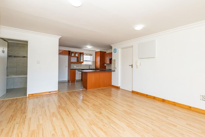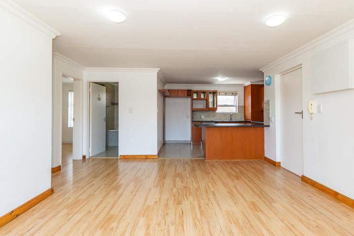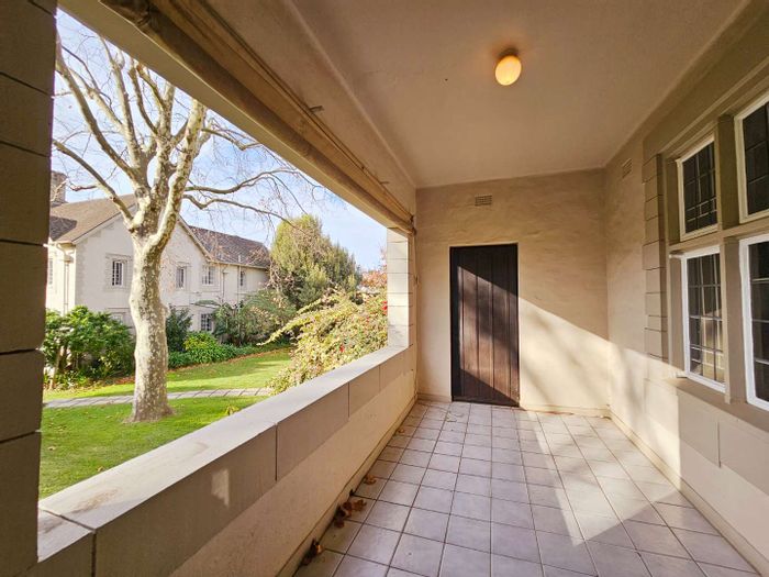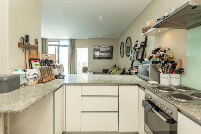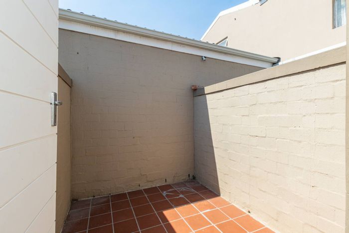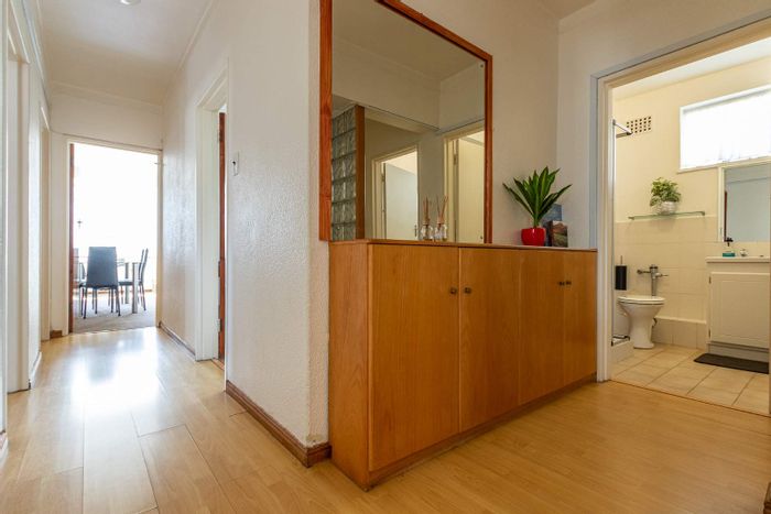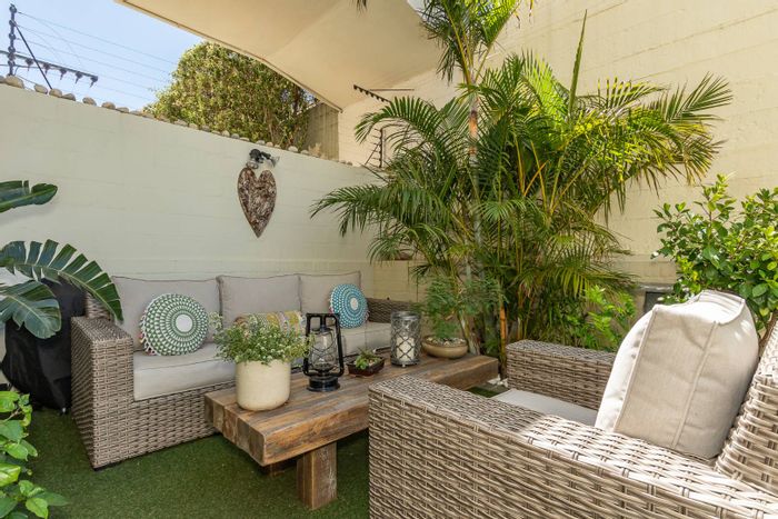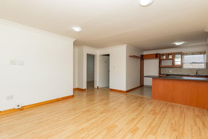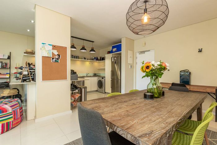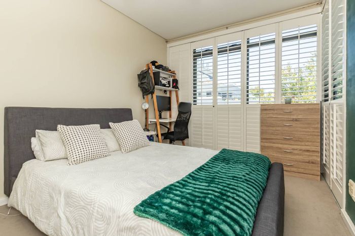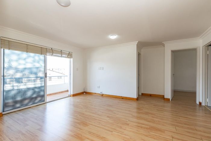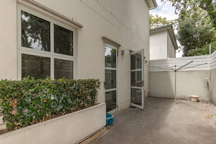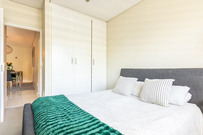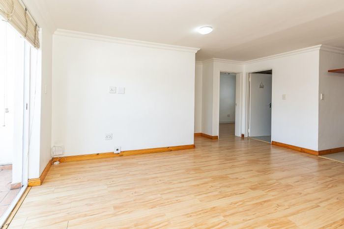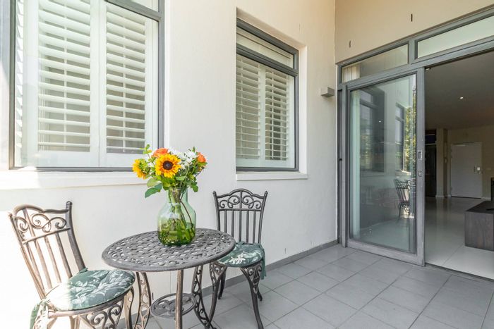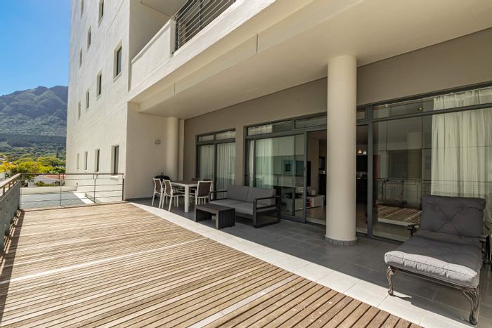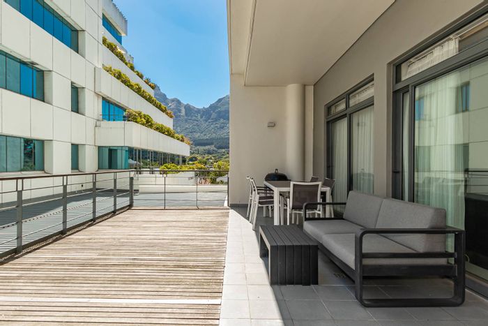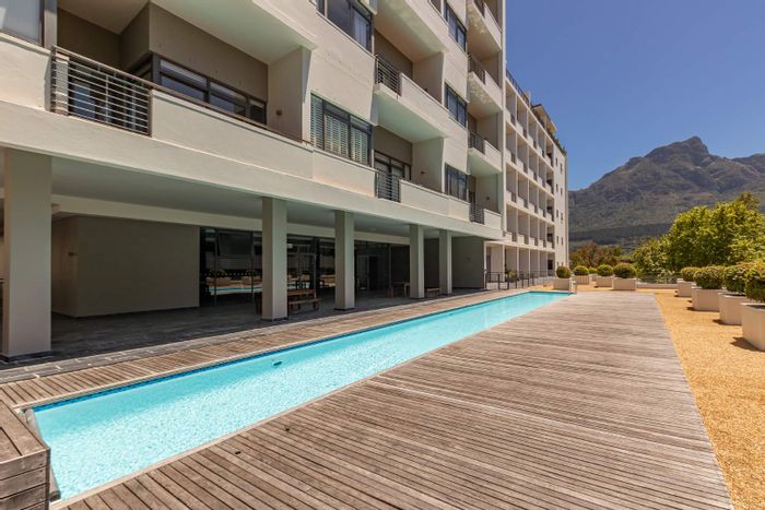 Morning-lit east-facing apartment with patio views of the Hottentot Holland Mountains in Claremont, open-plan living with American shutters, pool, gym and biometric access. 2 beds, 1.5 baths, 2 parking.