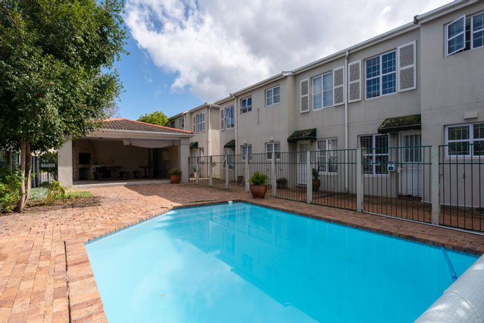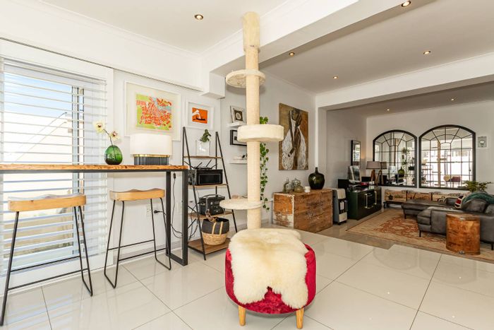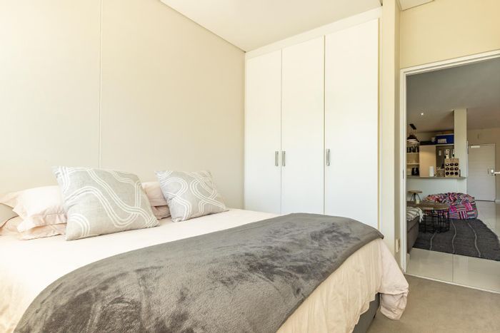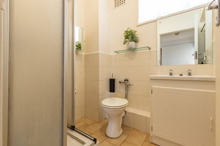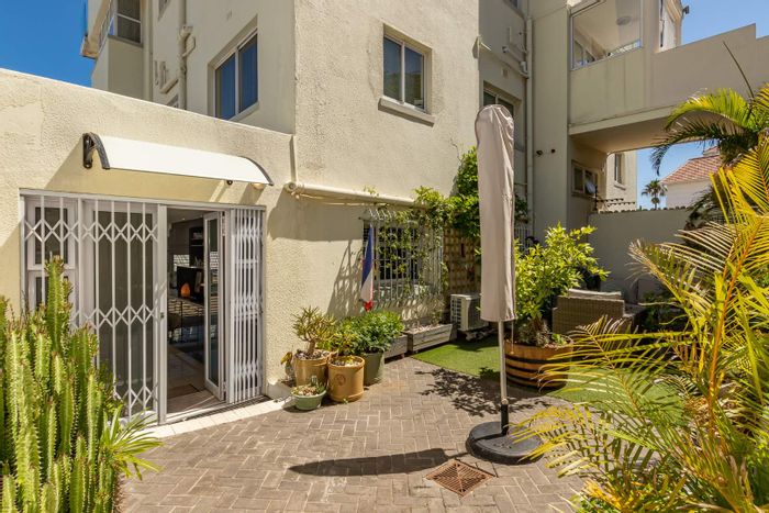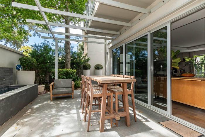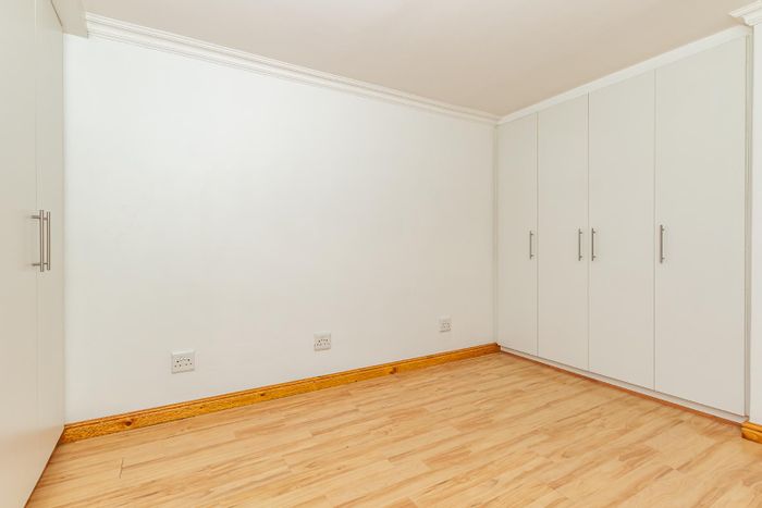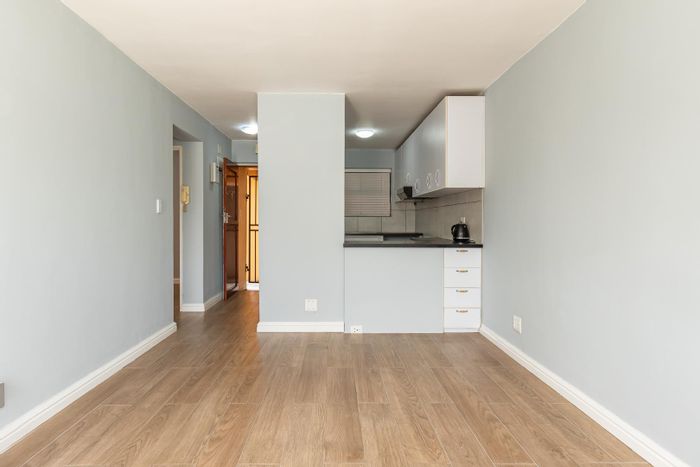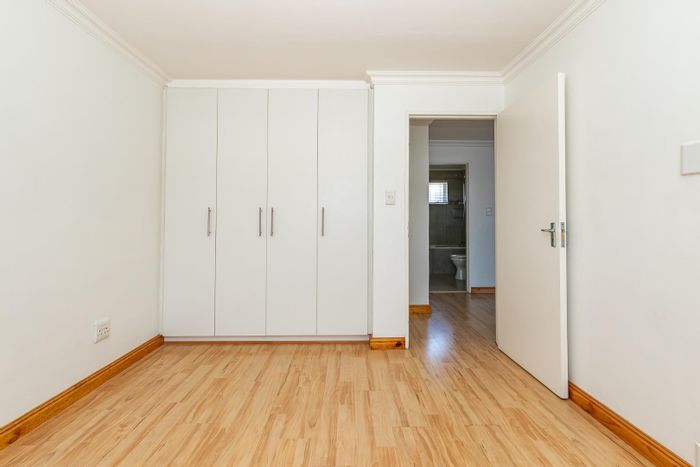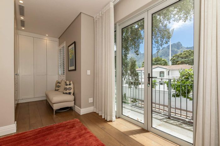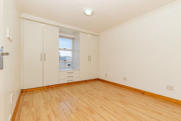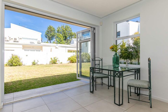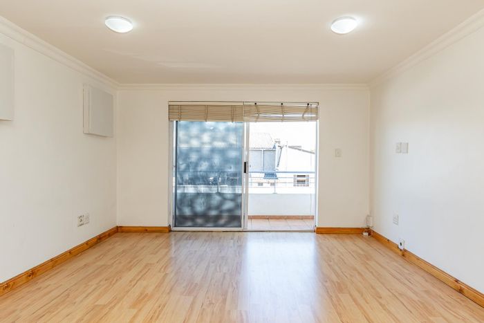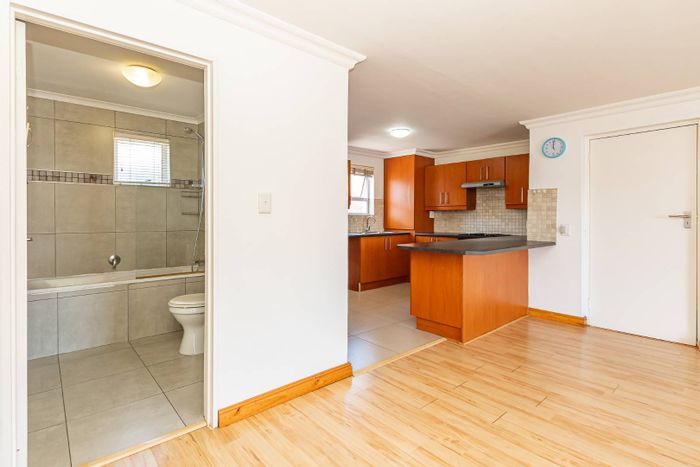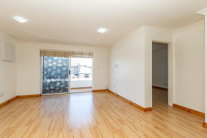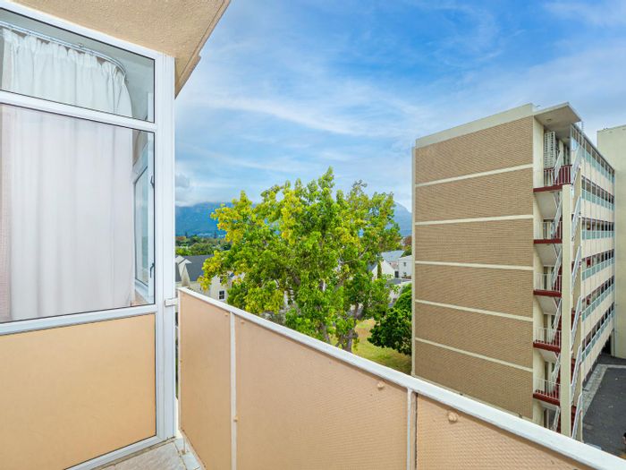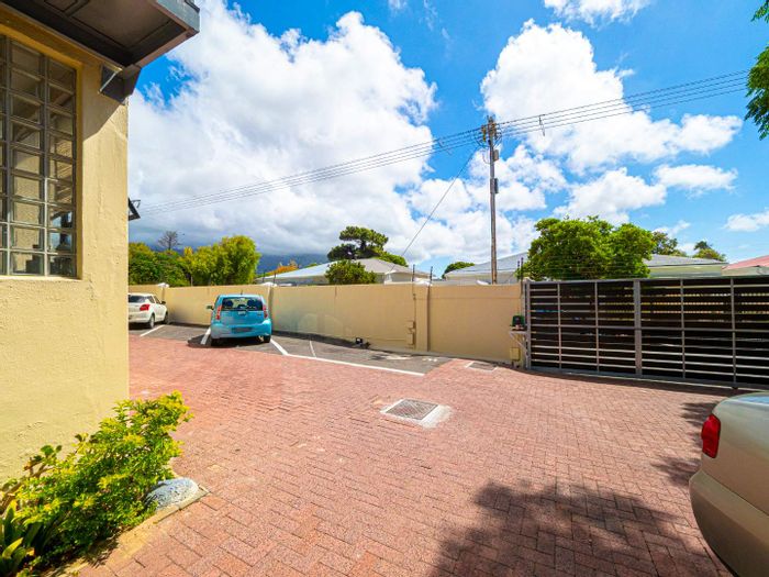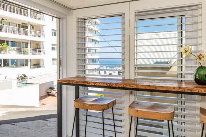 Morning-lit east-facing apartment with patio views of the Hottentot Holland Mountains in Claremont, open-plan living with American shutters, pool, gym and biometric access. 2 beds, 1.5 baths, 2 parking.