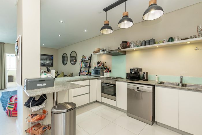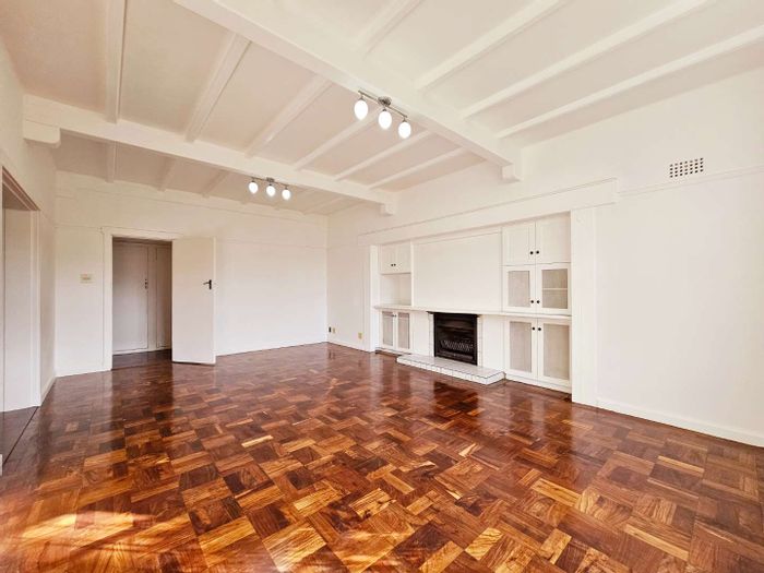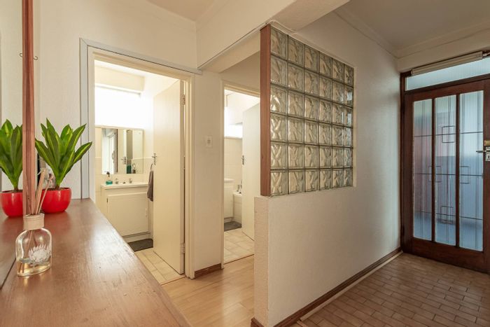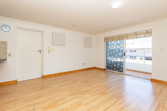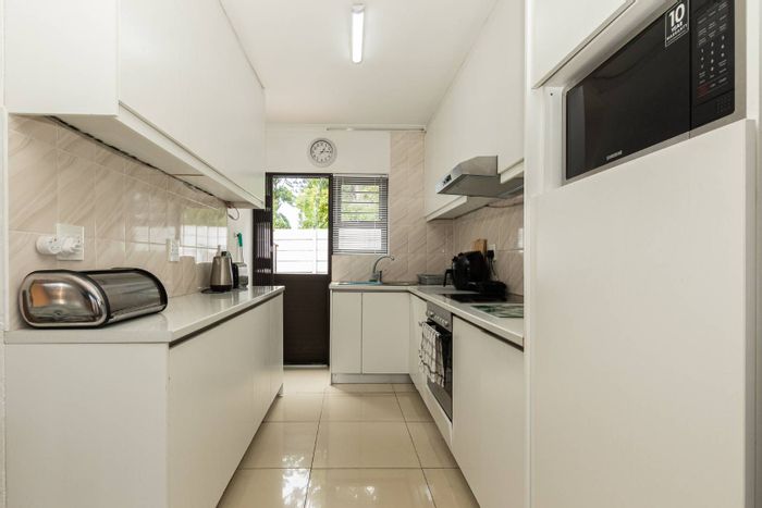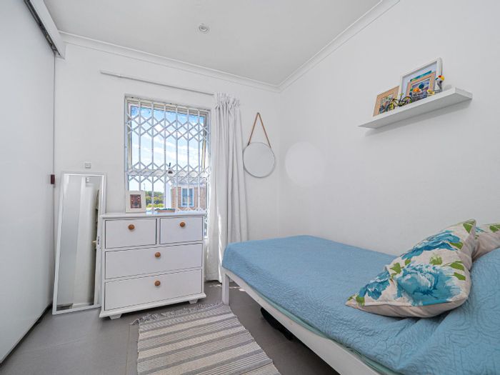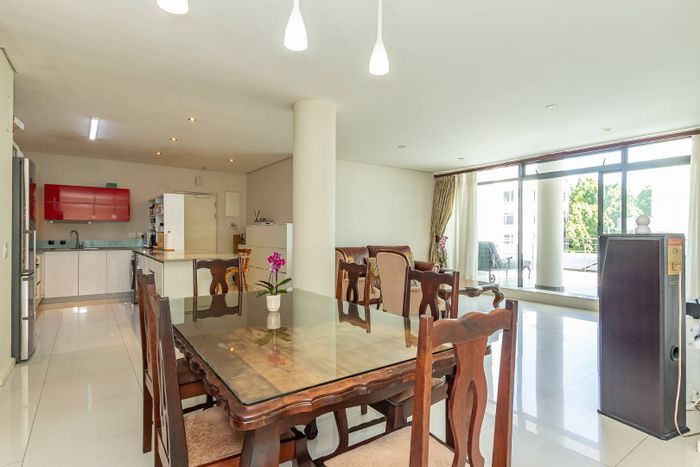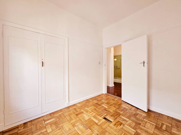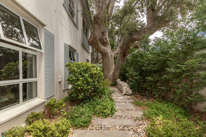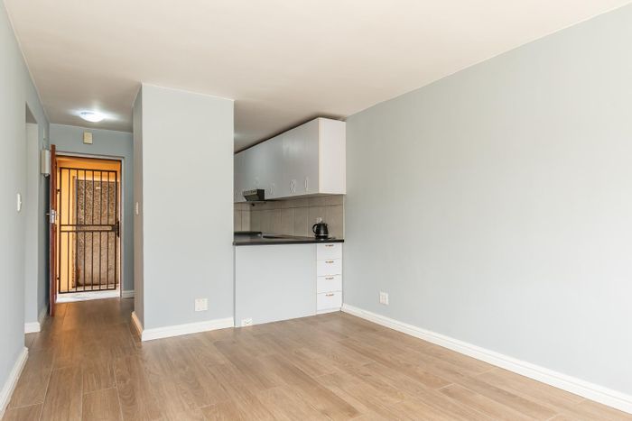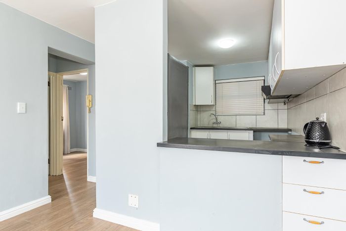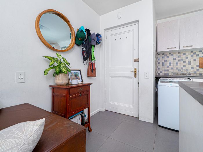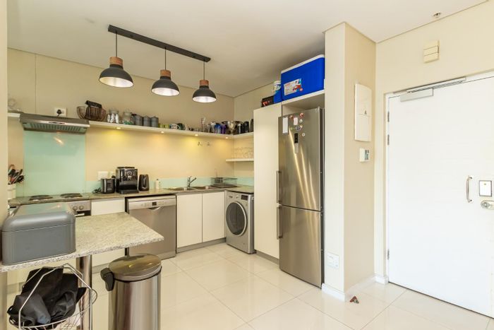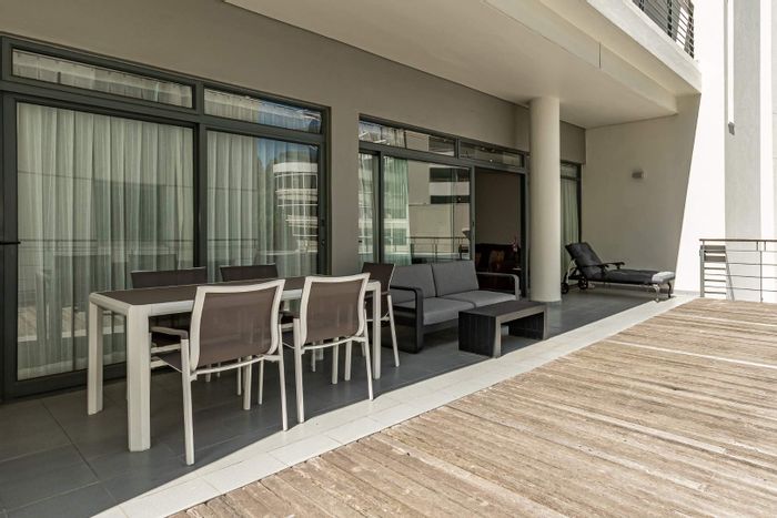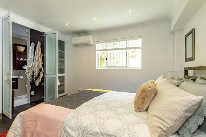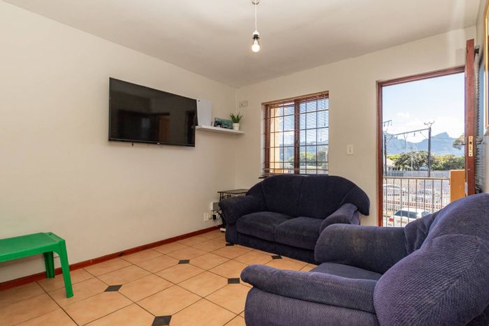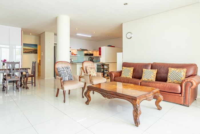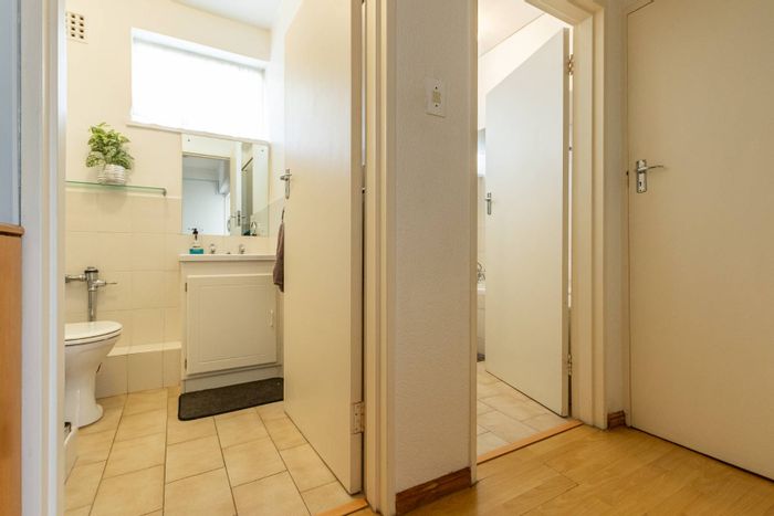 Morning-lit east-facing apartment with patio views of the Hottentot Holland Mountains in Claremont, open-plan living with American shutters, pool, gym and biometric access. 2 beds, 1.5 baths, 2 parking.