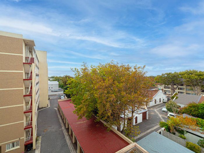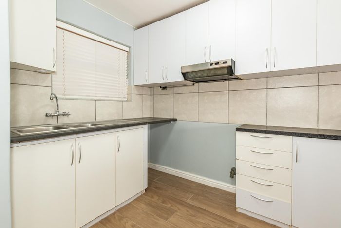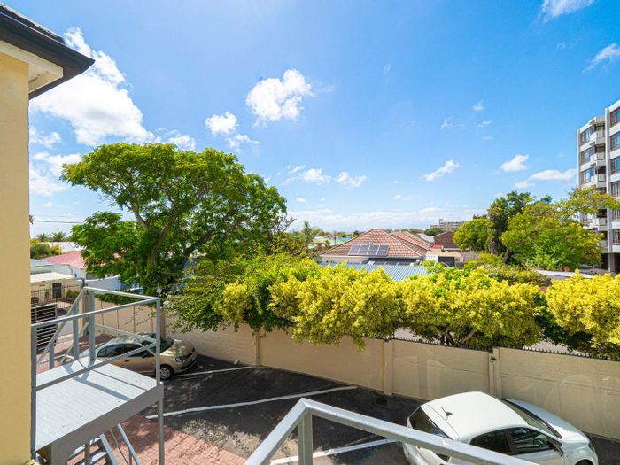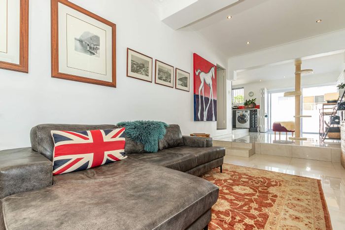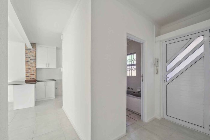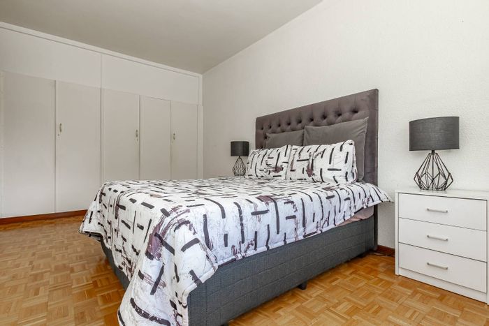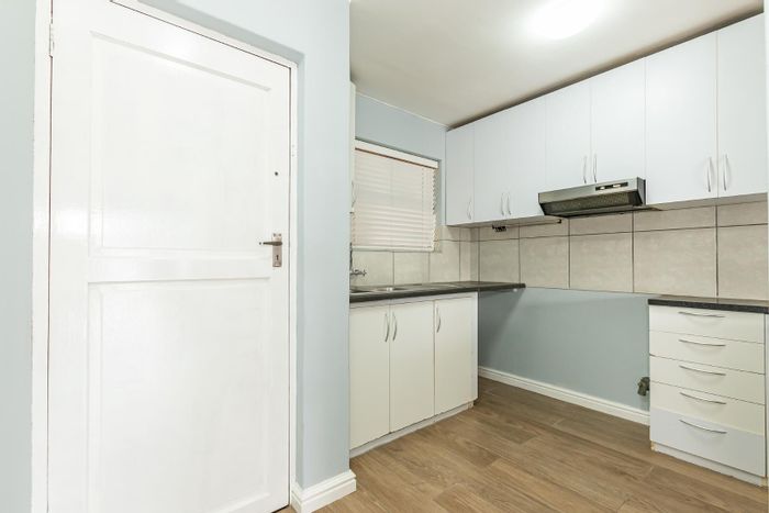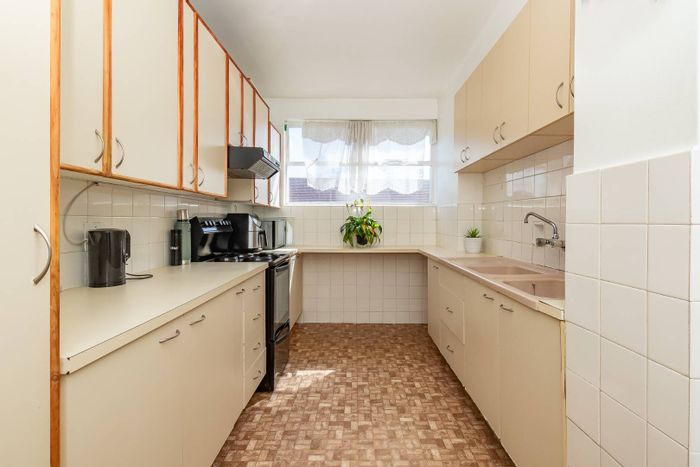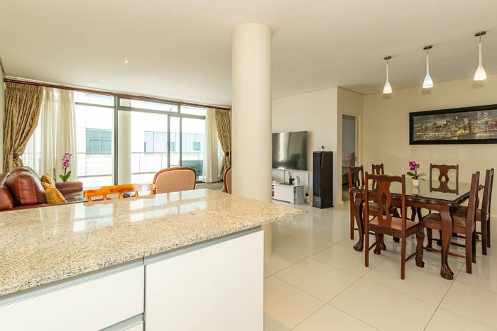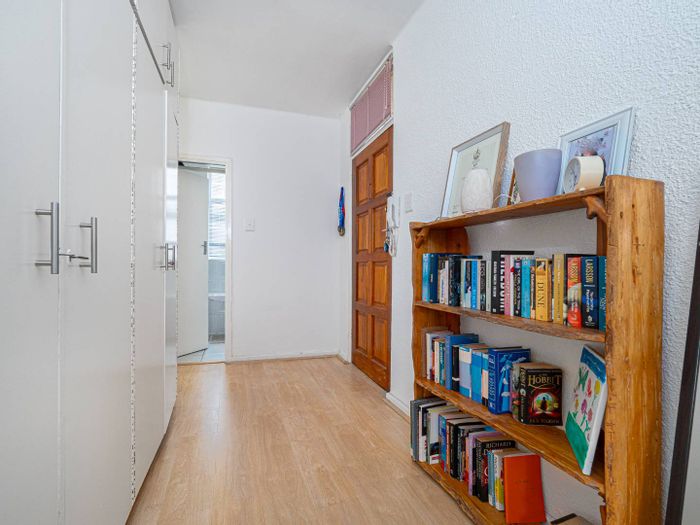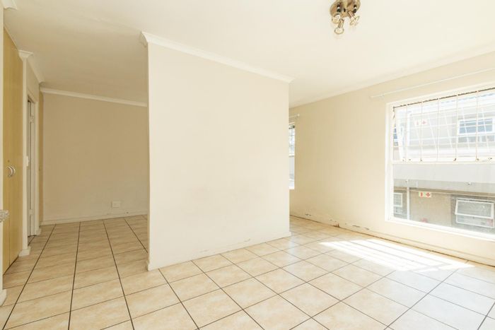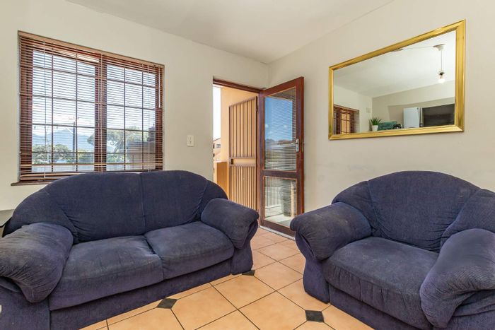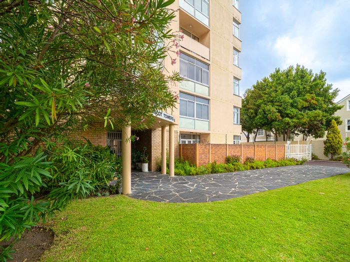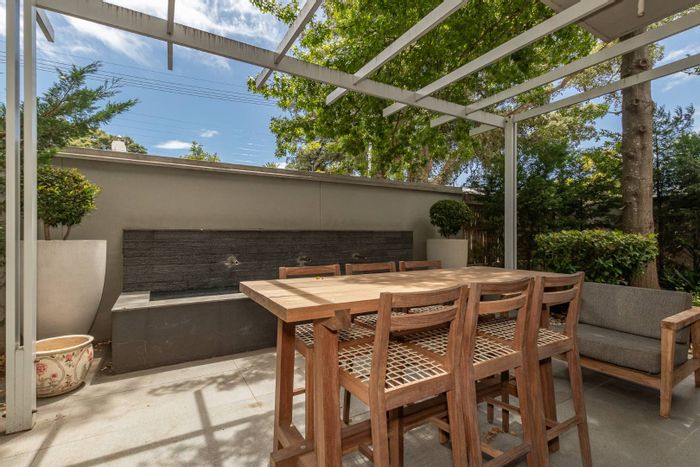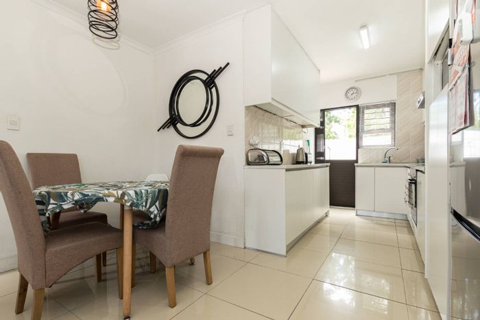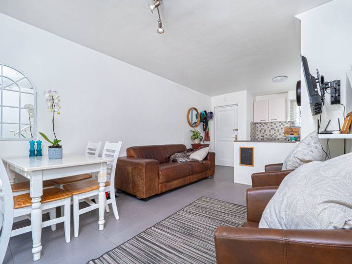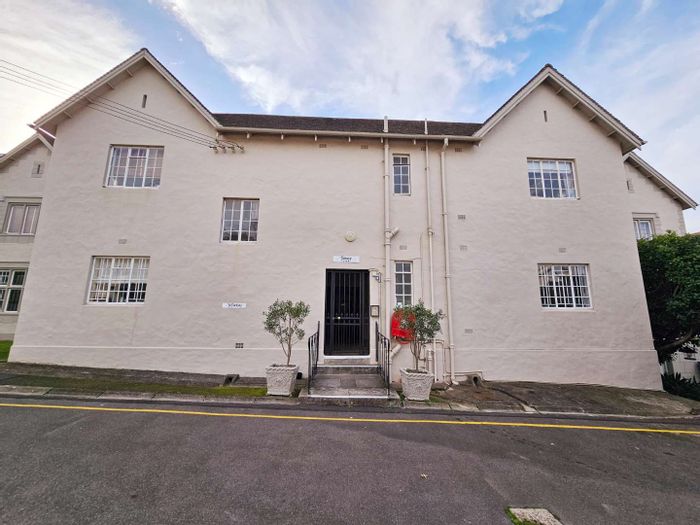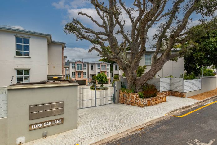 Morning-lit east-facing apartment with patio views of the Hottentot Holland Mountains in Claremont, open-plan living with American shutters, pool, gym and biometric access. 2 beds, 1.5 baths, 2 parking.