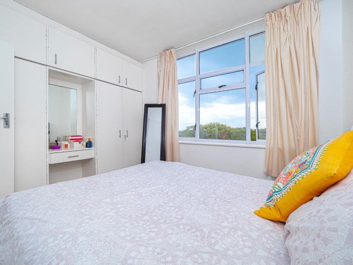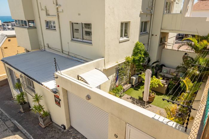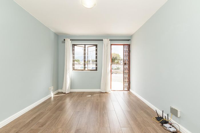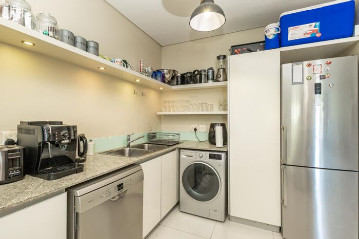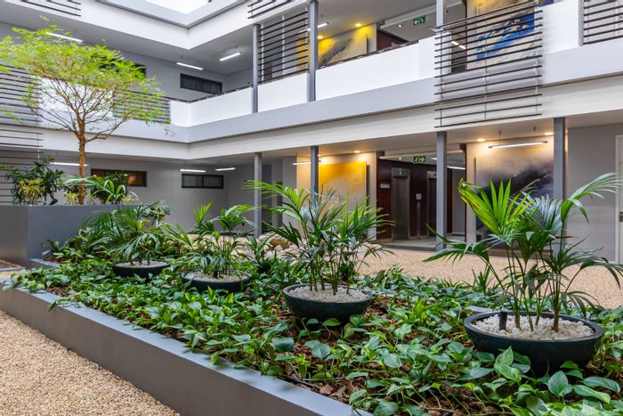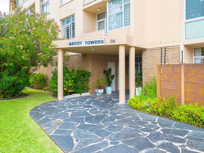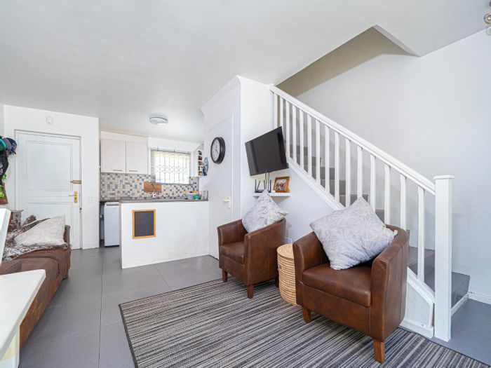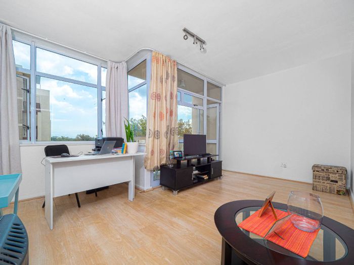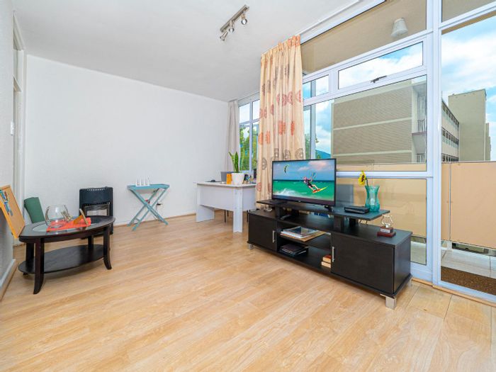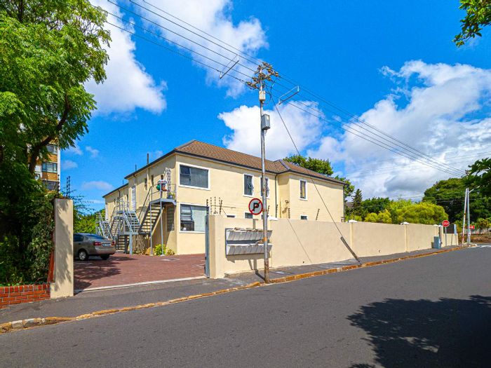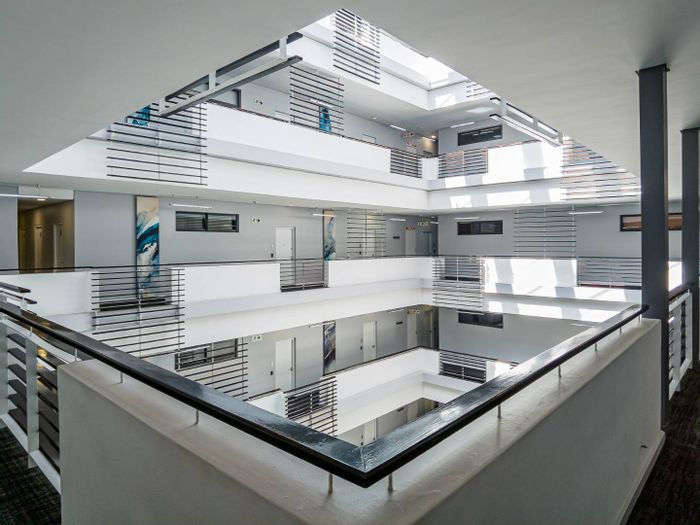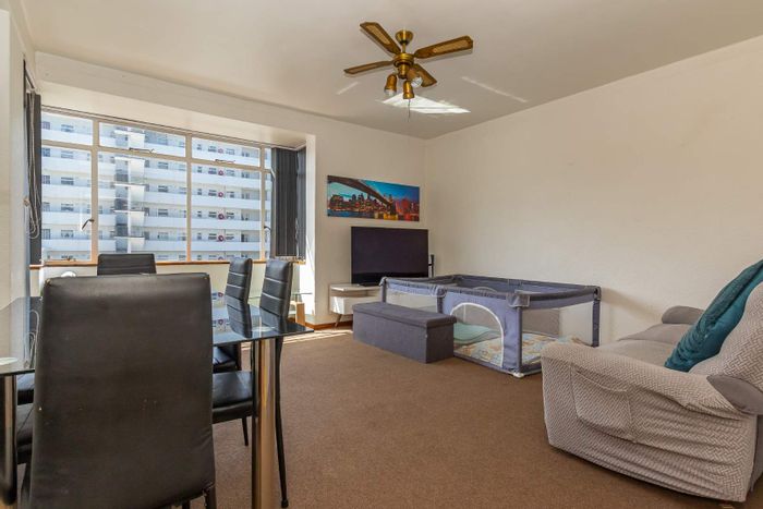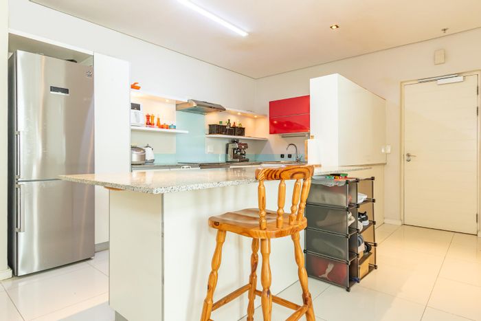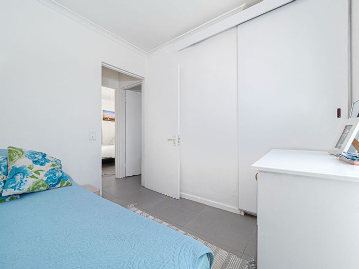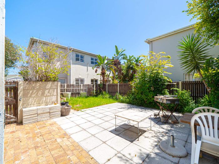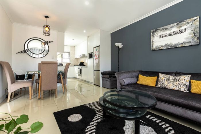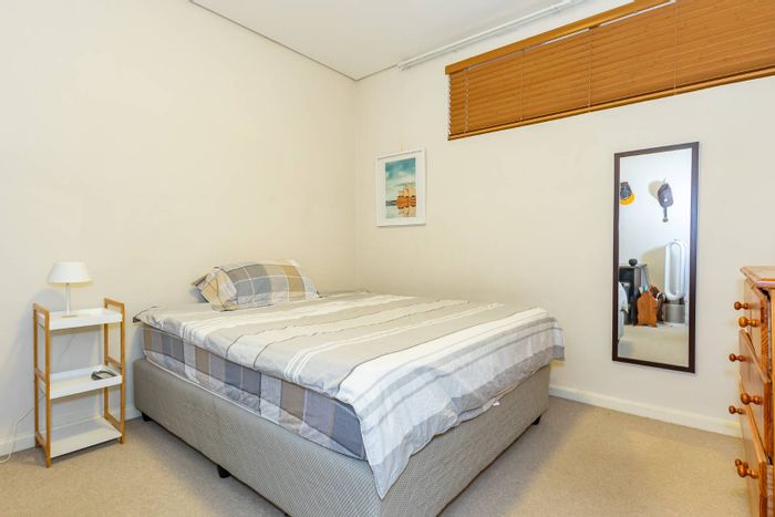 Morning-lit east-facing apartment with patio views of the Hottentot Holland Mountains in Claremont, open-plan living with American shutters, pool, gym and biometric access. 2 beds, 1.5 baths, 2 parking.