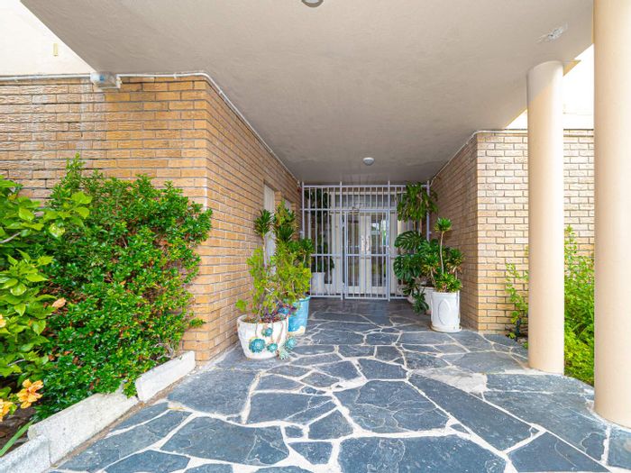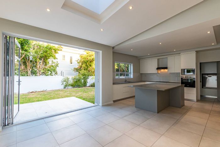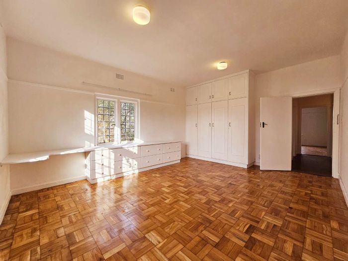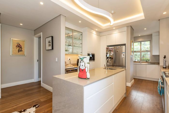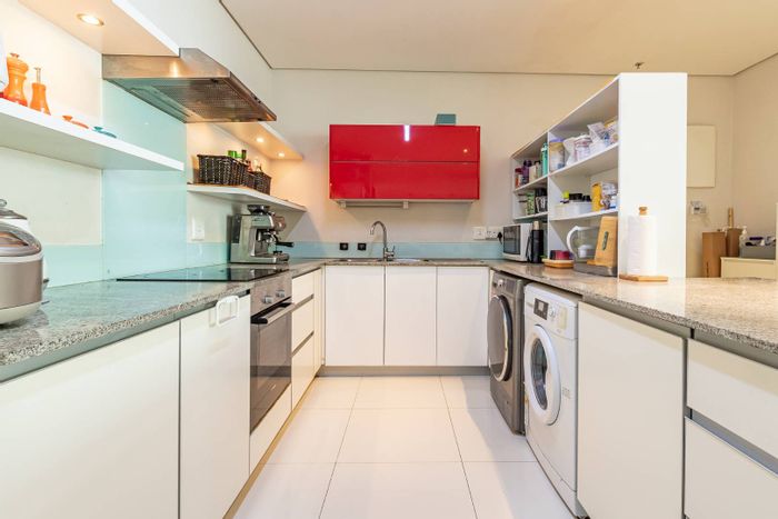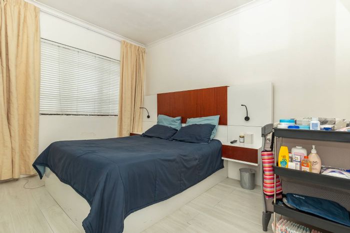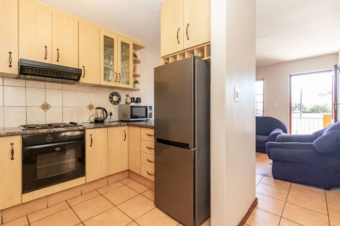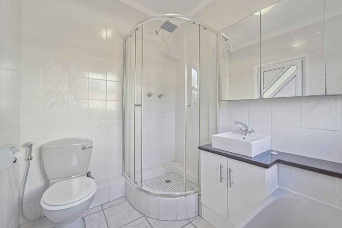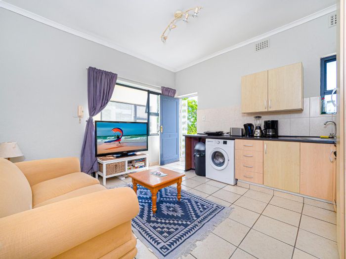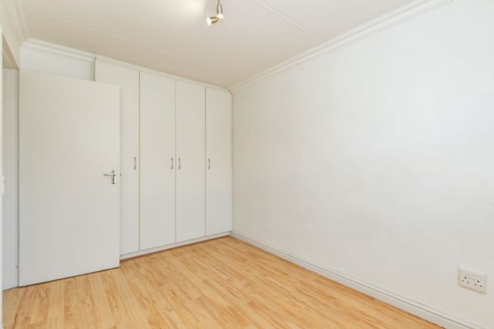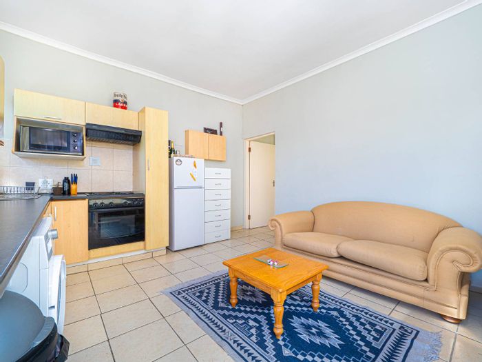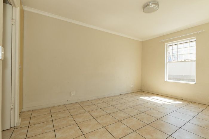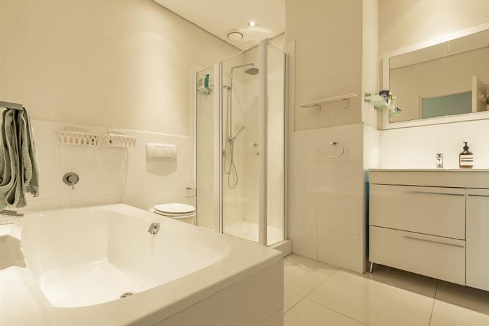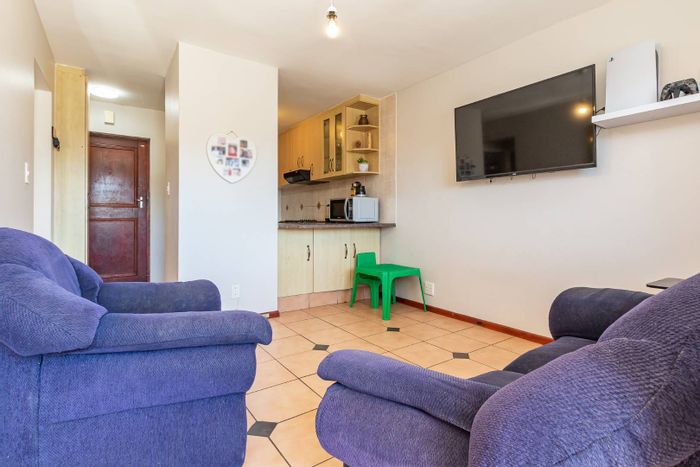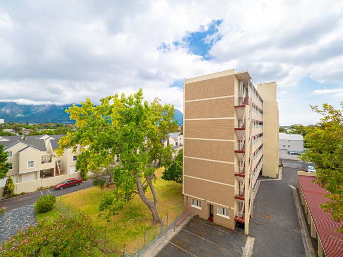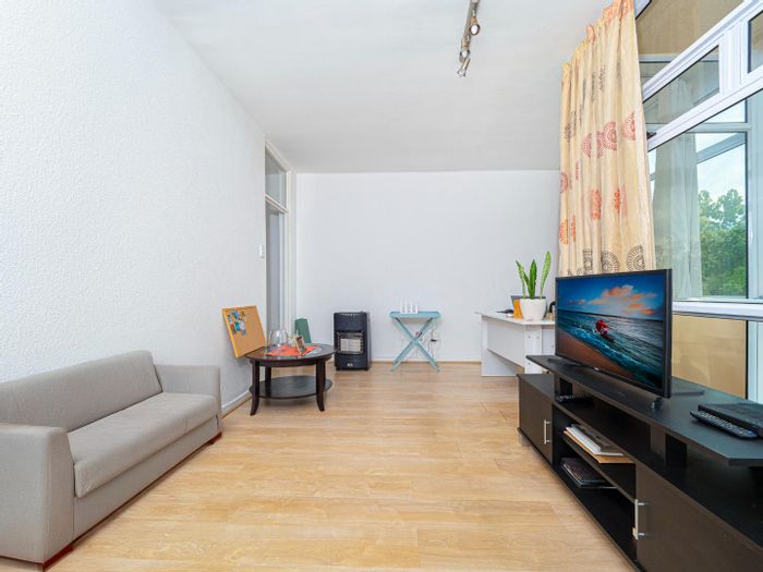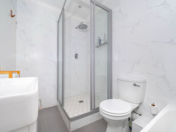 Morning-lit east-facing apartment with patio views of the Hottentot Holland Mountains in Claremont, open-plan living with American shutters, pool, gym and biometric access. 2 beds, 1.5 baths, 2 parking.