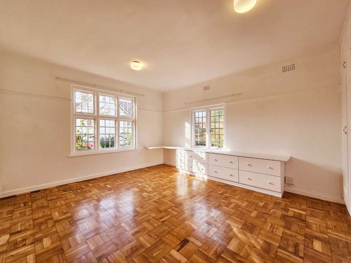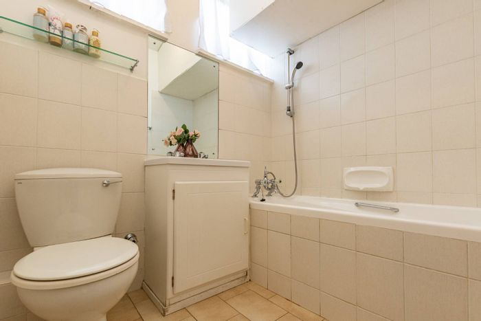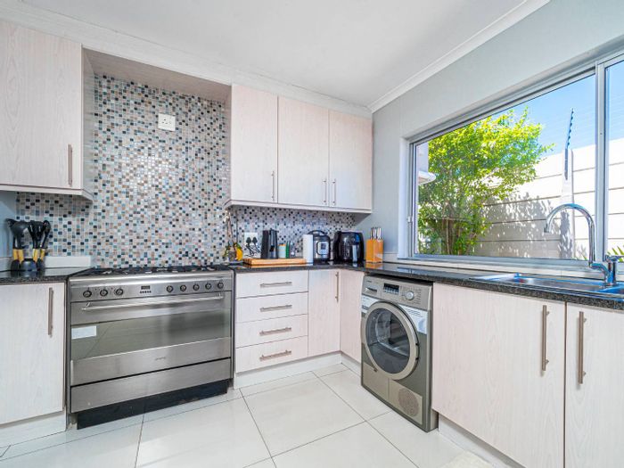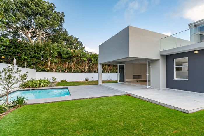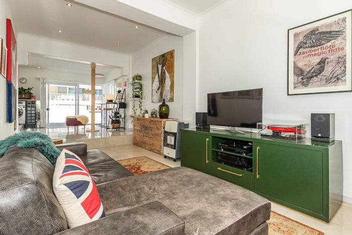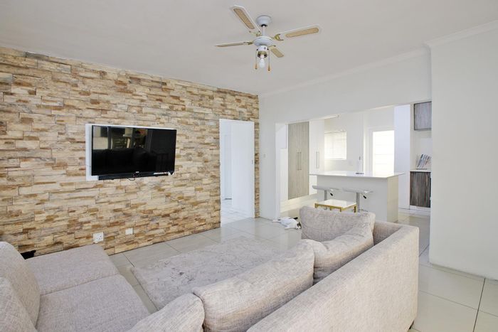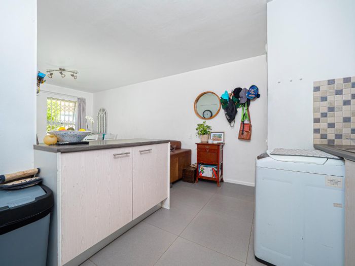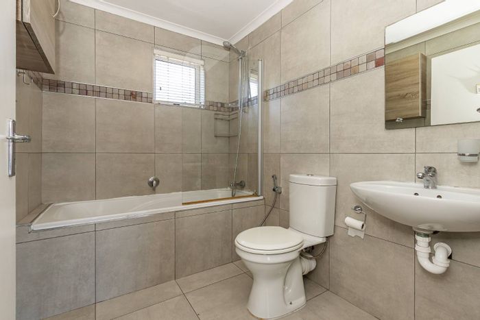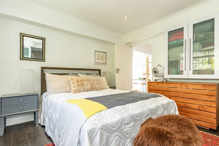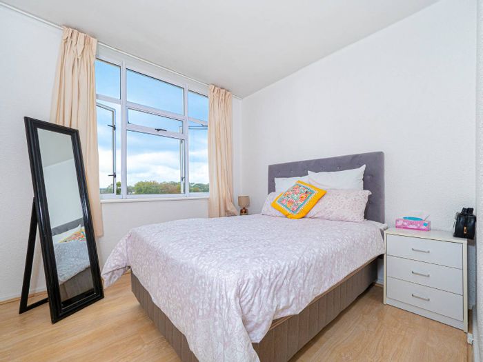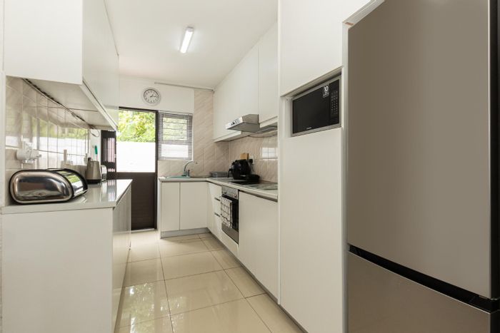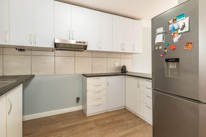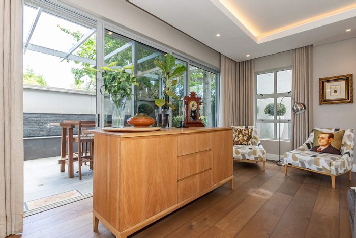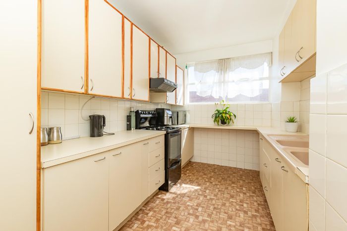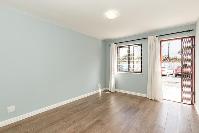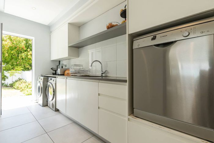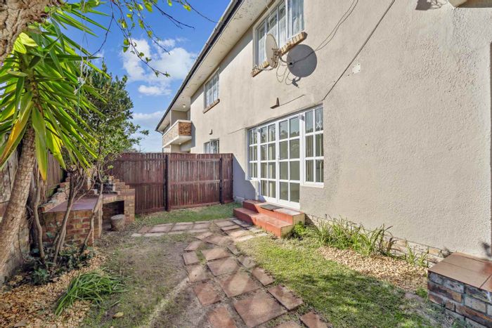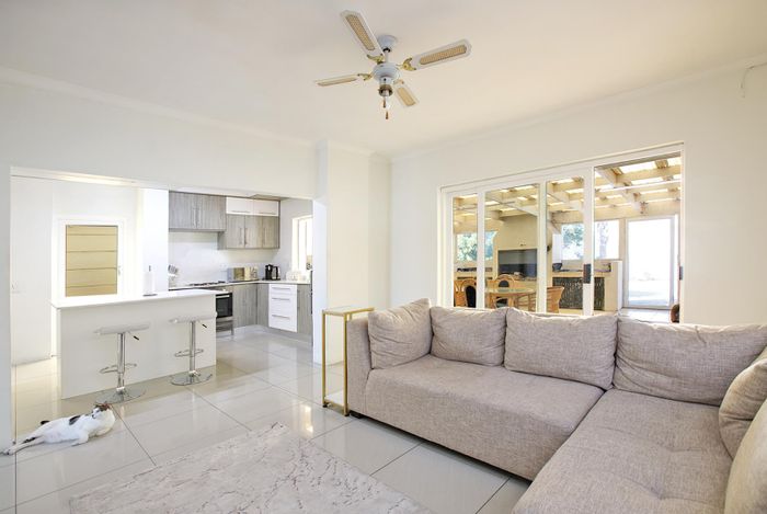 Morning-lit east-facing apartment with patio views of the Hottentot Holland Mountains in Claremont, open-plan living with American shutters, pool, gym and biometric access. 2 beds, 1.5 baths, 2 parking.