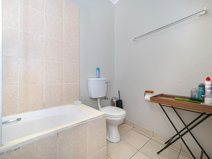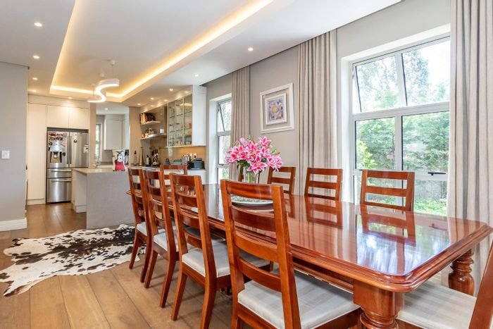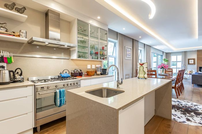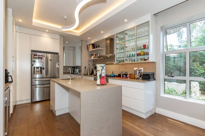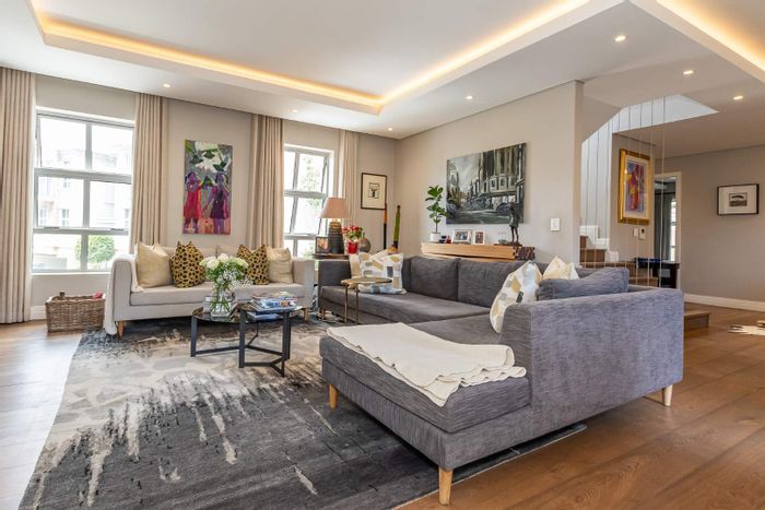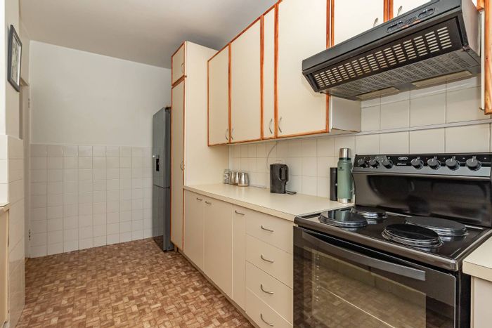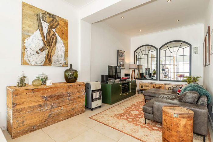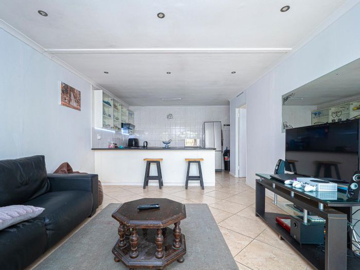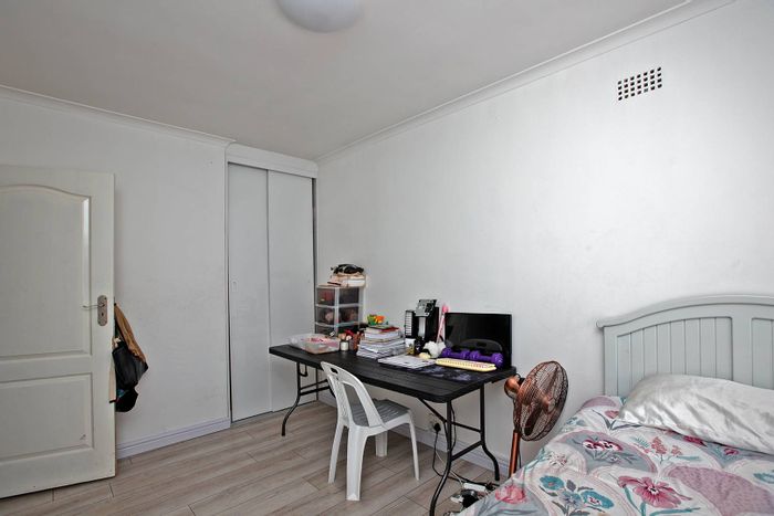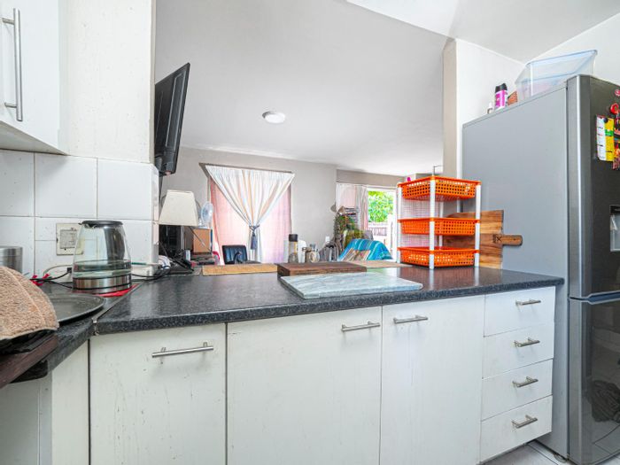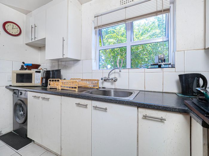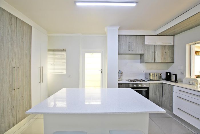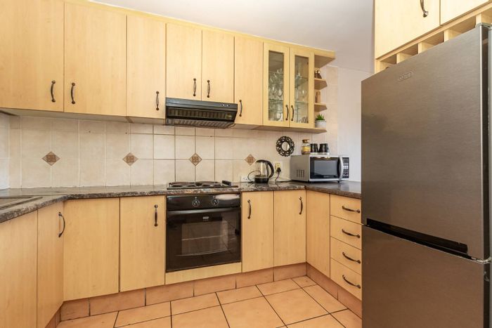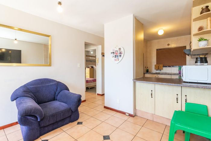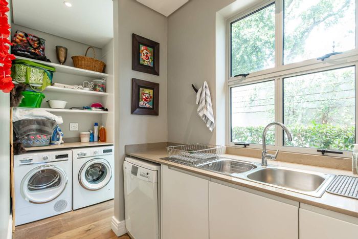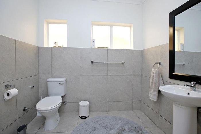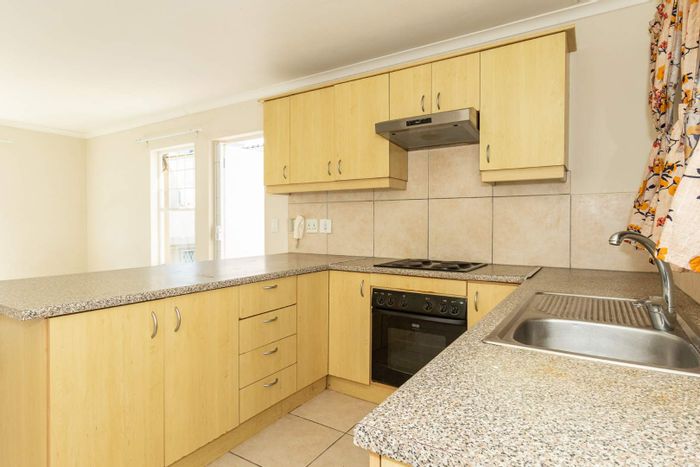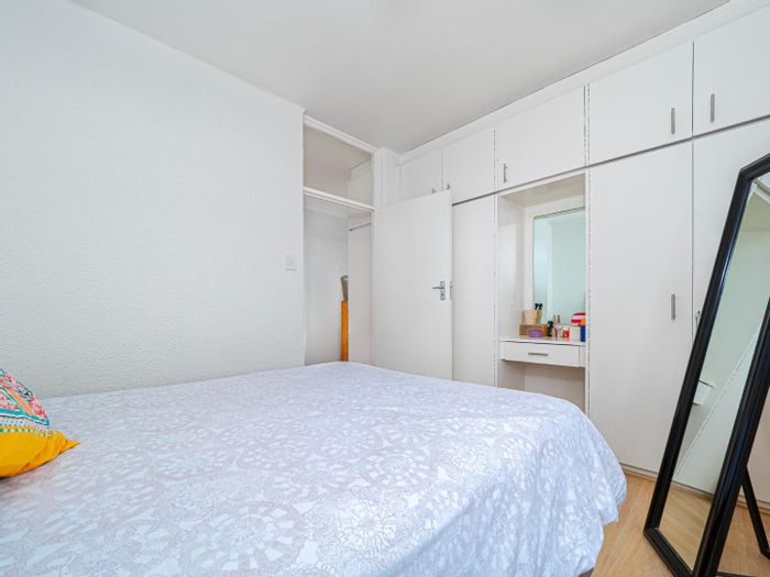 Morning-lit east-facing apartment with patio views of the Hottentot Holland Mountains in Claremont, open-plan living with American shutters, pool, gym and biometric access. 2 beds, 1.5 baths, 2 parking.