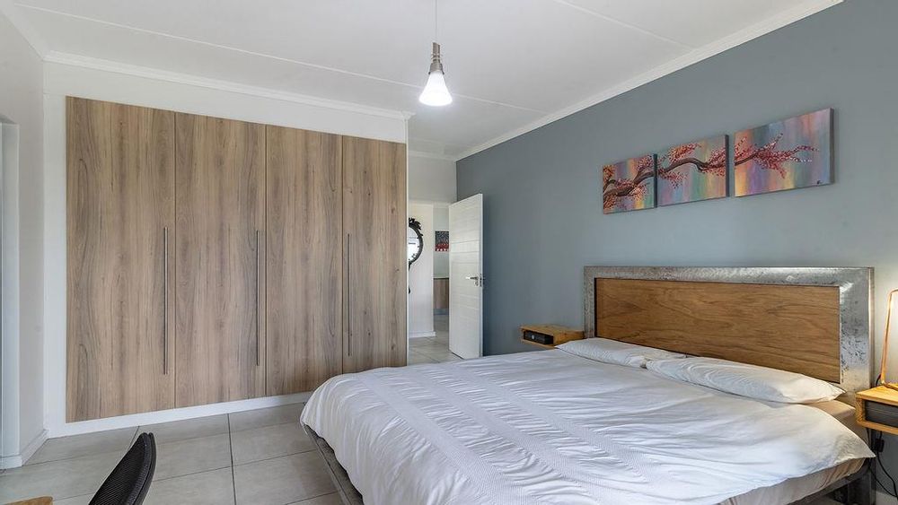 The spacious guest bedroom has tiled floors and built-in cupboards.