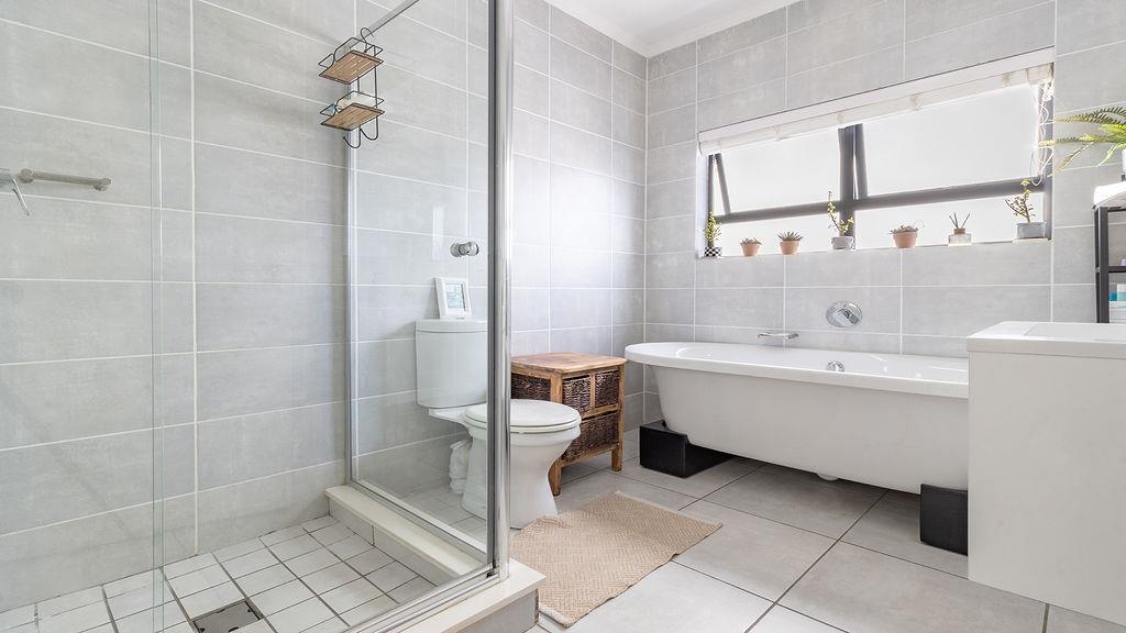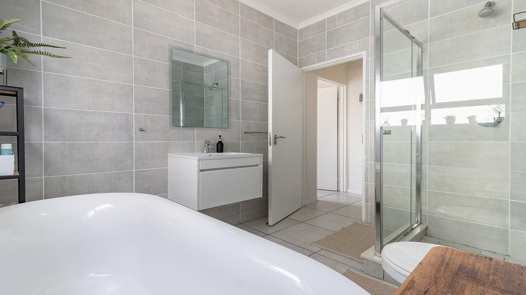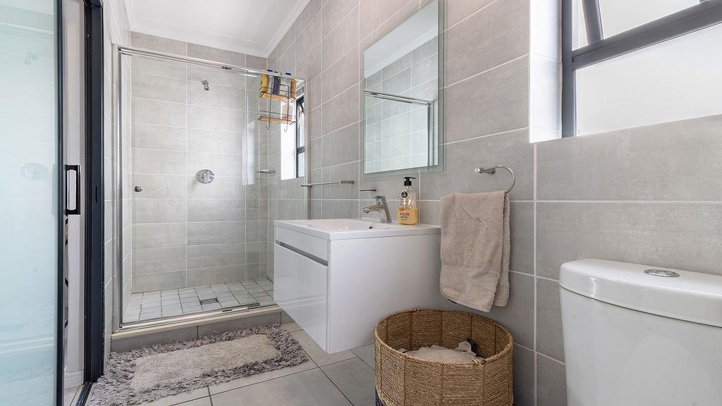 The main bedroom has built-in cupboards and a naturally ventilated en-suite bathroom with a sliding door and a mirror. It consists of a shower, basin with vanity and cabinet, and a toilet.