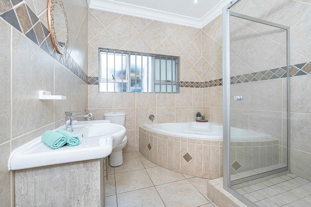 The other 2 bedrooms are spacious, tiled with built in cupboards blinds and trellis. Two of the bathrooms have spa baths, showers and is fully tiled.