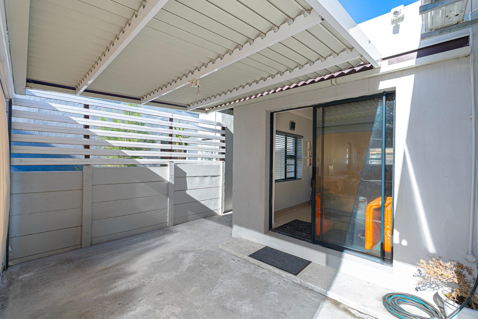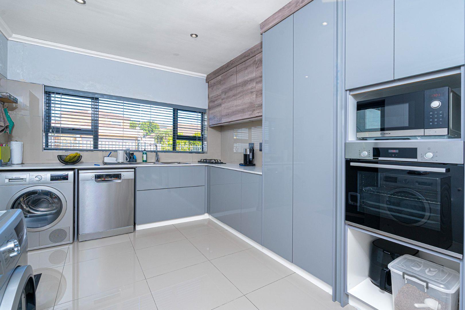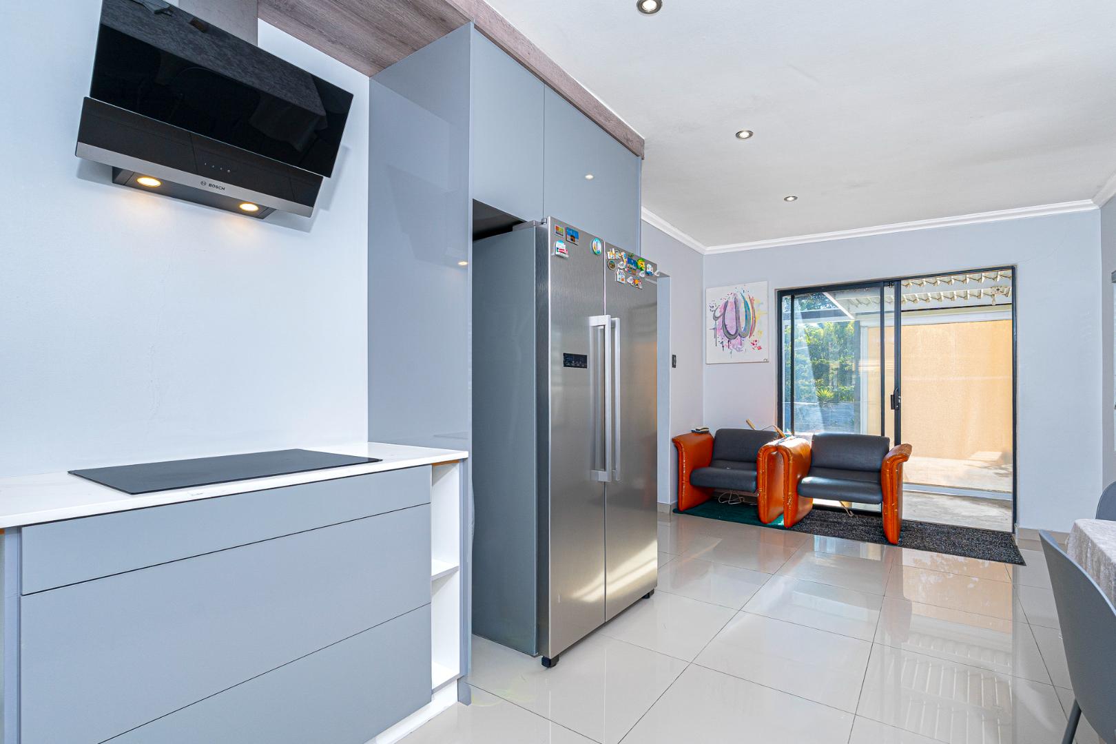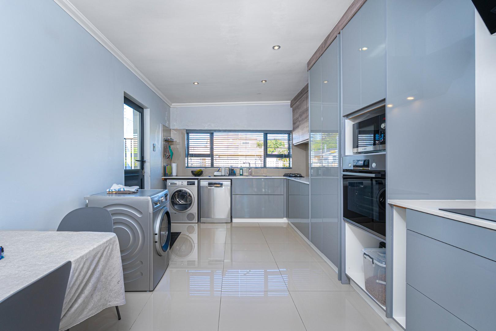 The two tone kitchen is fully fitted and functional, its brand new modern and eye catching. Space for a double door fridge, plumbing for 2 appliances and gas and an eyelevel oven. Sliding door leading from the kitchen to the undercover courtyard with flexible aluminum louvers .