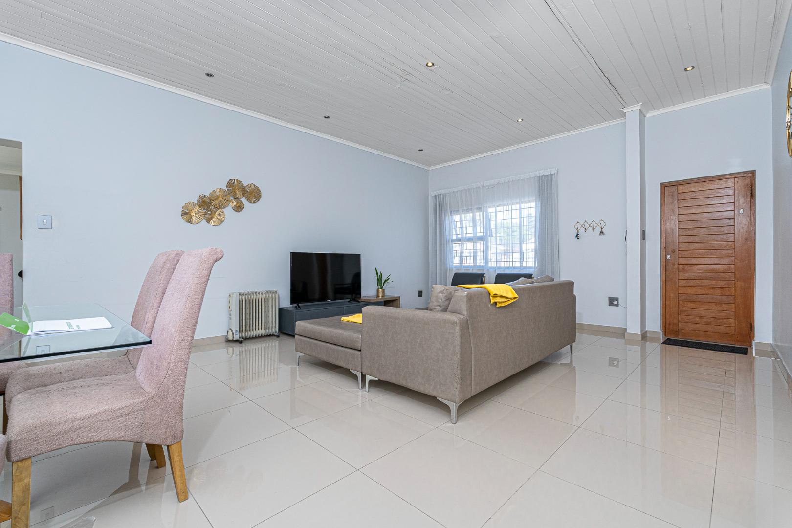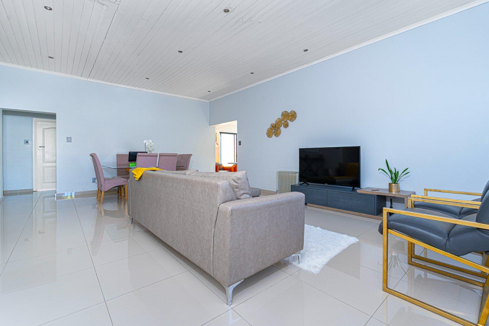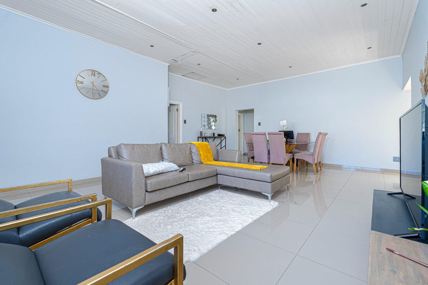 Porcelain tiles throughout the lounge and dining area into the kitchen.