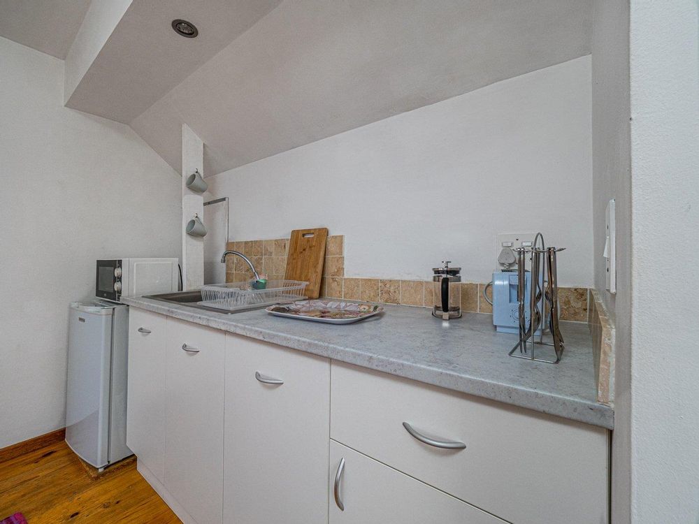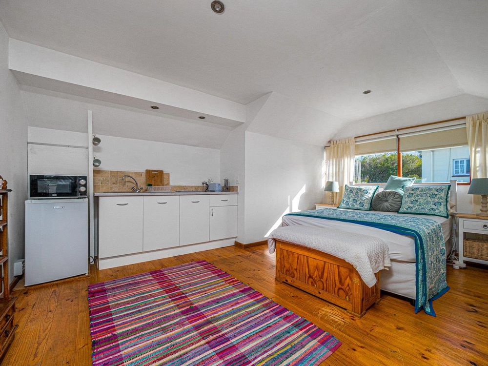 Staircase leading to the one-bedroom flat upstairs, ample storage space, open plan lounge, dining room with a kitchenette and bedroom. There is also a bathroom with shower, toilet and basin.