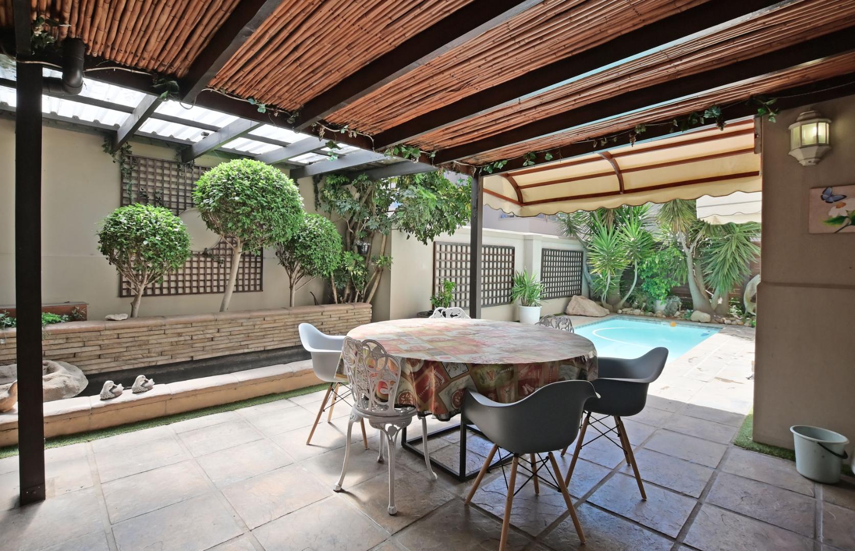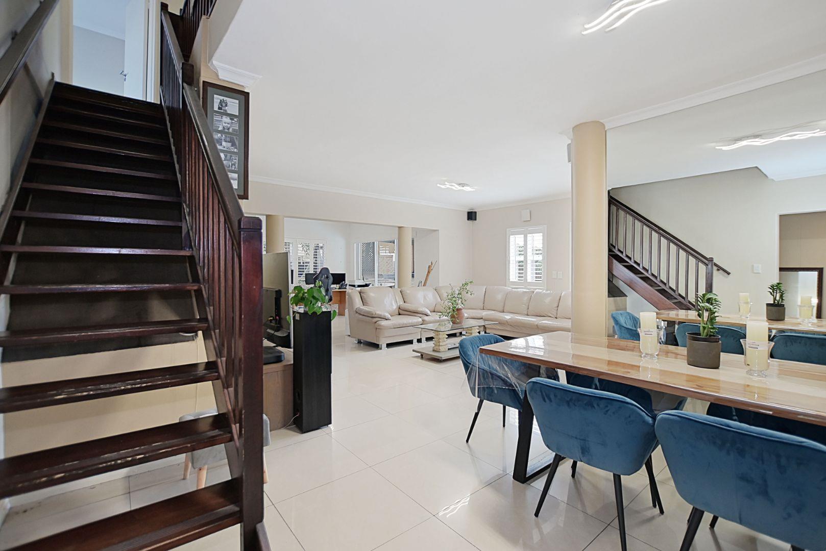The upgraded kitchen flows seamlessly into three reception areas, with a fireplace creating a warm focal point for relaxed living. The lounge opens onto a generous covered patio, overlooking a sparkling pool and a koi pond (currently empty), ready to be revived or reimagined.